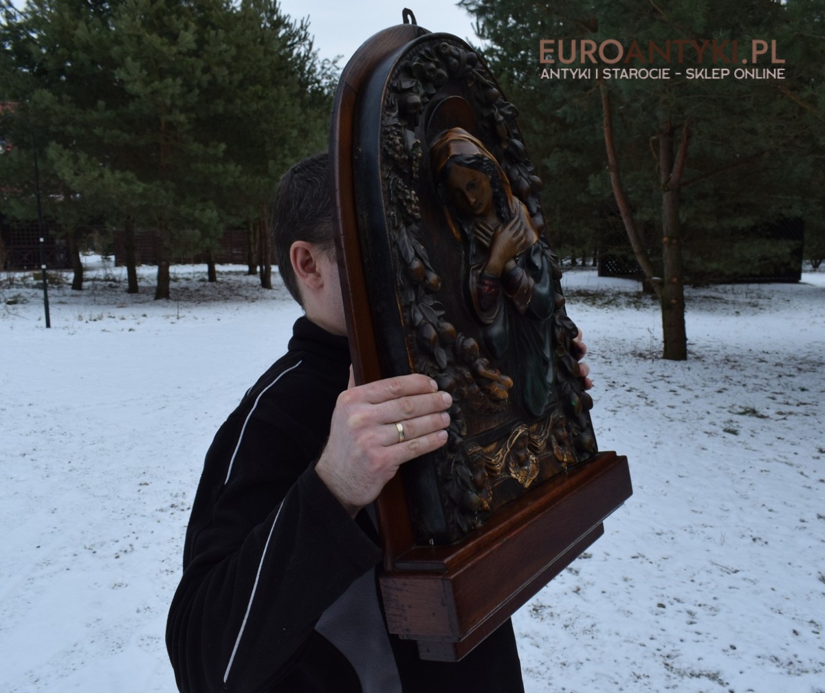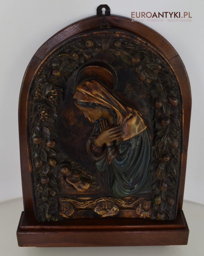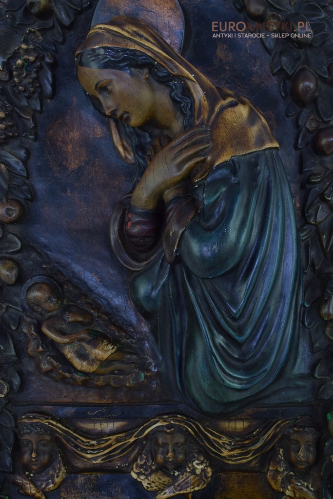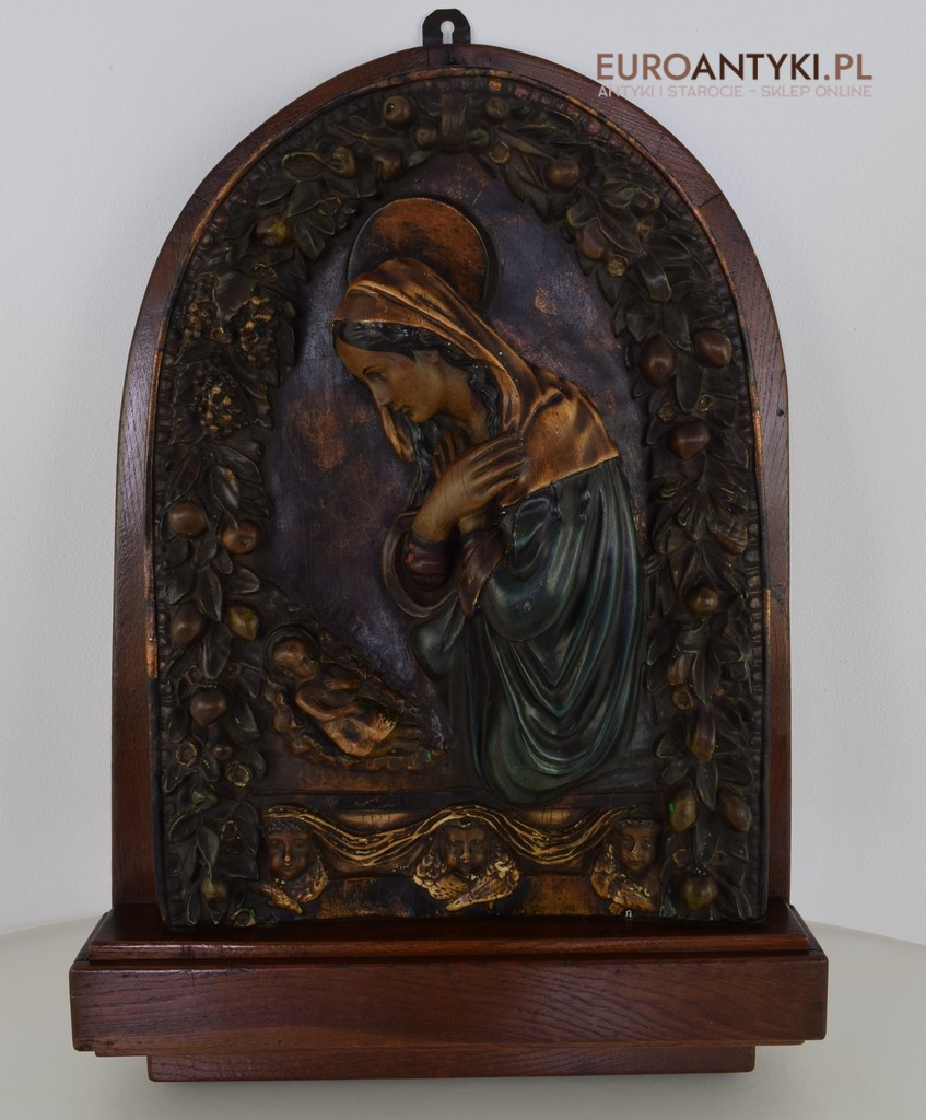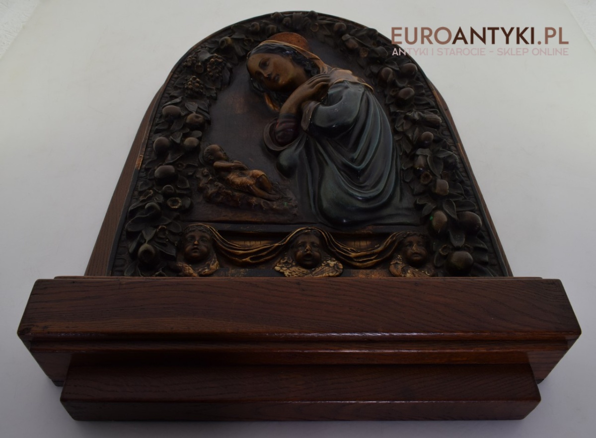 Przedstawiony obiekt to antyczna figurka dewocjonalna z Matką Boską, sprowadzona z Francji. Poochodzi z połowy XX wieku, utrzymana w stylu neorenesansowym, który był popularny na przełomie XIX i XX wieku. Styl ten cechuje się dostojnością, bogactwem ornamentów i głębokim wyrazem duchowym. Tego rodzaju rzeźby zdobiły niegdyś domowe ołtarzyki, kaplice i kościoły, dziś stanowią niezwykle cenione dekoracje w kolekcjach antyków i we wnętrzach o klasycznym charakterze.