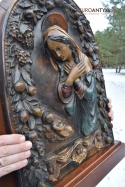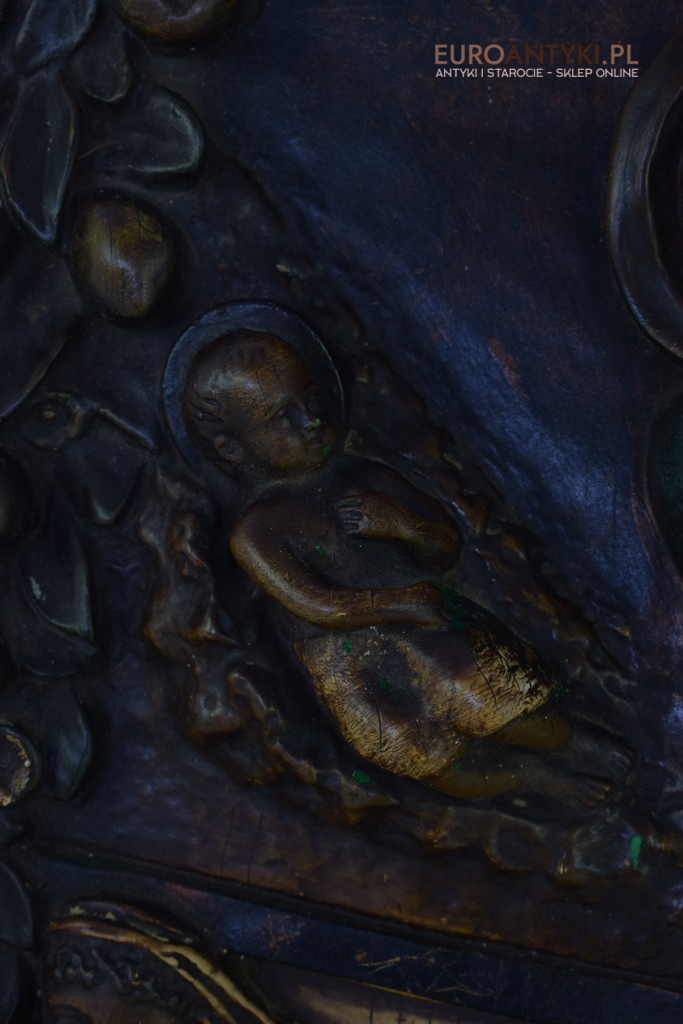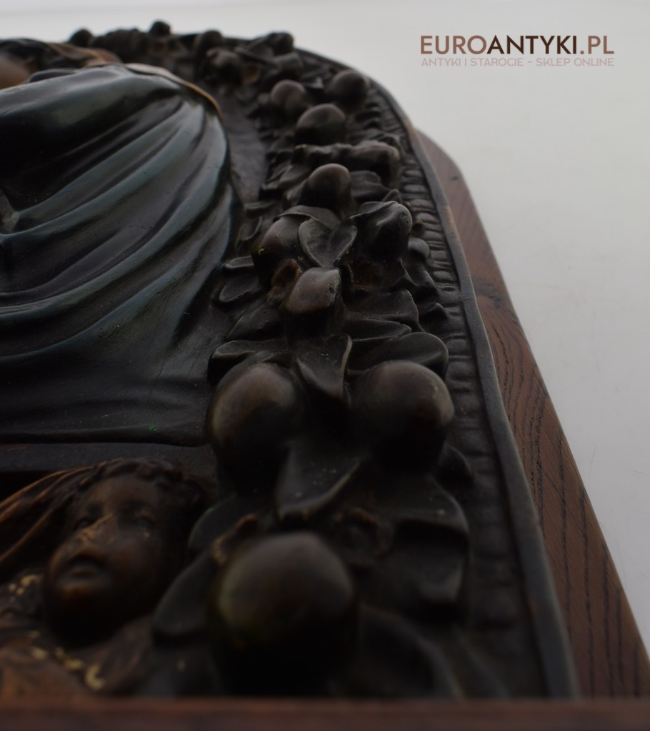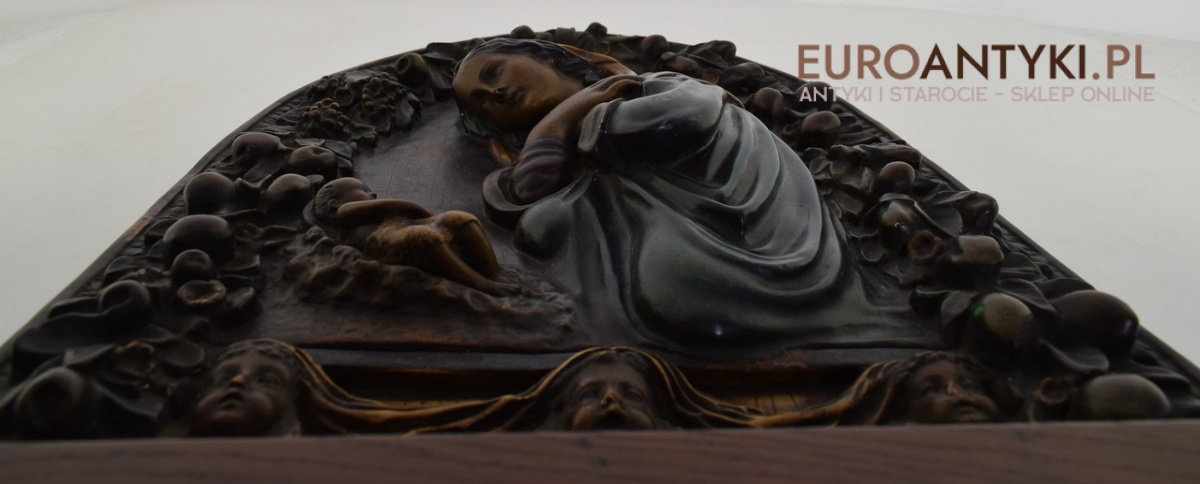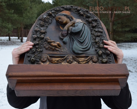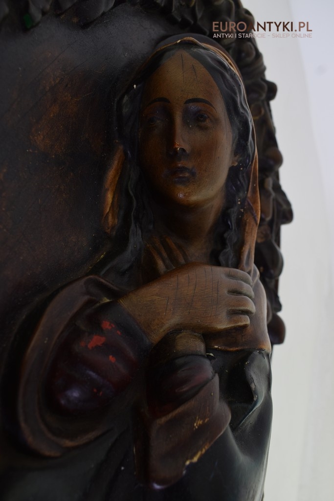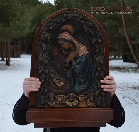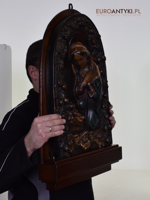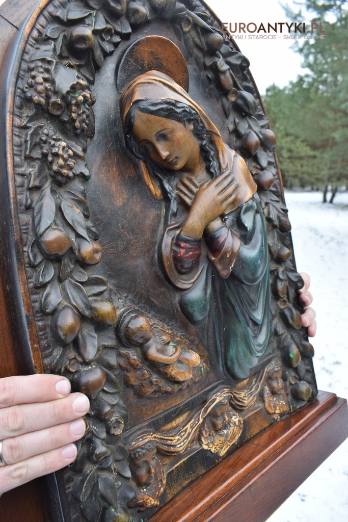 Przedstawiony obiekt to antyczna figurka dewocjonalna z Matką Boską, sprowadzona z Francji. Poochodzi z połowy XX wieku, utrzymana w stylu neorenesansowym, który był popularny na przełomie XIX i XX wieku. Styl ten cechuje się dostojnością, bogactwem ornamentów i głębokim wyrazem duchowym. Tego rodzaju rzeźby zdobiły niegdyś domowe ołtarzyki, kaplice i kościoły, dziś stanowią niezwykle cenione dekoracje w kolekcjach antyków i we wnętrzach o klasycznym charakterze.