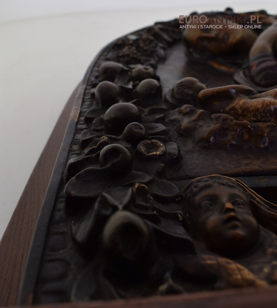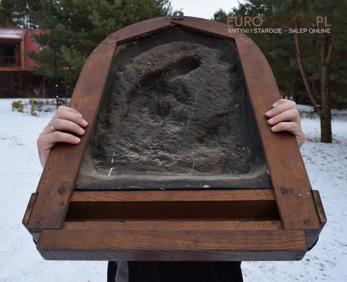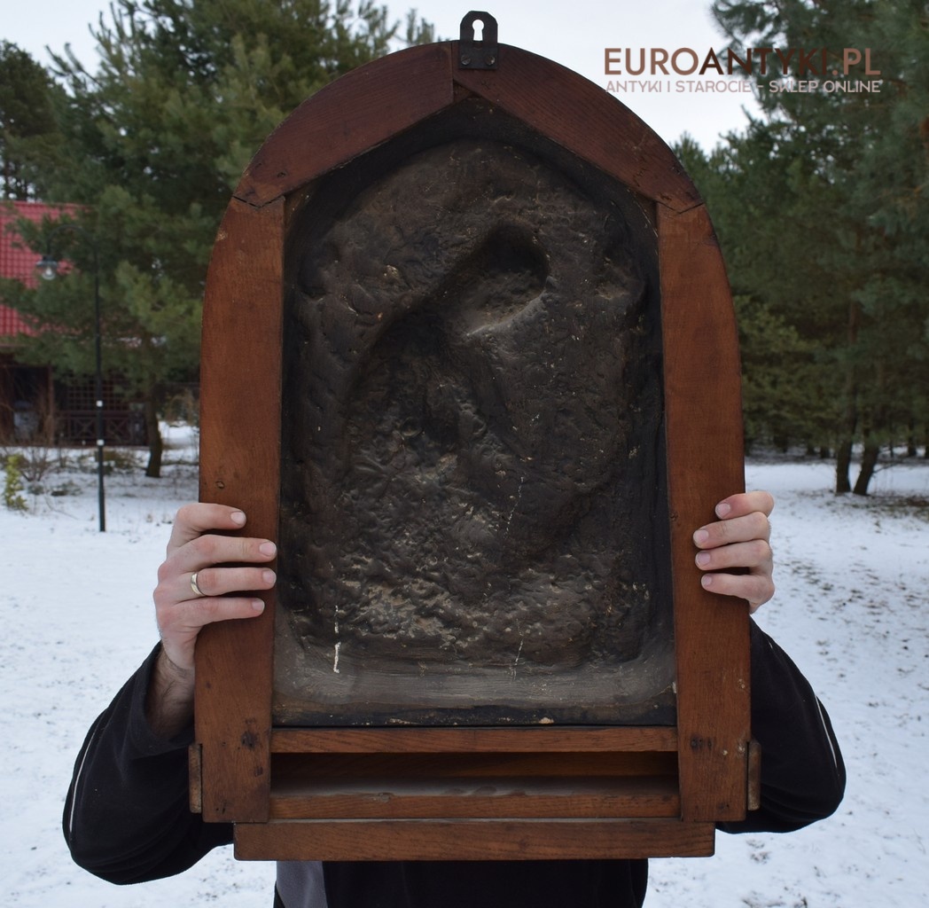 Figurka wykonana została z gipsu i osadzona w solidnej dębowej ramie – typowym połączeniu dla francuskich dewocjonaliów z przełomu wieków. Dzięki dużym wymiarom (aż 70 cm wysokości!) mogła pełnić funkcję centralnej dekoracji w kaplicy lub salonie. Doskonale oddaje atmosferę pobożności i elegancji epoki Belle Époque, a jej zachowany stan czyni ją prawdziwym rarytasem.