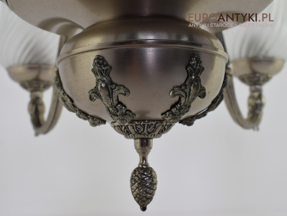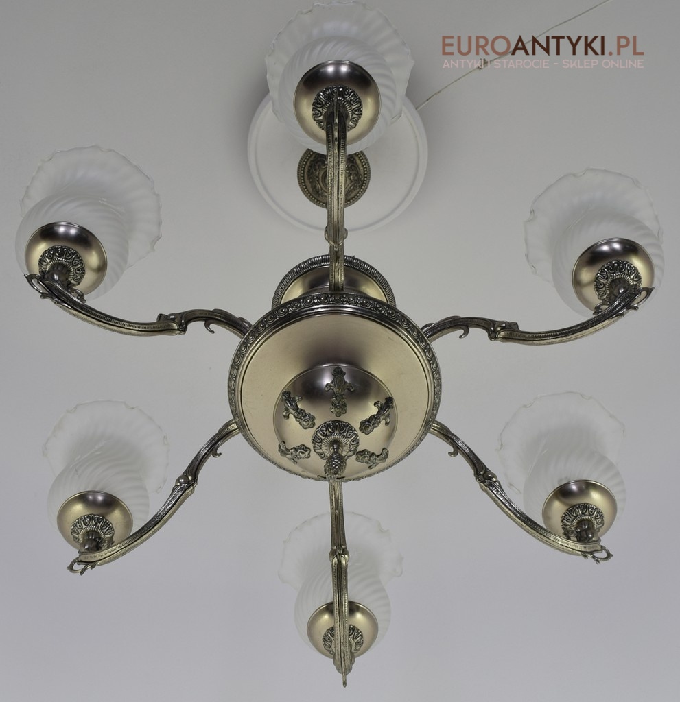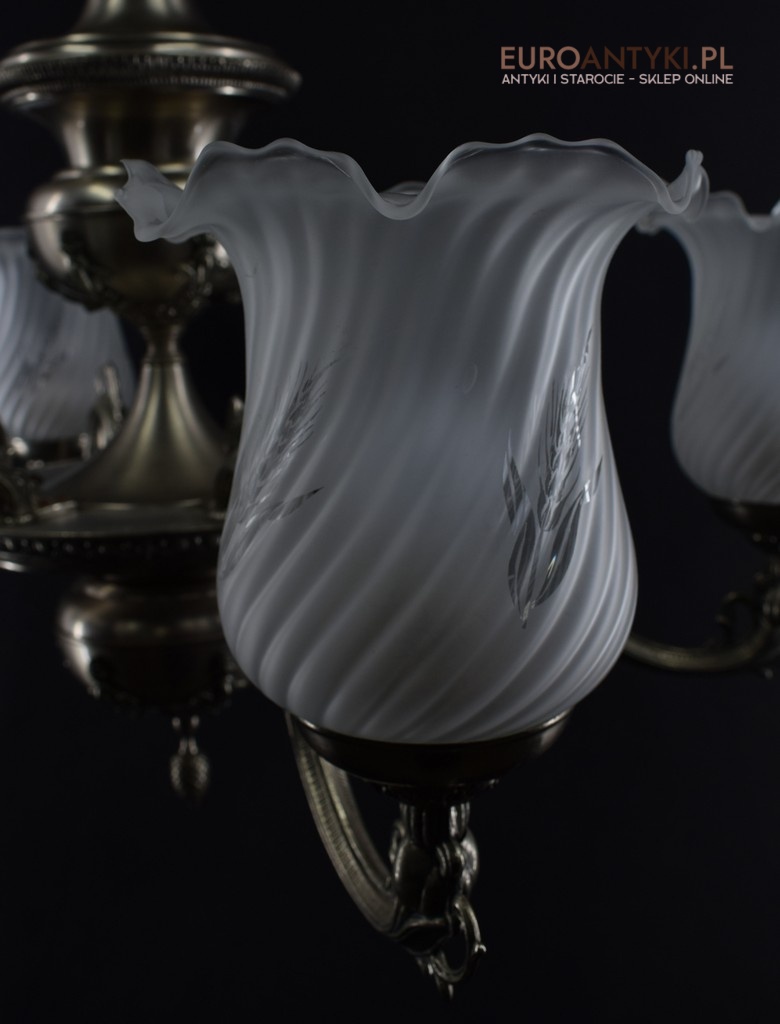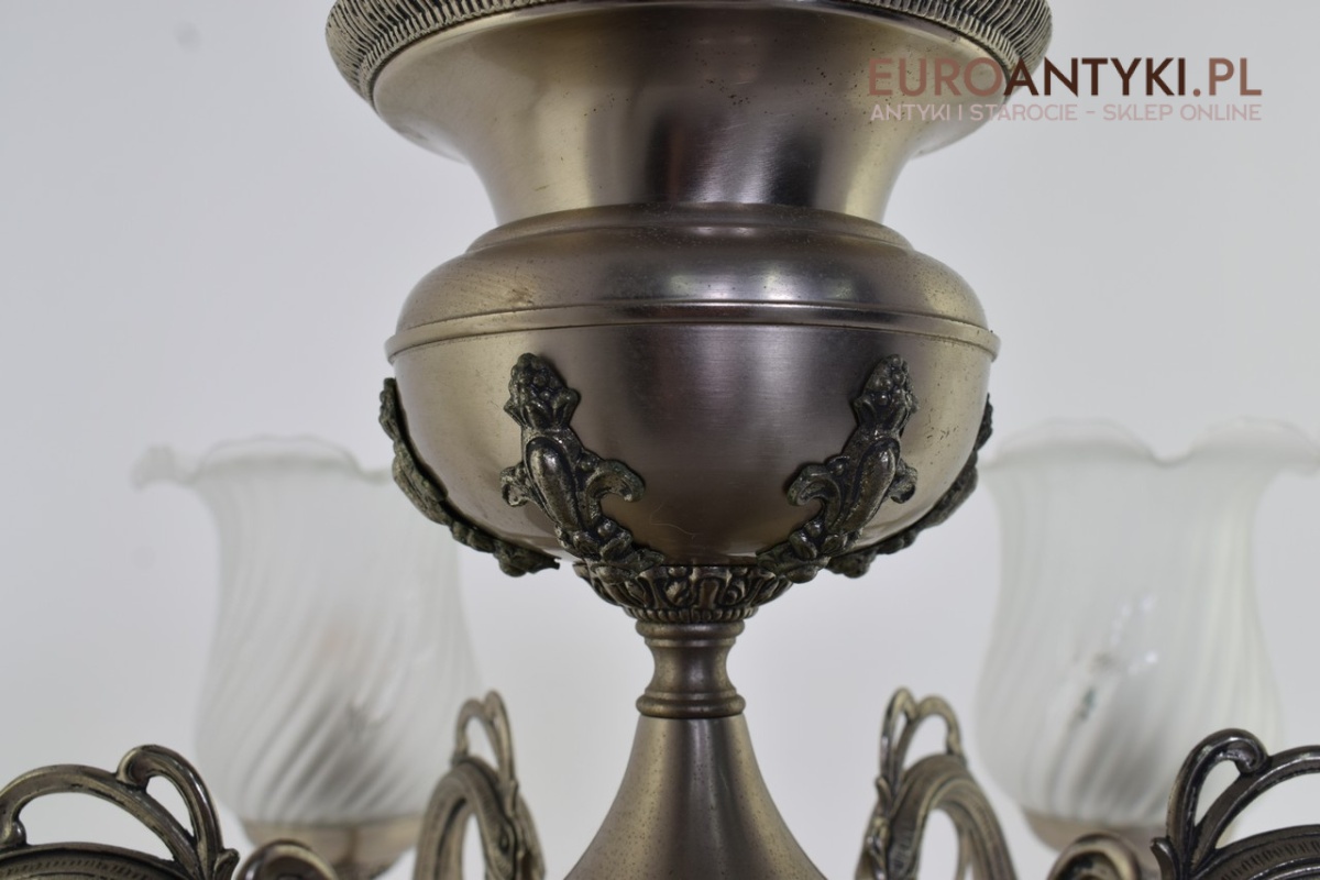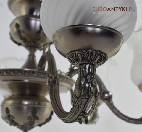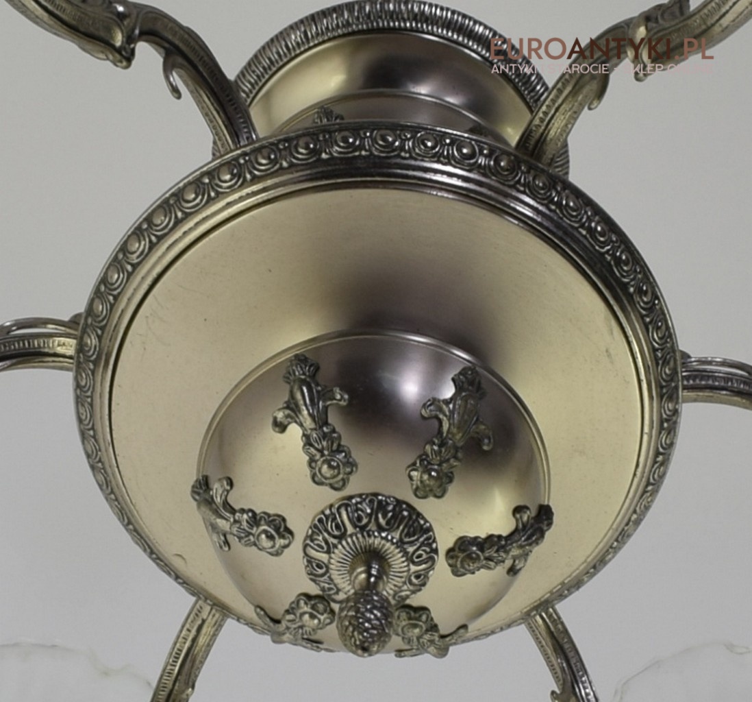 Duży starodawny srebrny żyrandol z kloszami w stylu Empire.
