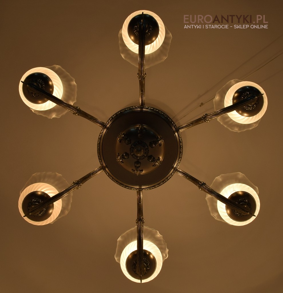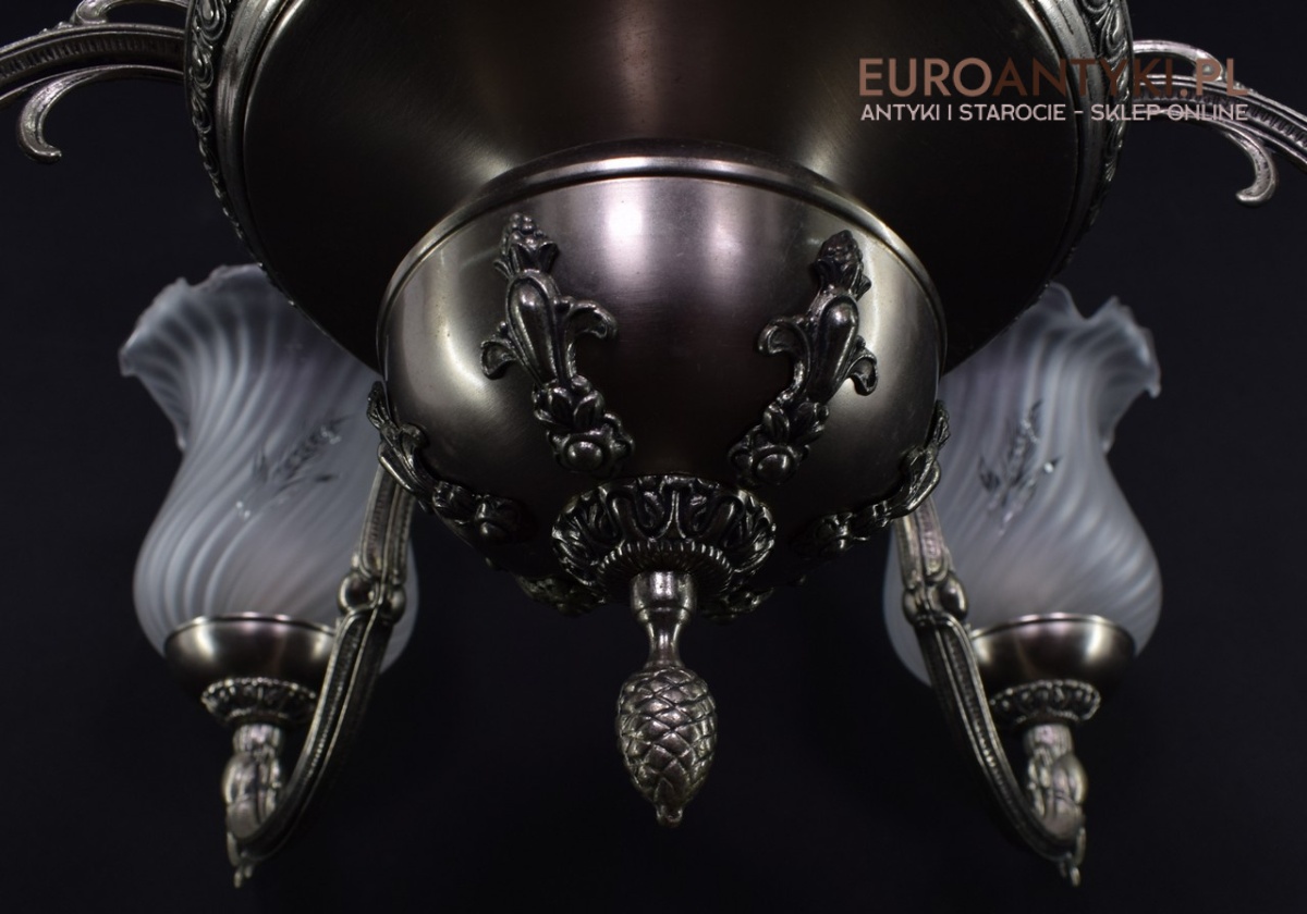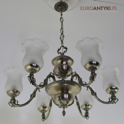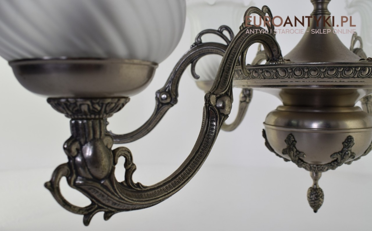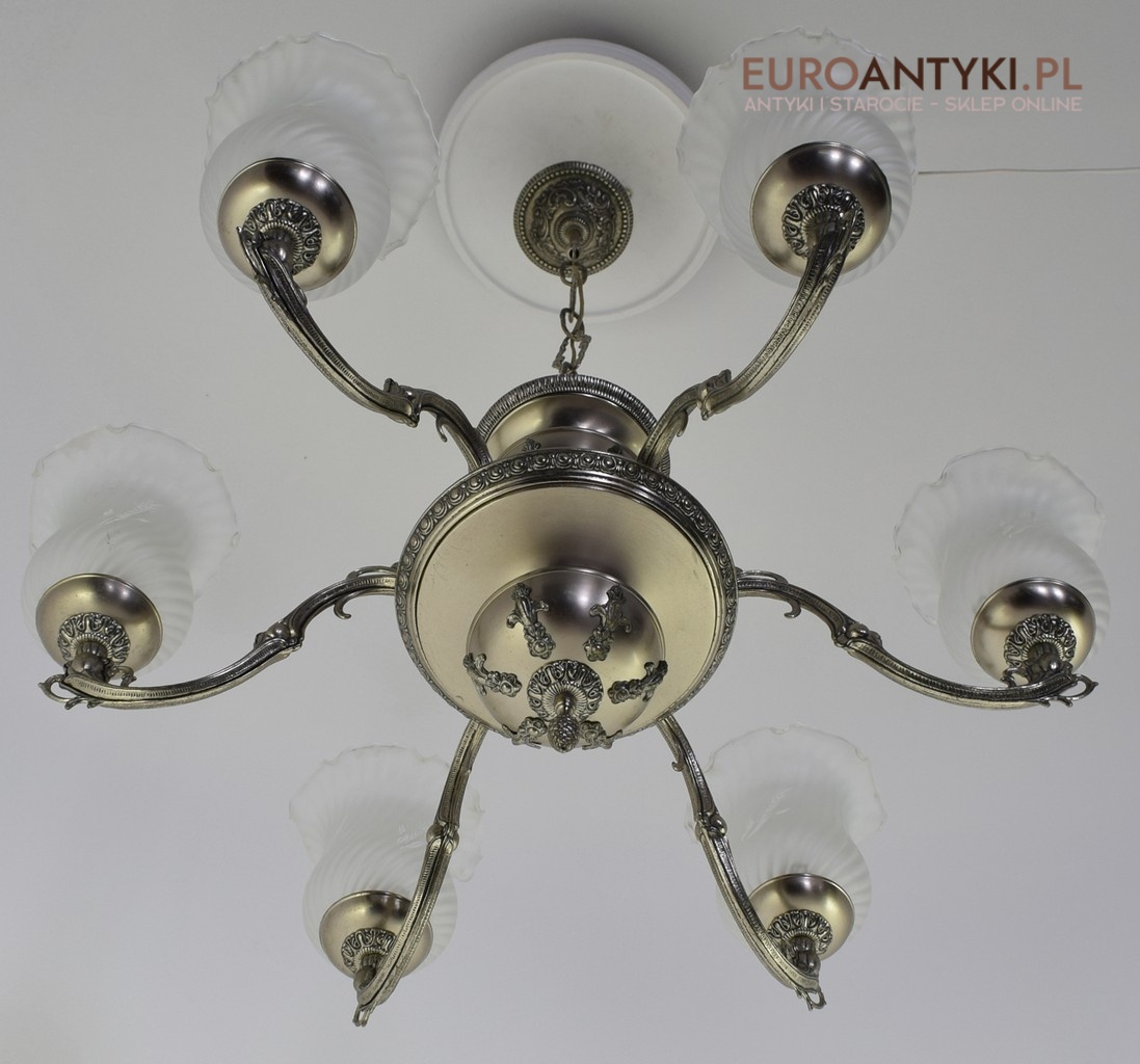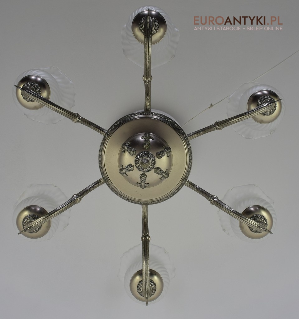 Duży starodawny srebrny żyrandol z kloszami w stylu Empire.