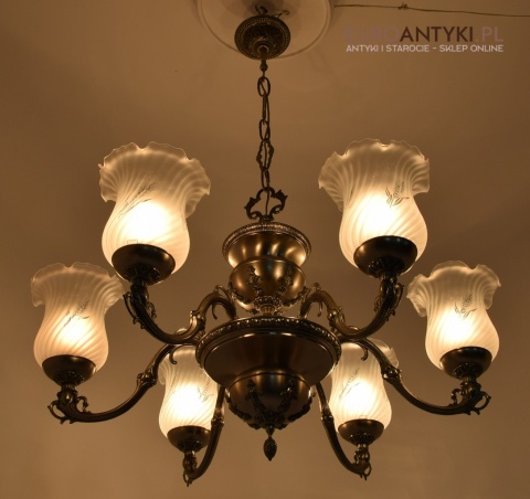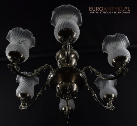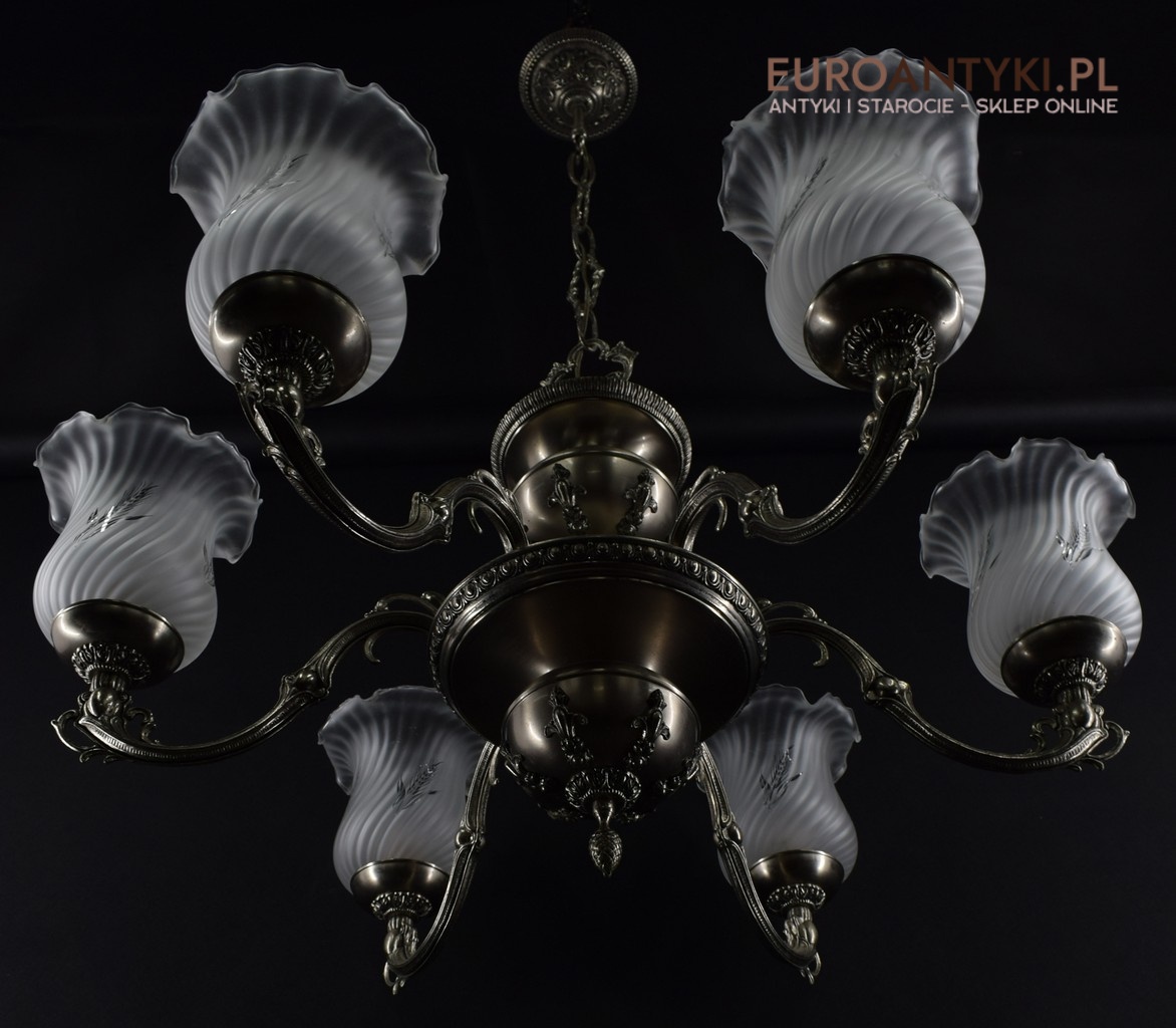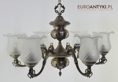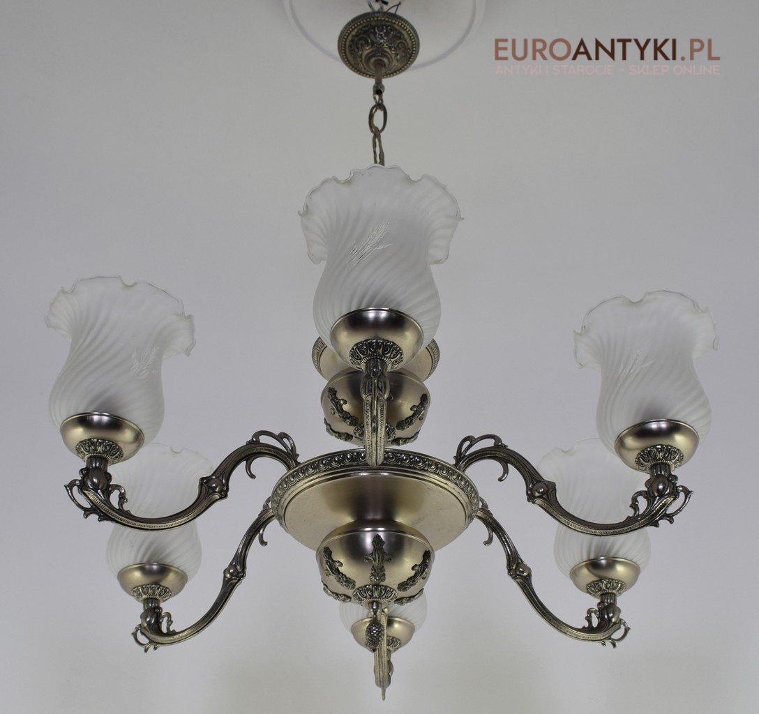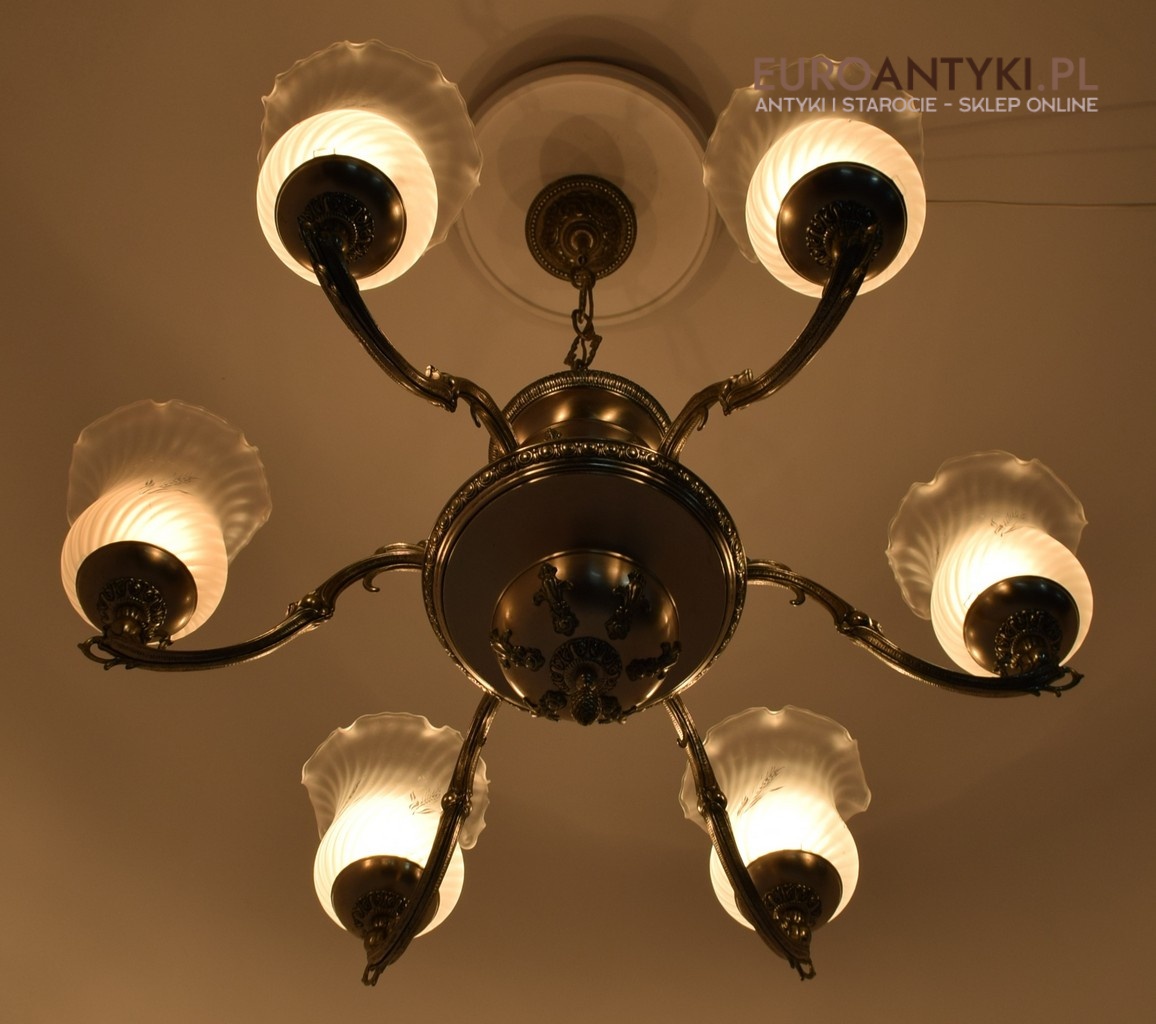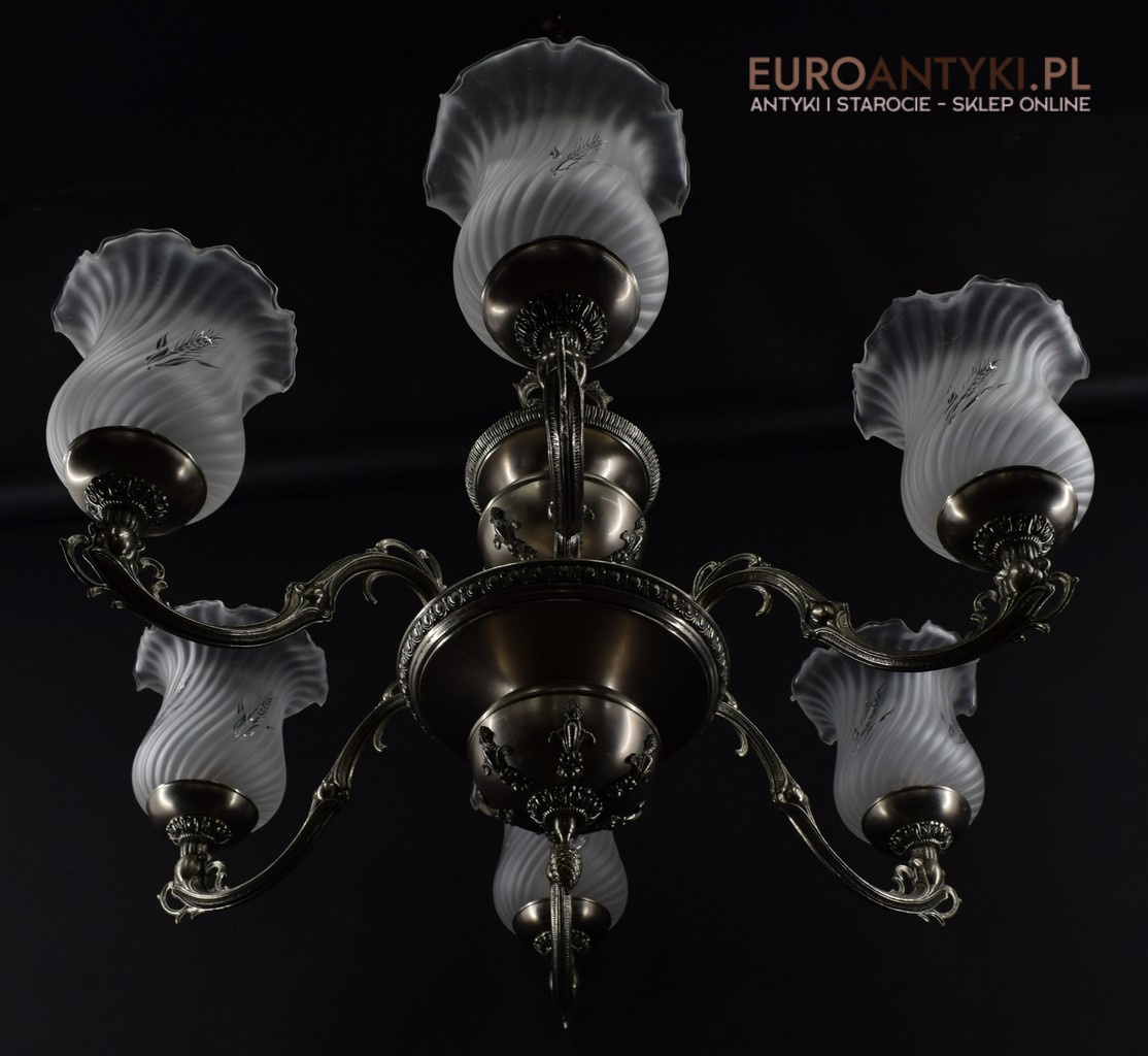 Duży starodawny srebrny żyrandol z kloszami w stylu Empire.