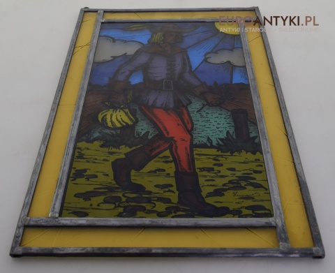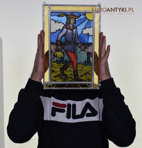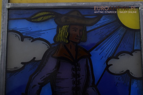 Duży stary witraż z wędrowcem. Zabytkowe witraże.