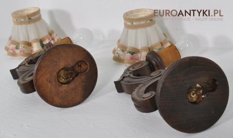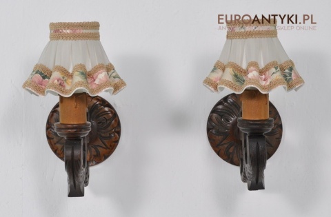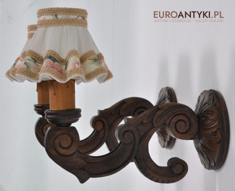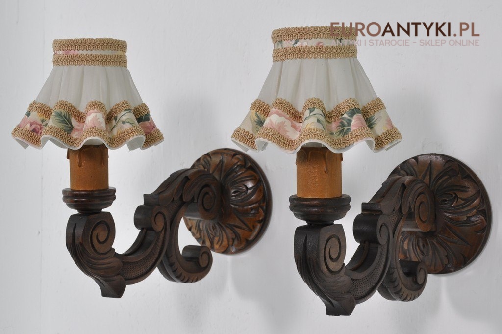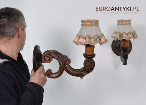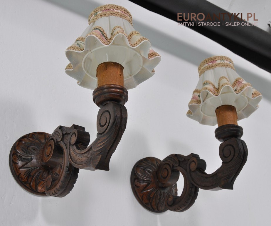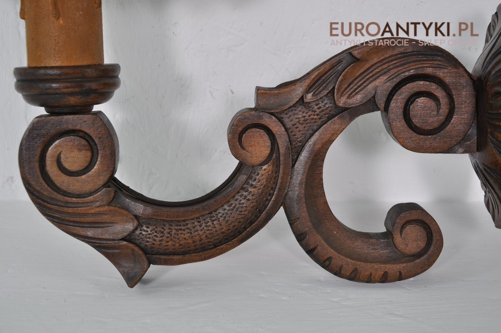 Eklektyczne rzeźbione drewniane kinkiety do salonu. Potężne kinkiety salonowe. Antyk