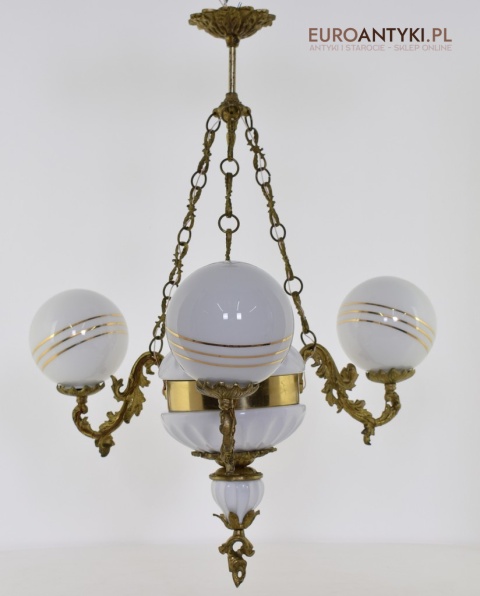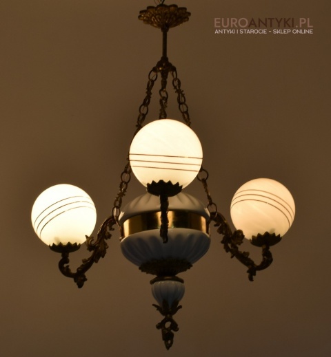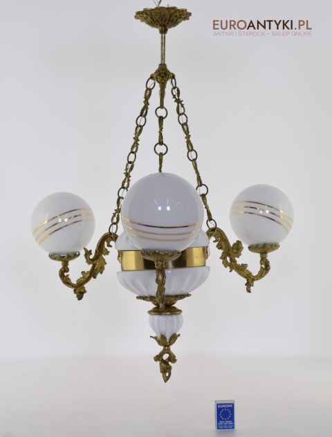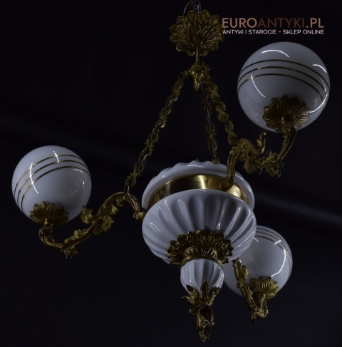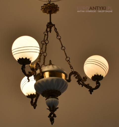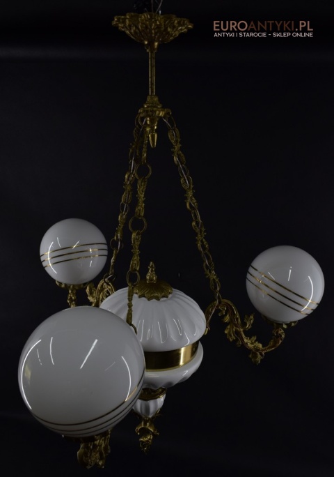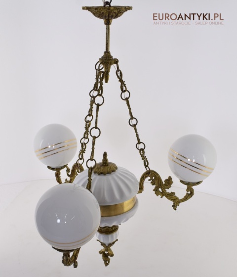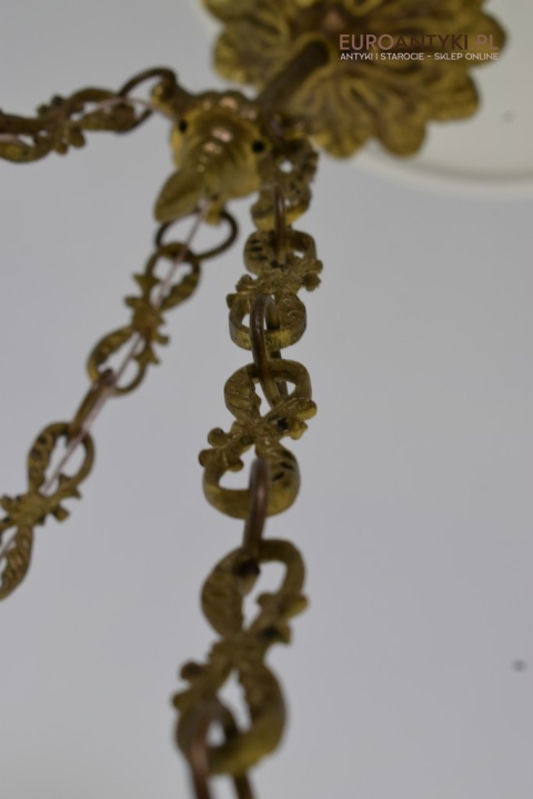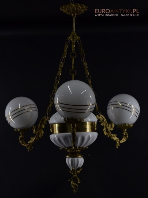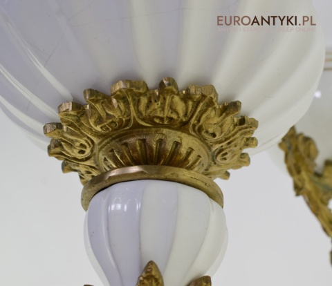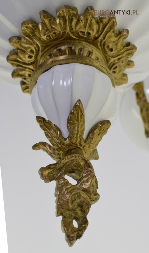 Oferujemy Państwu wyjątkowy żyrandol, który jest arcydziełem eklektycznego połączenia stylów rokoko i barok. Ta unikatowa lampa sufitowa, sprowadzona prosto z Francji, to prawdziwa perła wśród antyków. Posiada bogato zdobione, złote elementy mosiężne, które pięknie komponują się z elegancko wykonanymi kloszami z mlecznego szkła. Charakterystycznym elementem tego żyrandola jest subtelna krakelura na ceramicznej powierzchni, co dodaje mu autentycznego, antycznego uroku. Krakelura, czyli drobne, celowo wykonane pęknięcia, są niemal niewidoczne z odległości, ale z bliska prezentują się jako fascynujący detal, który podkreśla historyczny charakter i szlachetność lampy.