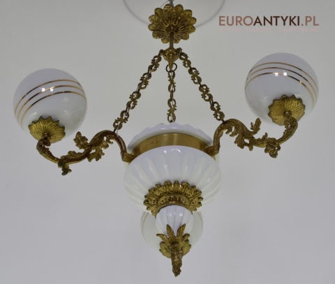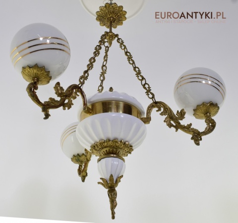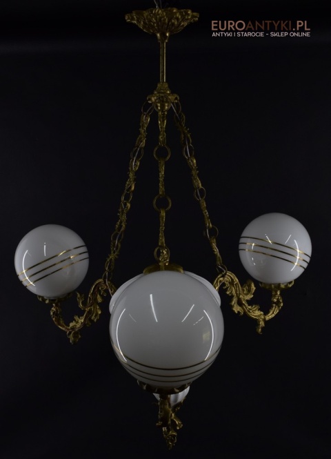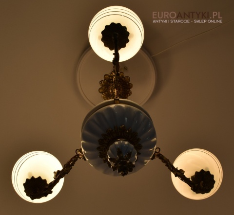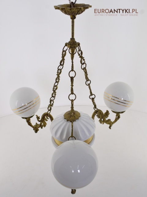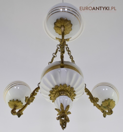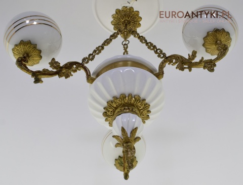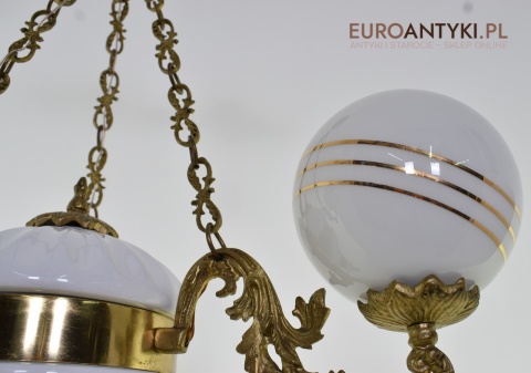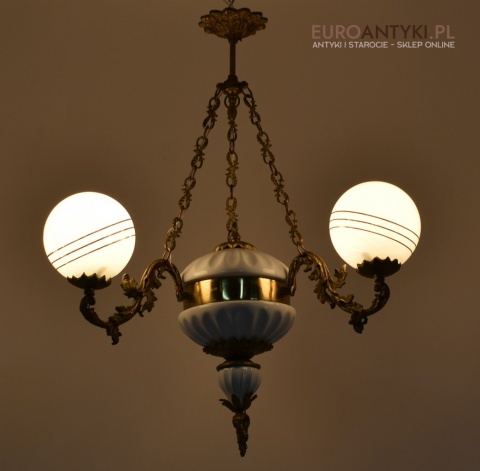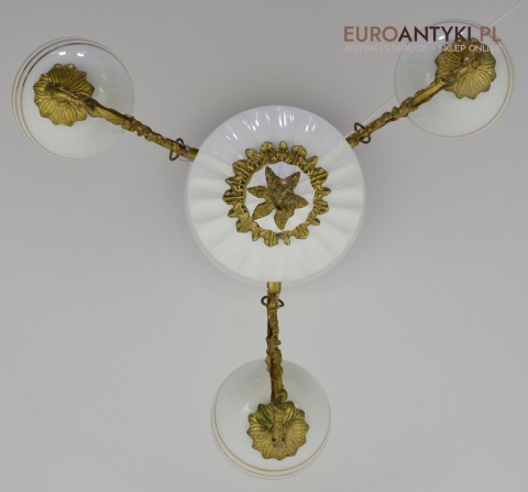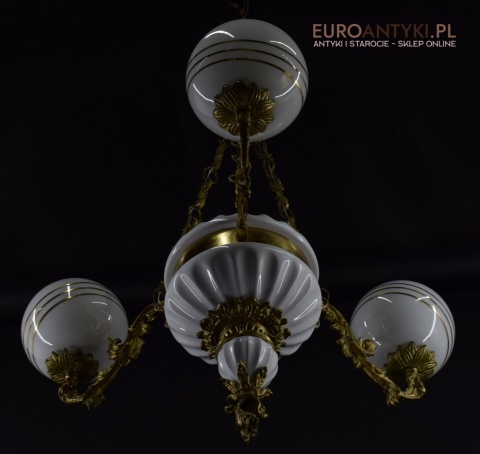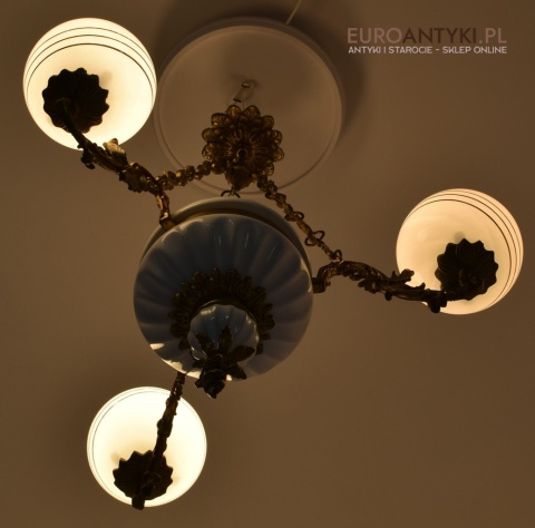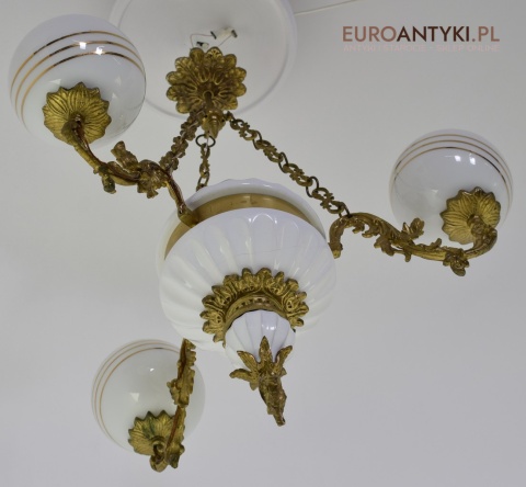 Oferujemy Państwu wyjątkowy żyrandol, który jest arcydziełem eklektycznego połączenia stylów rokoko i barok. Ta unikatowa lampa sufitowa, sprowadzona prosto z Francji, to prawdziwa perła wśród antyków. Posiada bogato zdobione, złote elementy mosiężne, które pięknie komponują się z elegancko wykonanymi kloszami z mlecznego szkła. Charakterystycznym elementem tego żyrandola jest subtelna krakelura na ceramicznej powierzchni, co dodaje mu autentycznego, antycznego uroku. Krakelura, czyli drobne, celowo wykonane pęknięcia, są niemal niewidoczne z odległości, ale z bliska prezentują się jako fascynujący detal, który podkreśla historyczny charakter i szlachetność lampy.