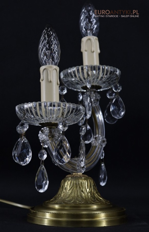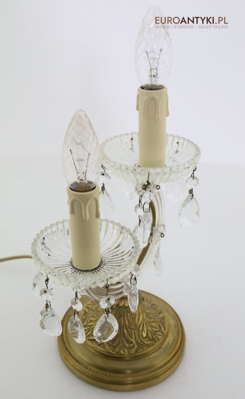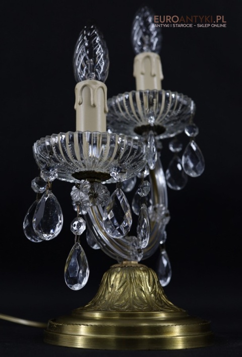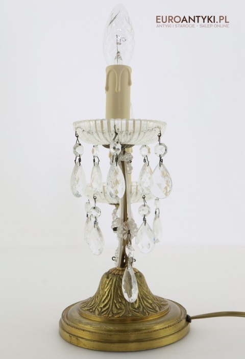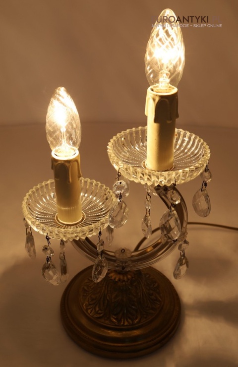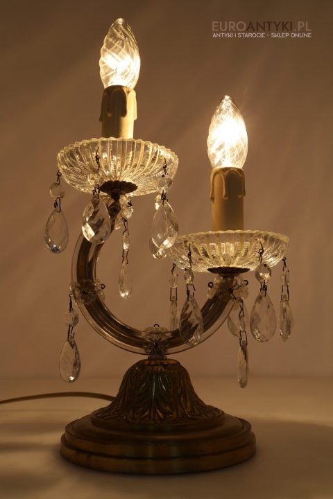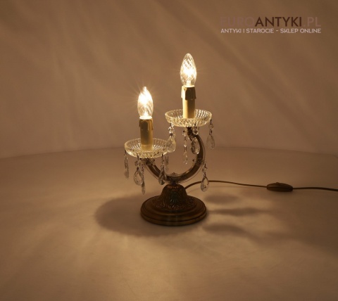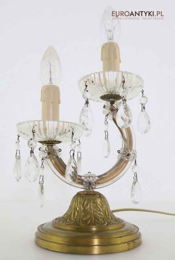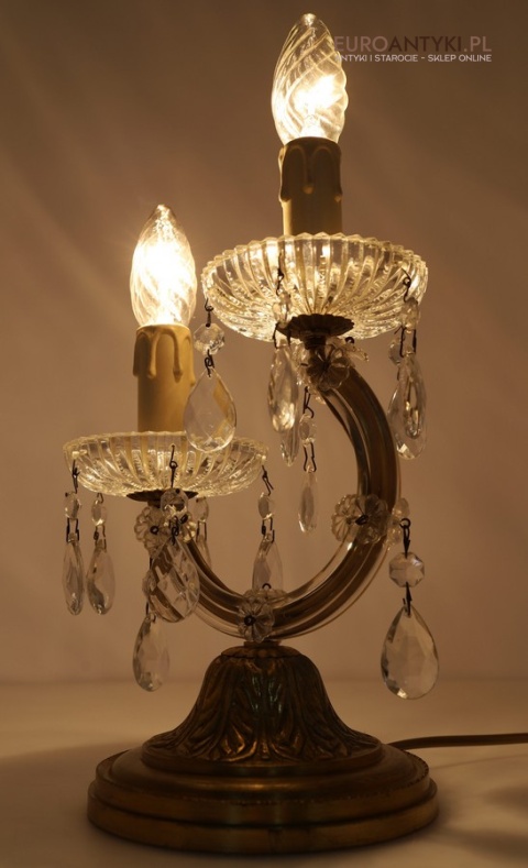 Podstawę lampki wykonano z masywnego mosiądzu, zdobionego subtelnymi ornamentami, co dodaje jej szlachetnego, retro charakteru. Dwa kryształowe talerzyki pod gilzami). Prawdziwą ozdobą lampki są liczne, prawdziwe kryształowe zawieszki, które pięknie mienią się w świetle, tworząc magiczną atmosferę.