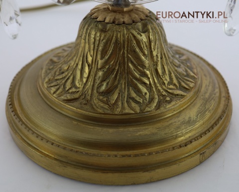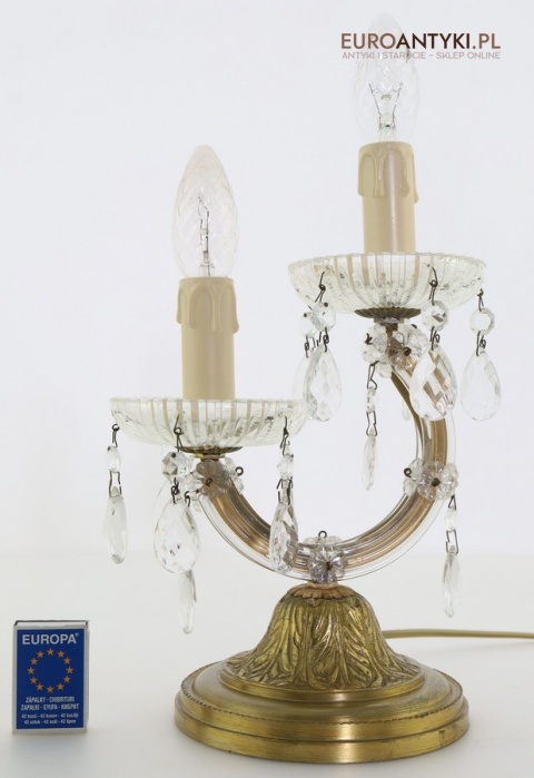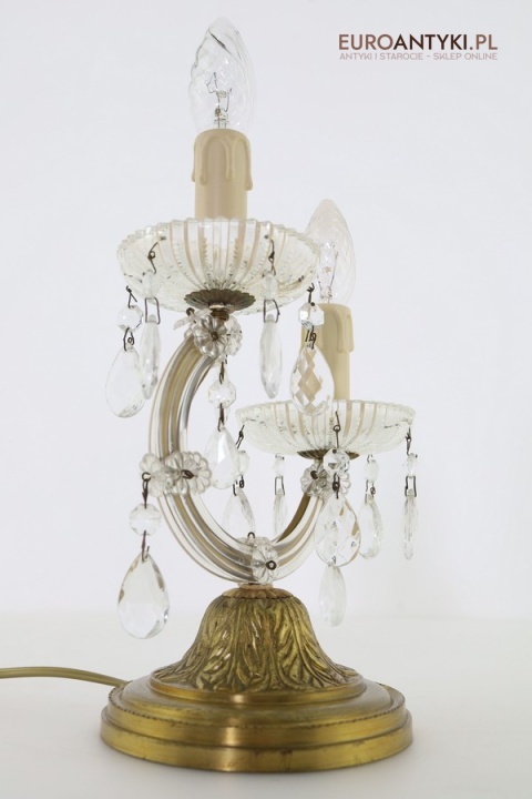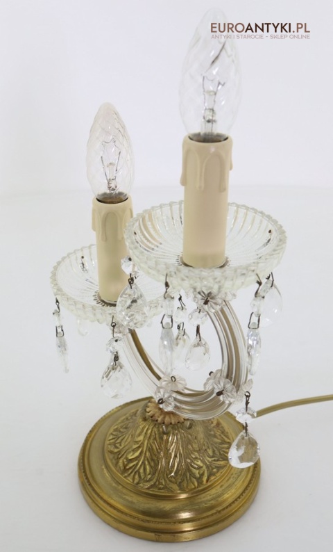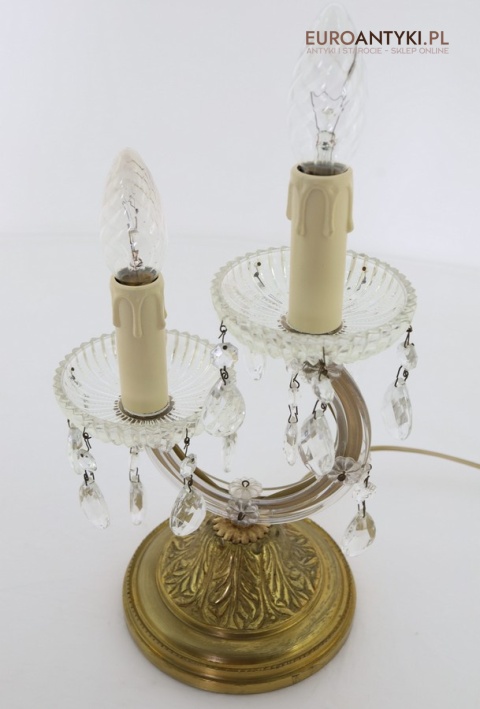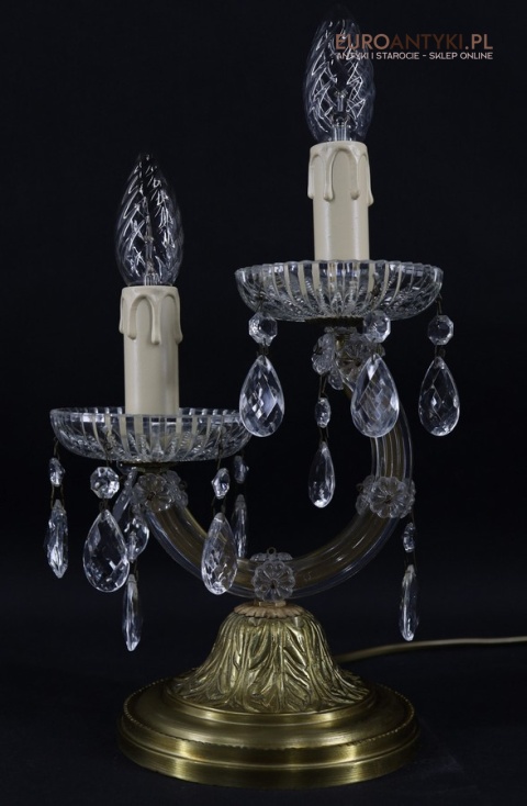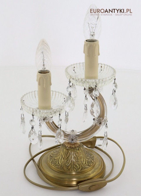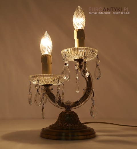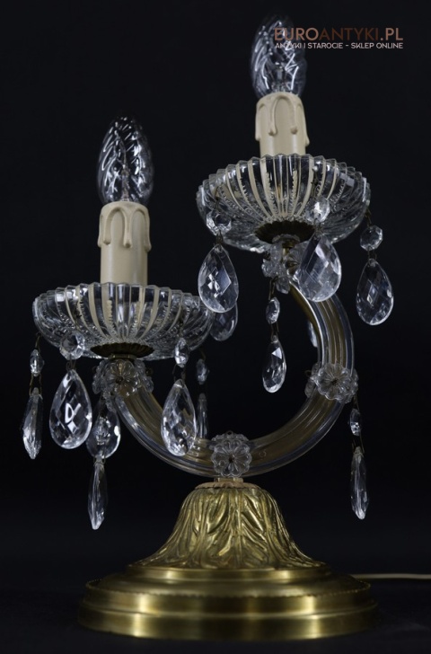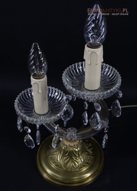 Podstawę lampki wykonano z masywnego mosiądzu, zdobionego subtelnymi ornamentami, co dodaje jej szlachetnego, retro charakteru. Dwa kryształowe talerzyki pod gilzami). Prawdziwą ozdobą lampki są liczne, prawdziwe kryształowe zawieszki, które pięknie mienią się w świetle, tworząc magiczną atmosferę.
