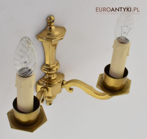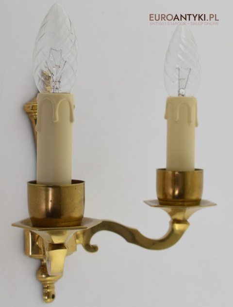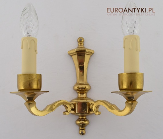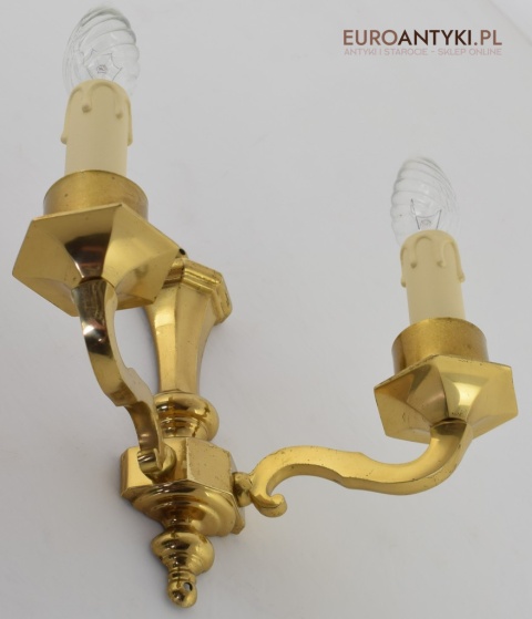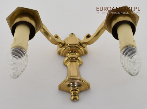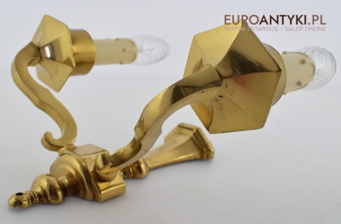 Przedstawiam Państwu niezwykle elegancki mosiężny kinkiet z dwoma ramionami, idealny do eksponowania w zabytkowych wnętrzach lub jako wyrafinowany dodatek do współczesnych przestrzeni, które cenią klasyczne piękno. Ten dwuramienny kinkiet wykonany z wysokiej jakości mosiądzu charakteryzuje się bogatym, złotym wykończeniem, które podkreśla jego wyrafinowaną formę i detale.