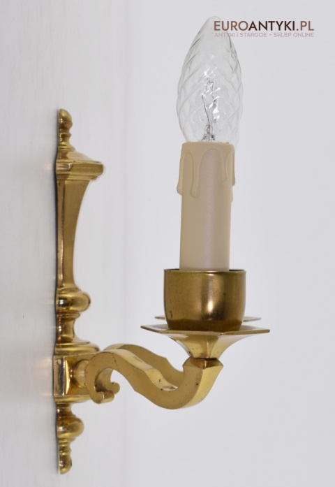 Ten mosiężny kinkiet nosi subtelne ślady użytkowania, w tym drobne rysy, które dodają mu autentyczności i świadczą o jego wiekowym charakterze. Znaki starości są naturalnym elementem jego historii, podkreślającym jego antyczny rodowód.