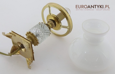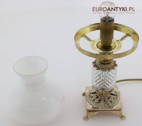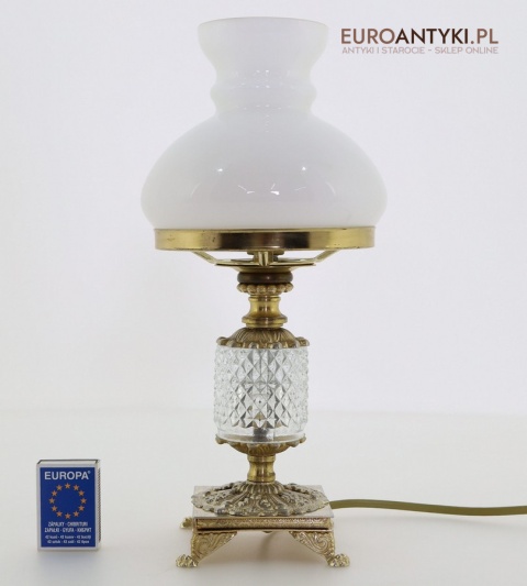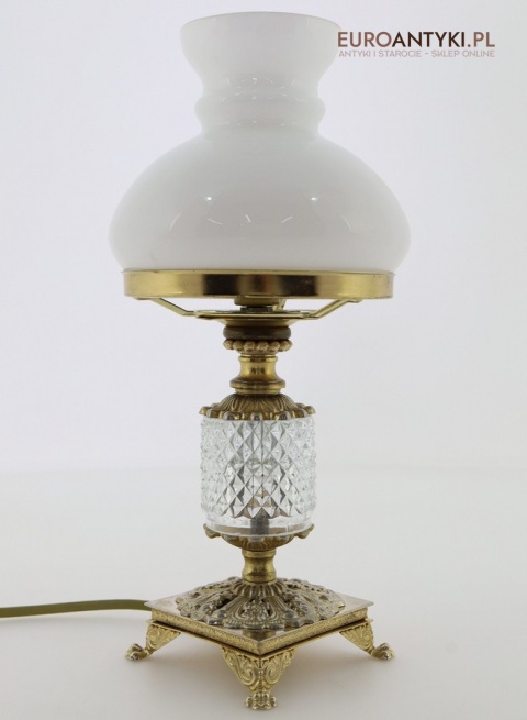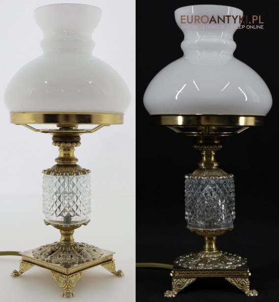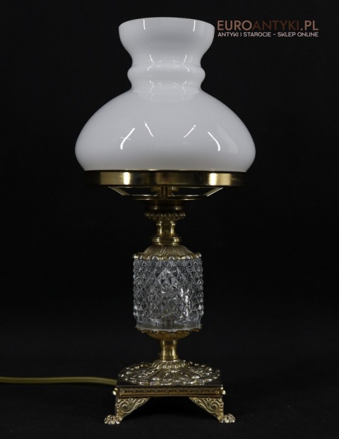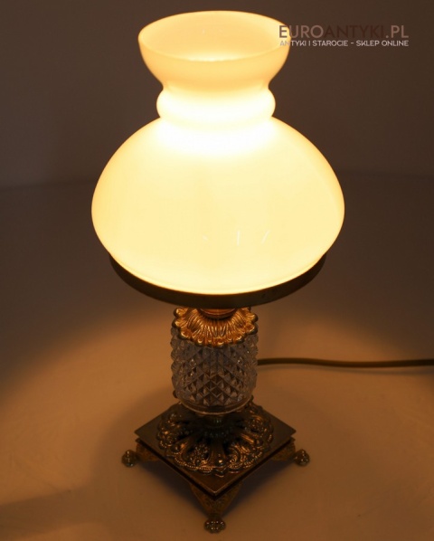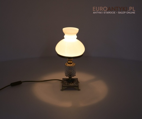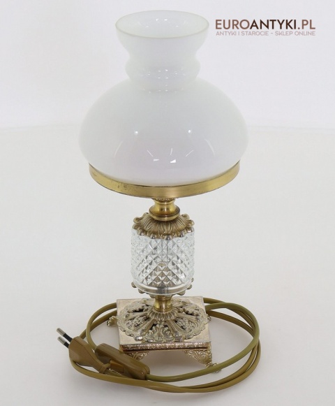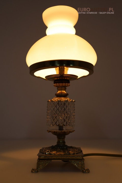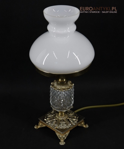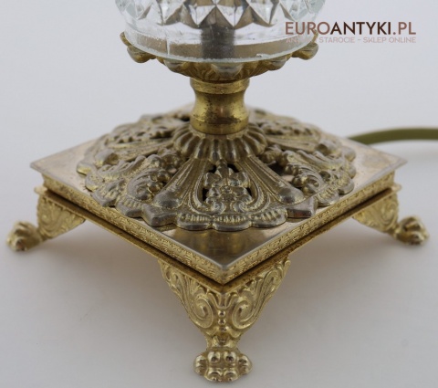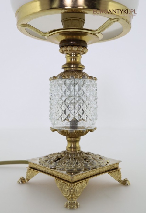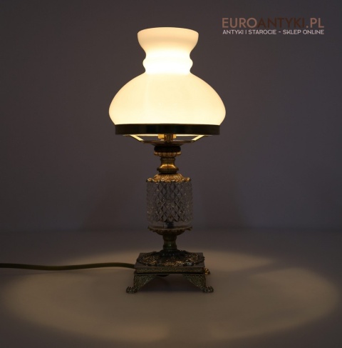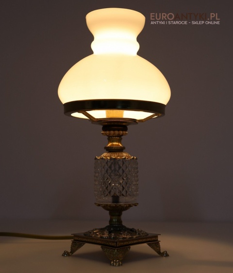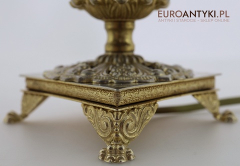 Wyjątkowa lampka stołowa z drugiej połowy XX wieku, utrzymana w stylu klasycznym z wyraźnymi akcentami neobarokowymi. Wyróżnia się bogatym wzornictwem oraz szlachetnymi materiałami, które nadają jej ponadczasowy, elegancki charakter. Na powierzchni widać drobne ślady użytakowani, co jest czymś normalnym w temacie antyków i staroci. Bez uszkodzeń mechanicznych.