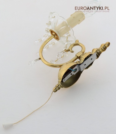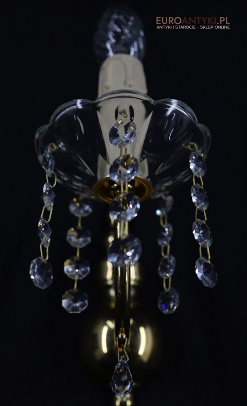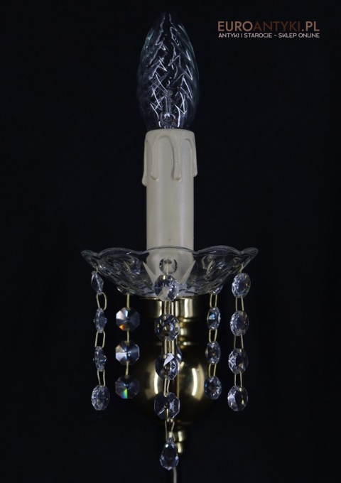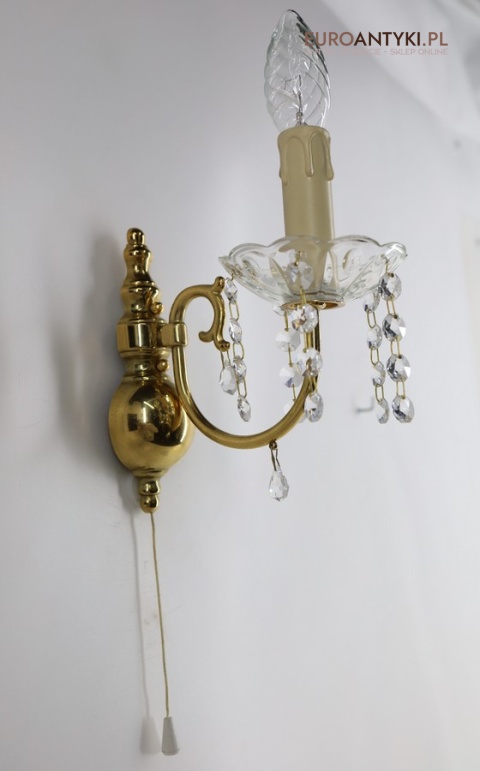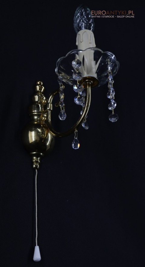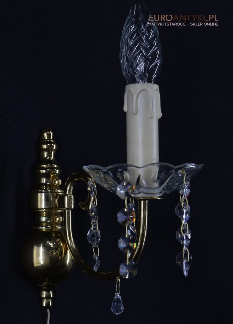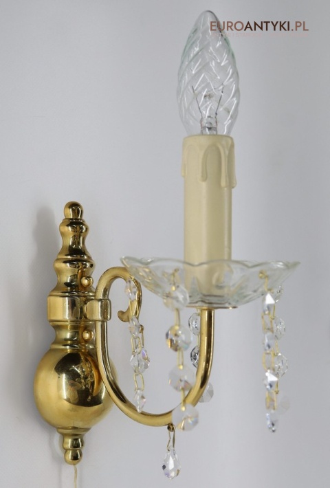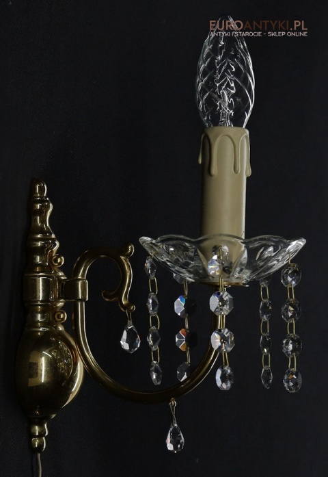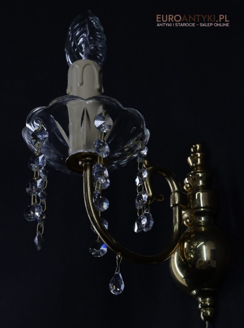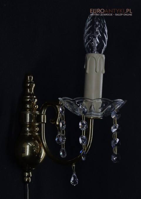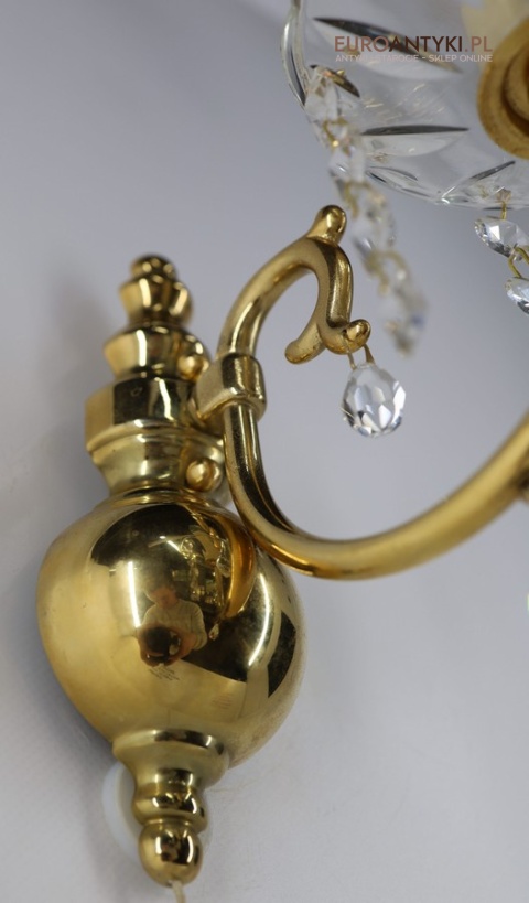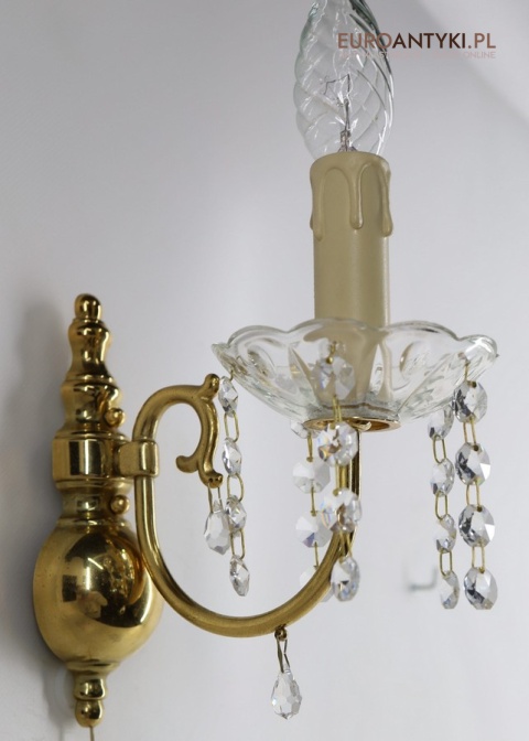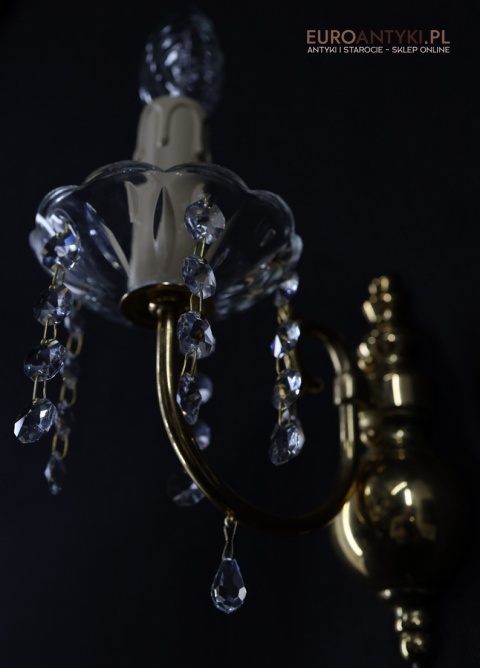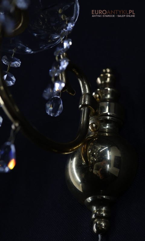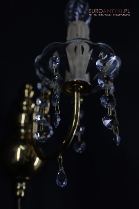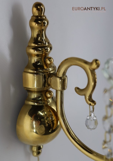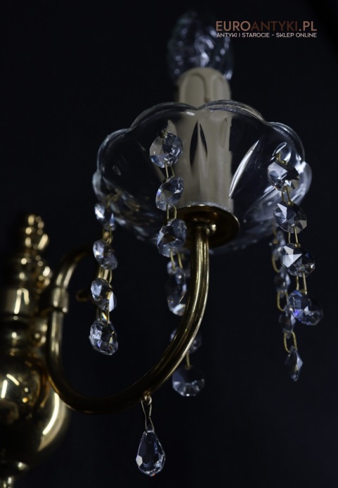 Przedstawiamy antyczny, elegancki kinkiet ścienny, pochodzący z lat 70. XX wieku, w stylu Art Deco / Empire. Ta wyjątkowa lampa ścienna została wykonana z masywnego mosiądzu i wzbogacona o kryształowe, szlifowane zawieszki, które pięknie rozpraszają światło, nadając wnętrzu luksusowego blasku.
