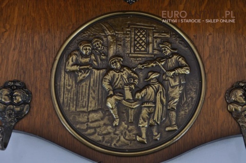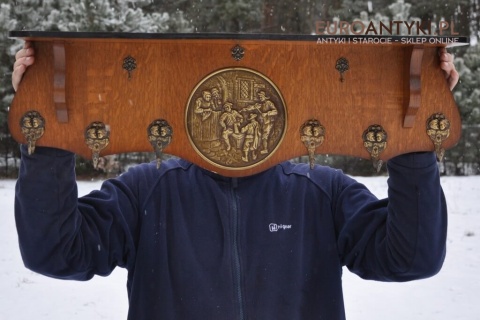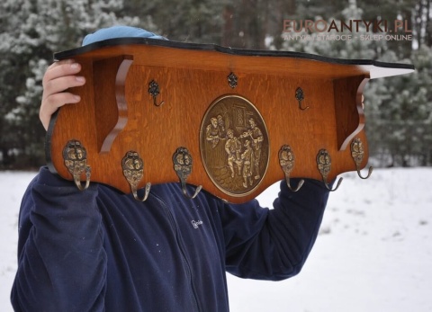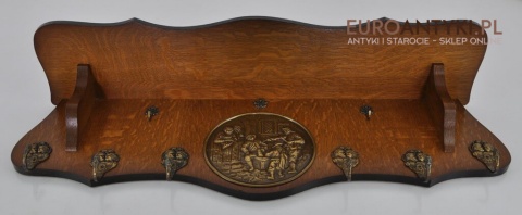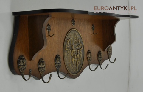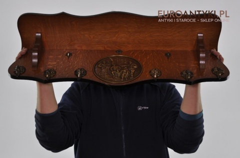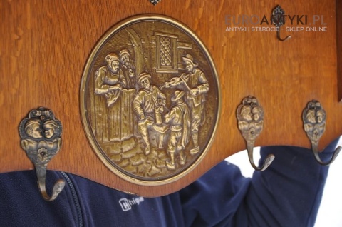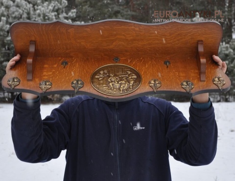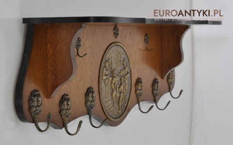 Zabytkowa garderoba wykonana z drewna + mosiężne haki i mosiężny ozdobny talerz w centrum starej garderoby.