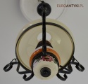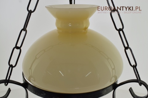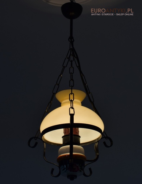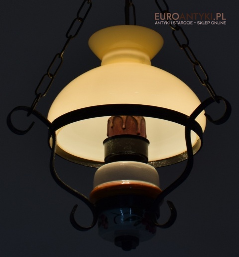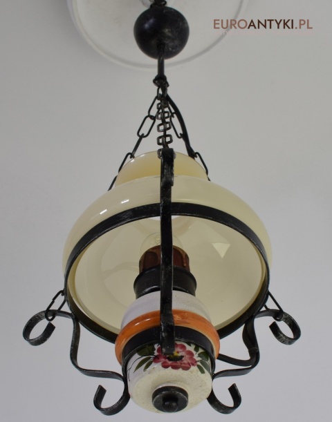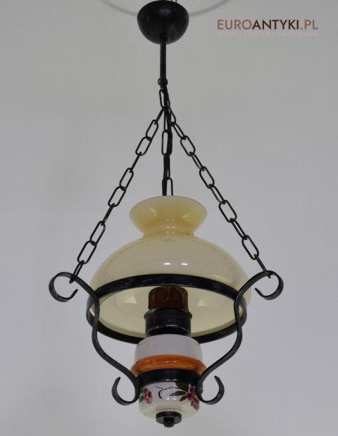 Klasyczna lampa wisząca w góralskim stylu, sprowadzona z Francji. Pochodzi z około 1970 roku i została wykonana ze strukturalnej ceramiki oraz metalu. Posiada szklany klosz, który jest w idealnym stanie, bez żadnych uszkodzeń. Przedmiot jest kompletny i został profesjonalnie wyczyszczony. Elektryka lampy jest sprawna - została sprawdzona przez naszego fachowca. Lampa posiada standardowe gniazdo elektryczne typu E27, co oznacza że można do niej zamontować różnego rodzaju żarówki LED o różnym natężeniu światła oraz różnej barwie.