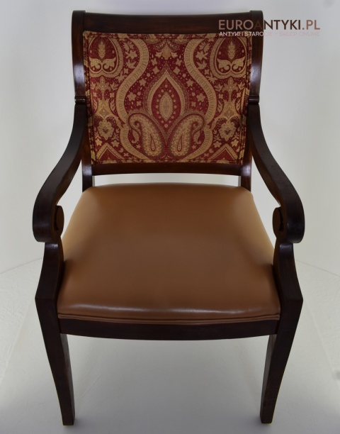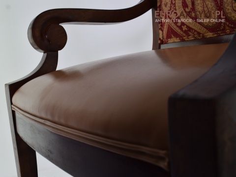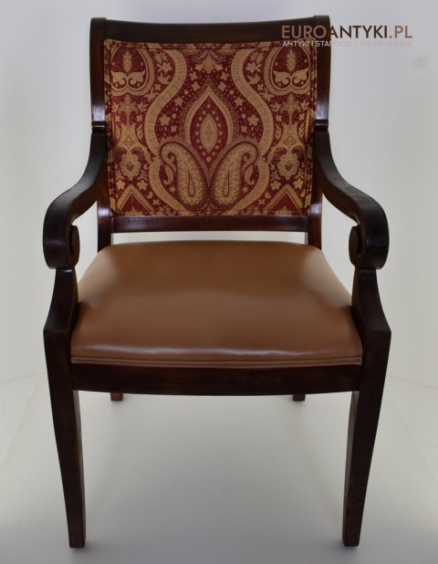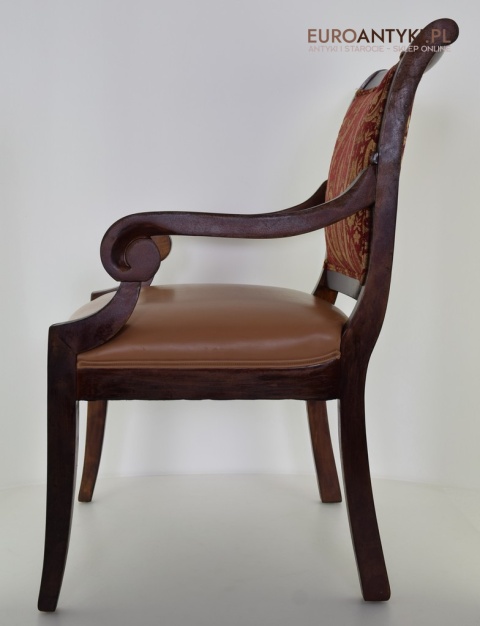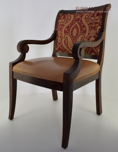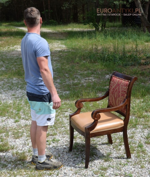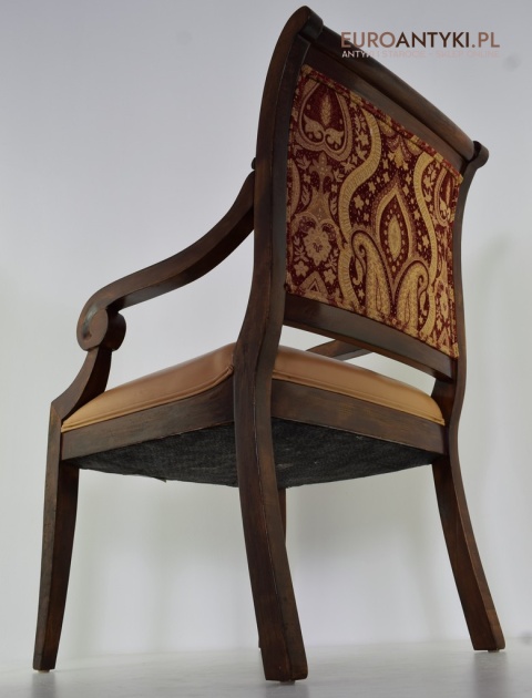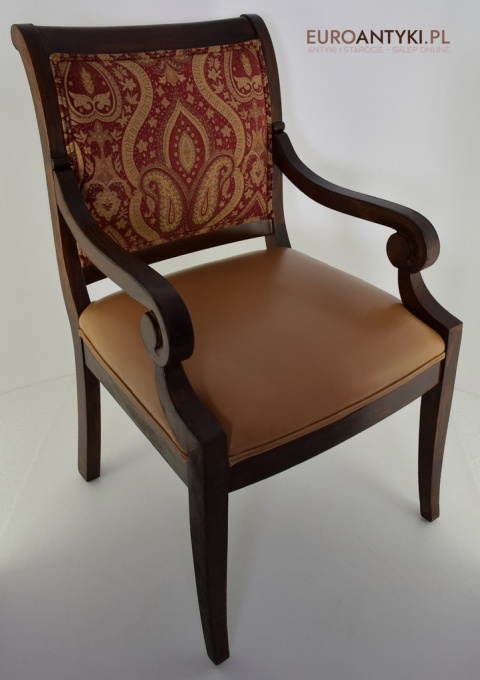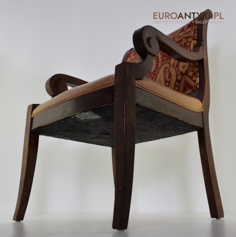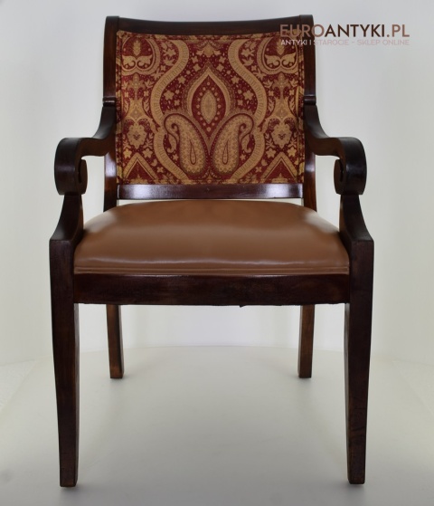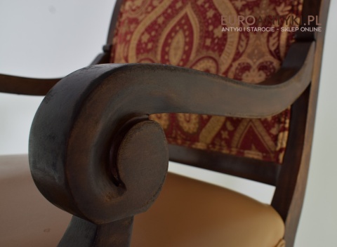 - Zakrzywione Podłokietniki: Styl empire jest znany z eleganckich, zakrzywionych linii, które są widoczne w podłokietnikach tego krzesła.