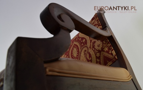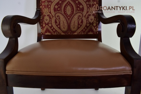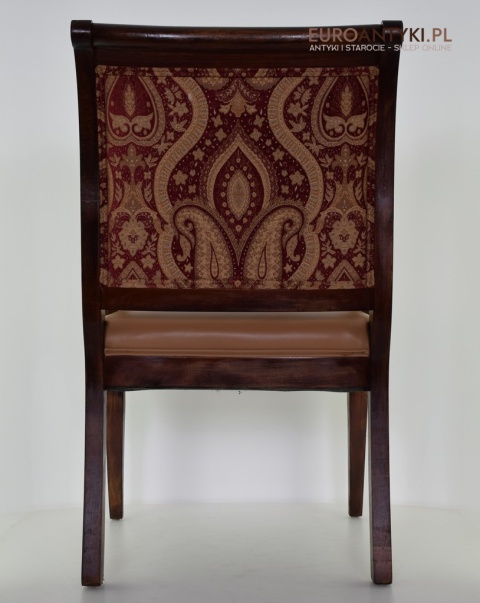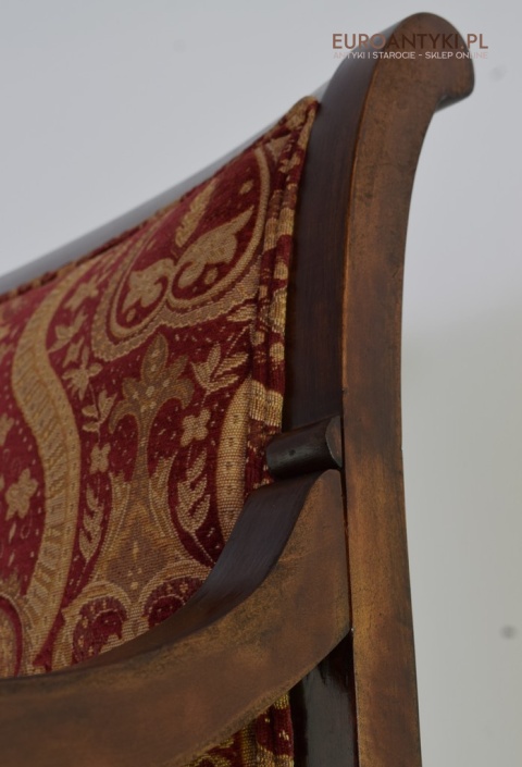 - Bogata Tapicerka: Wzór tapicerki na oparciu krzesła jest bogaty i dekoracyjny, co jest typowe dla stylu empire, który często korzystał z luksusowych materiałów i bogatych wzorów.