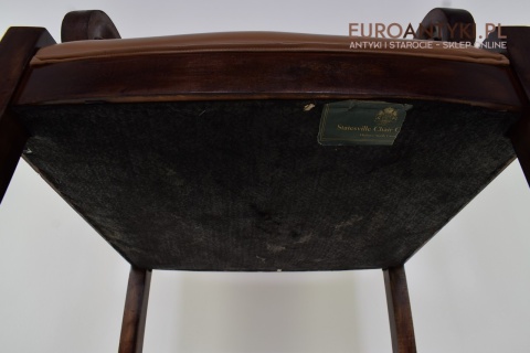 Szerokie krzesło sprowadzone z Francji. Pochodzi z połowy XX wieku. Wykonane w USA - Statesville Chair Company North Carolina. Pod spodem szyld manafukatury widoczny na zdjęciach.