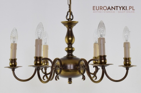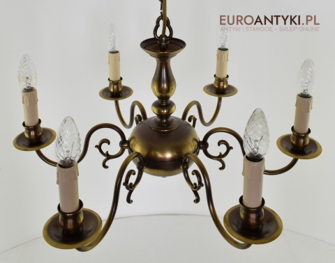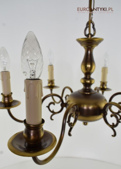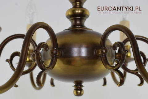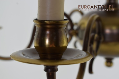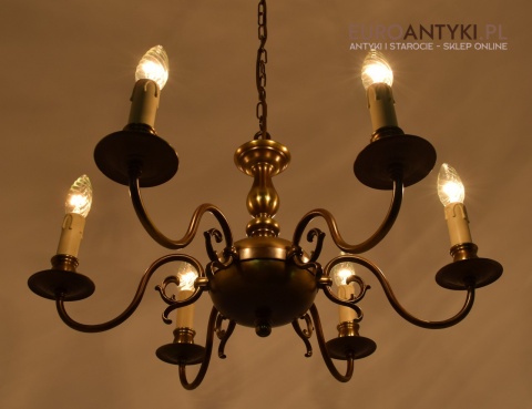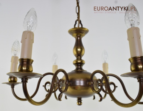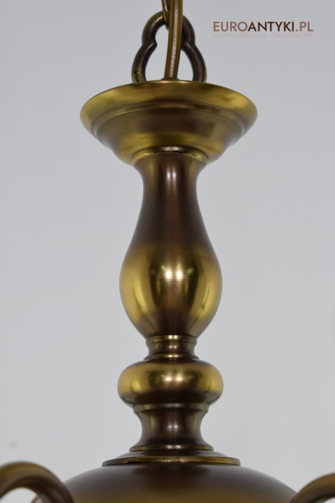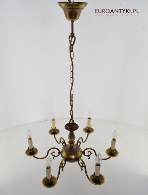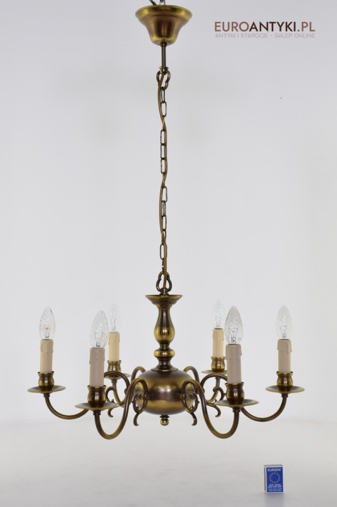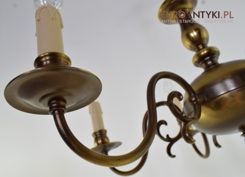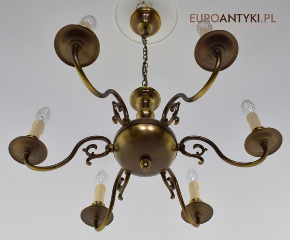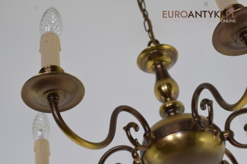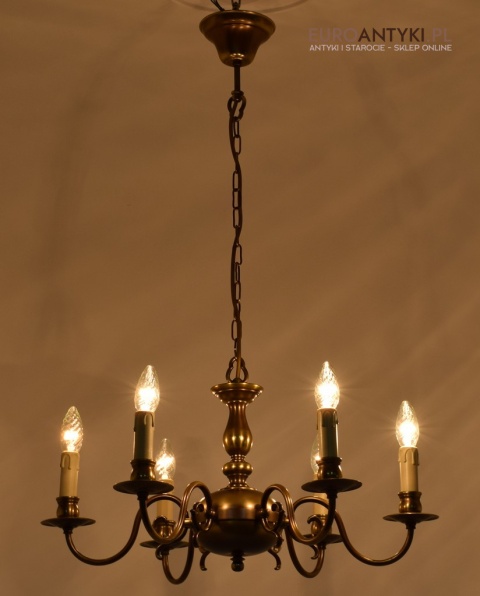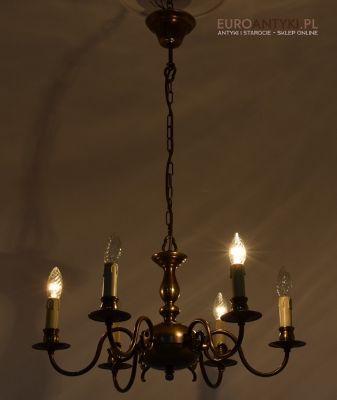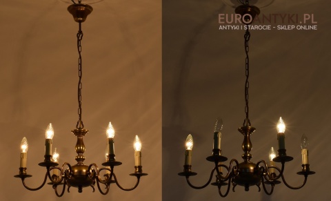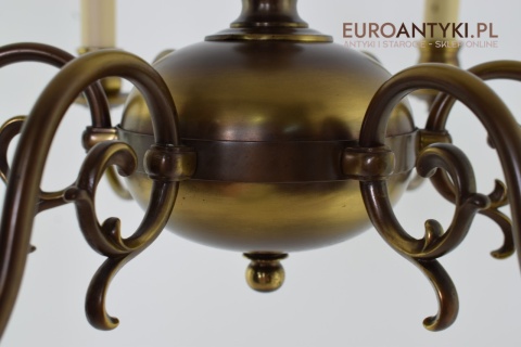 Żyrandol posiada sześć ramion, każde zakończone stylizowanym uchwytem na żarówkę, co nadaje mu klasyczny wygląd. Mosiężna konstrukcja jest solidna i trwała, a wymienione na nowe gilzy w kolorze retro vintage ecru doskonale komponują się z całością, podkreślając jego antyczny charakter. Instalacja elektryczna została zaprojektowana w taki sposób, aby można było zaświecić wszystkie żarówki na raz lub tylko dolną lub górną koronę oddzielnie.