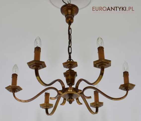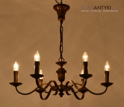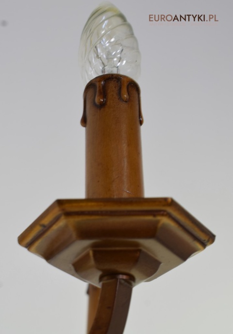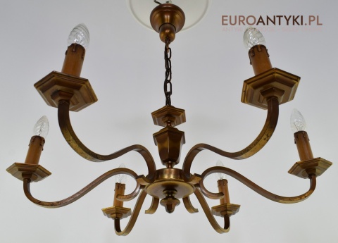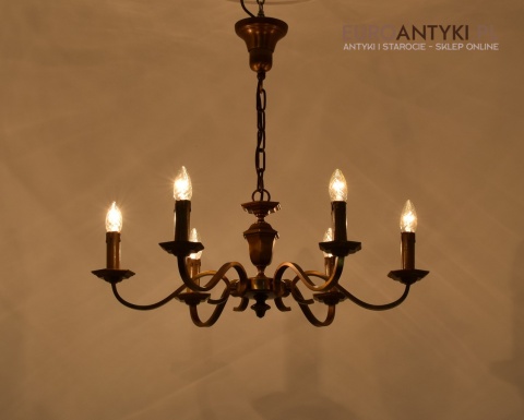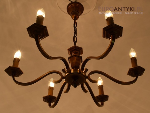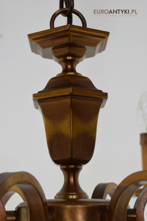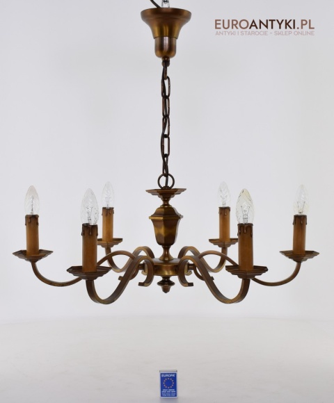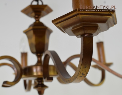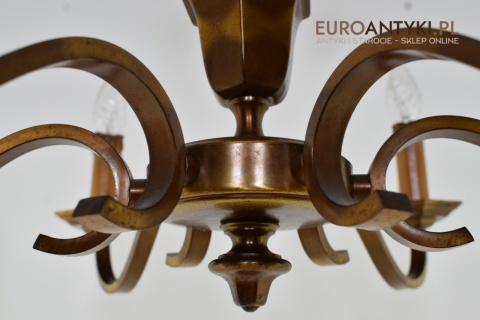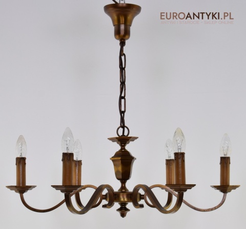 Ten wyjątkowy żyrandol wykonany z brązu prezentuje pełnię stylu vintage z połowy XX wieku. Cechuje go klasyczny pałacowy design, widoczny w finezyjnie zakrzywionych ramionach, które unoszą sześć źródeł światła, przypominających świeczki. Każde z ramion jest subtelnie ozdobiona naturalną patyną, świadczącą o jej autentycznym wieku, co nadaje temu unikalnemu elementowi wystroju niepowtarzalnego charakteru.