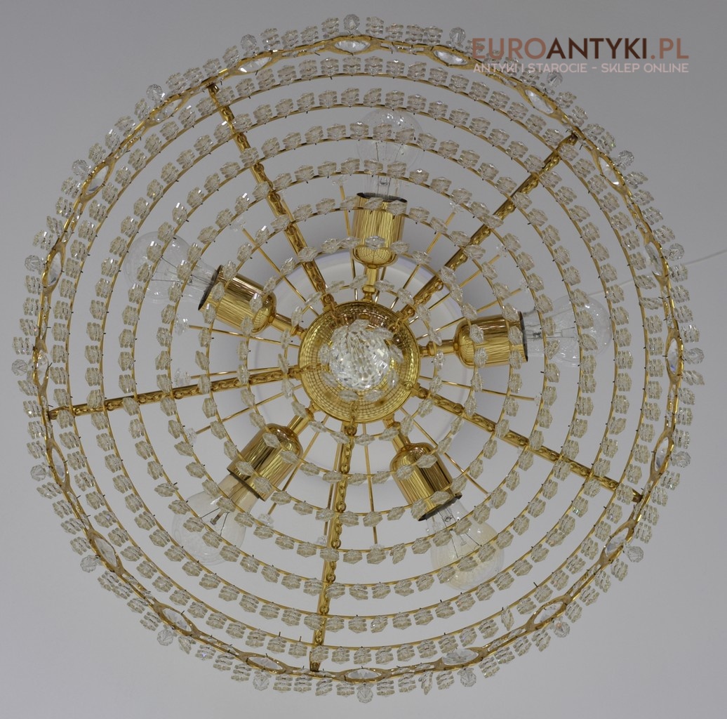 Sprowadzony z Austrii, pochodzi z połowy ubiegłego wieku. Wykonany z masywnego mosiądzu o kolorze złota. Prawdziwe kryształowe zawieszki w stylu Swarovski. W promieniach słońca kryształy tworzą niezwykłe, wręcz niezapomniane efekty świetlne. Niestety ciężko to uwiecznić na zdjęciach, ale na żywo wygląda to ślicznie! 100% kompletne, w bardzo dobrym stanie.