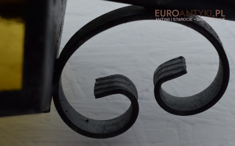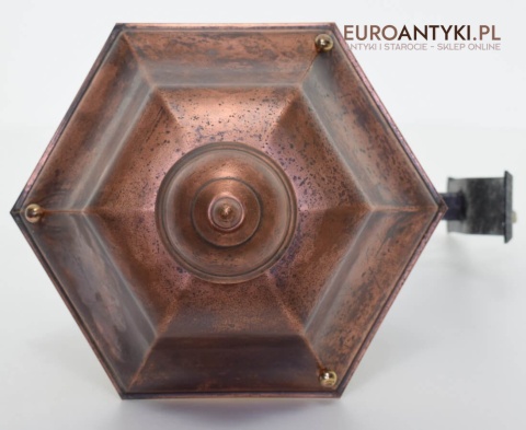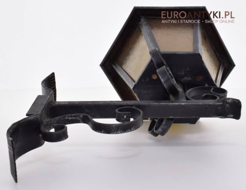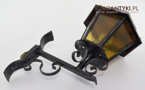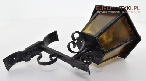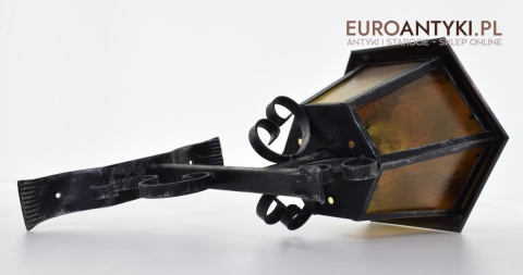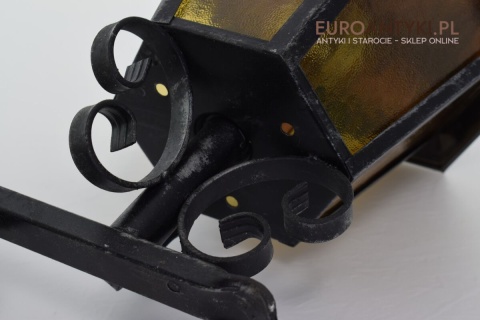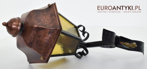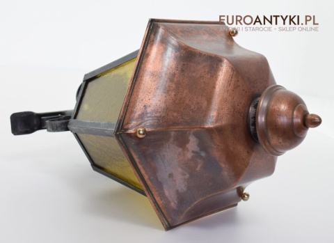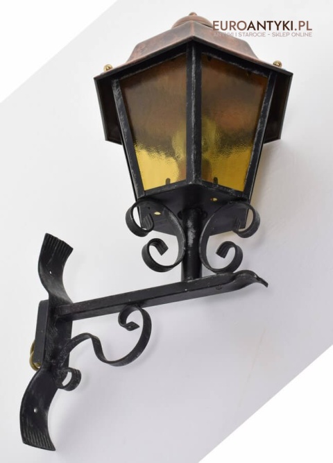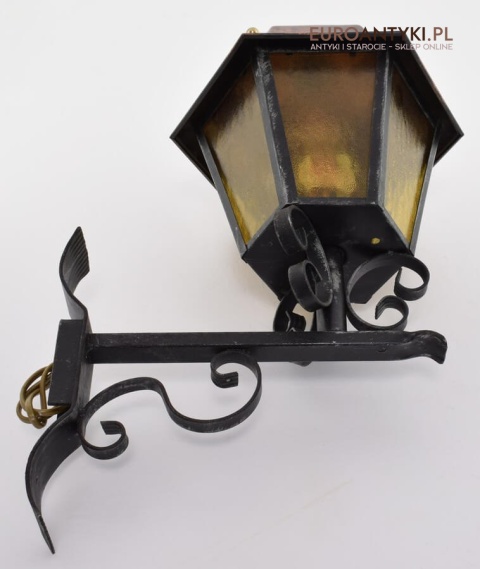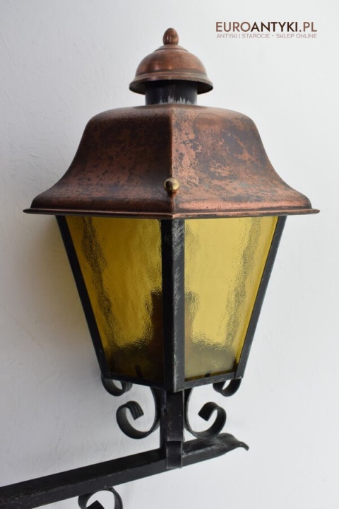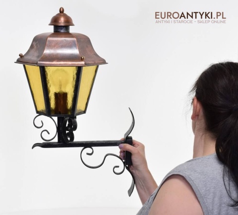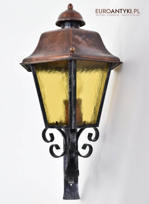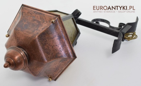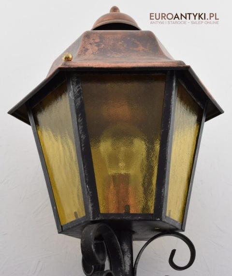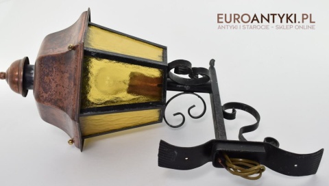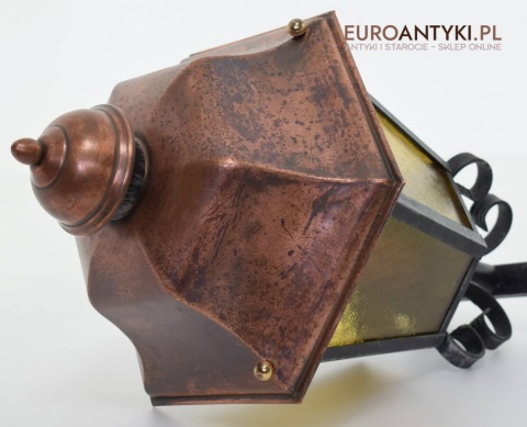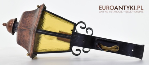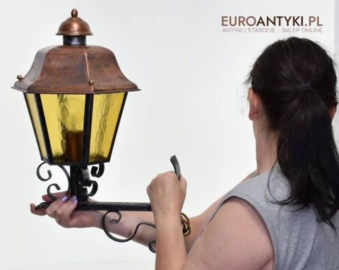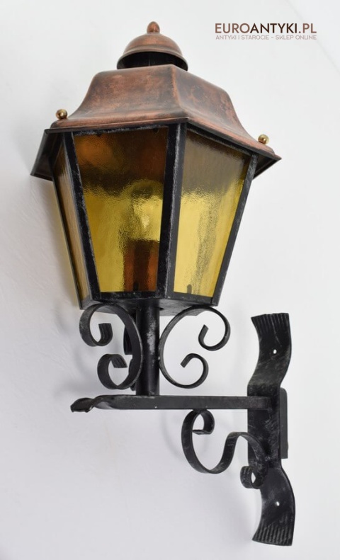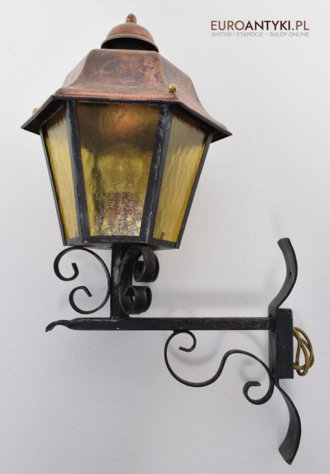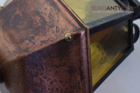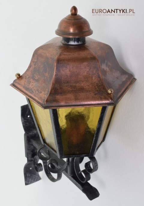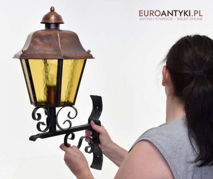 Prawdziwa antyczna lampa pochodząca z lat 1920-30, wykonana w rustykalnym stylu, czyli ramie z kutych metalowych części. Daszek z blachy miedzianej i żółte oryginalne szybki matowe. Lampe poddaliśmy drobnej renowacji bo nie wymagała całkowitej renowacji , a szkoda z takiej pięknej starej lampy robić nowy kinkiet. Ponadczasowy kinkiet został oczyszczony przez naszych fachowców. Zachował się w bardzo dobrym stanie, jedynie to elektrykę wymieniliśmy na nowszą. Wewnątrz jest standardowe gniazdo na żarówkę typu E27 o maksymalnej mocy 100 watt. Obecnie można kupić ledowe żarówki o znacznie większej mocy które nie nagrzewają się tak jak te stare żarówki, więc śmiało można dać żarówkę o większej mocy.