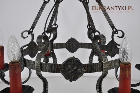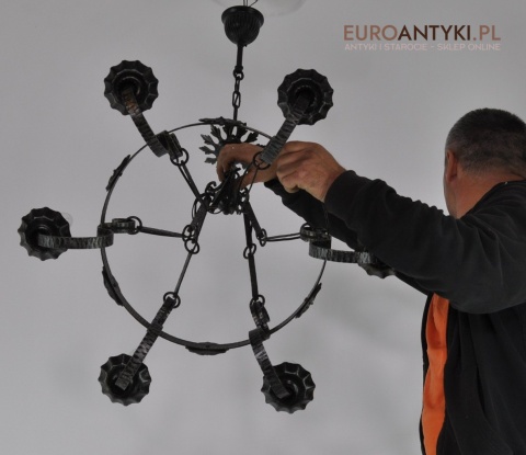 Rustykalny, kuty żyrandol będzie stanowił idealny element wystroju wnętrza zamku, restauracji lub stylizowanej gospody i wszystkich pomieszczeń, w których króluje kamień oraz drewno.