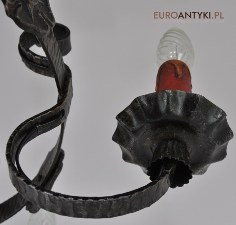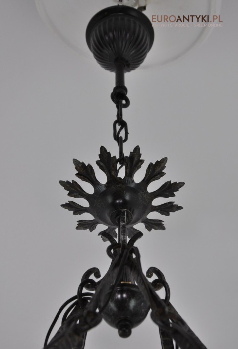 Efektowny, kuty żyrandol został sprowadzony z Francji, a jego powstanie jest datowane na lata 60. ubiegłego wieku. Stan przedmiotu oceniamy jako bardzo dobry, jego elektryka jest w pełni sprawna.