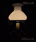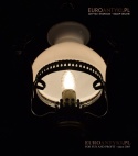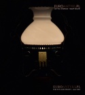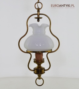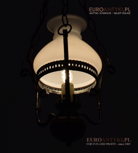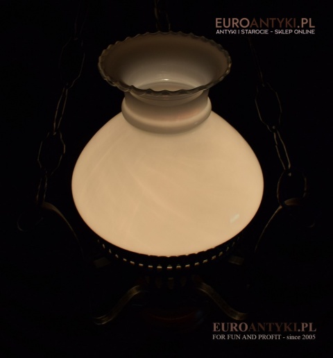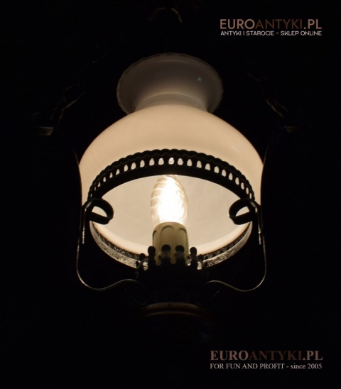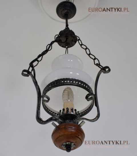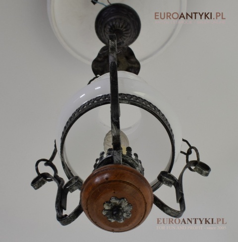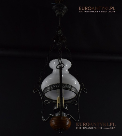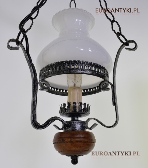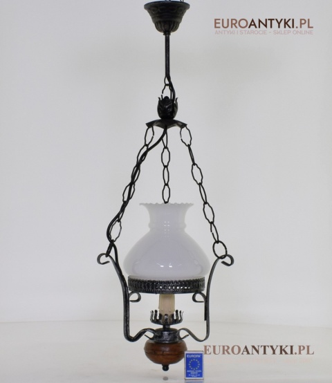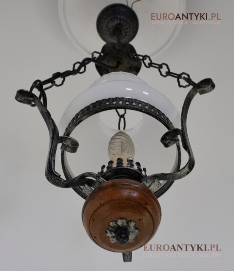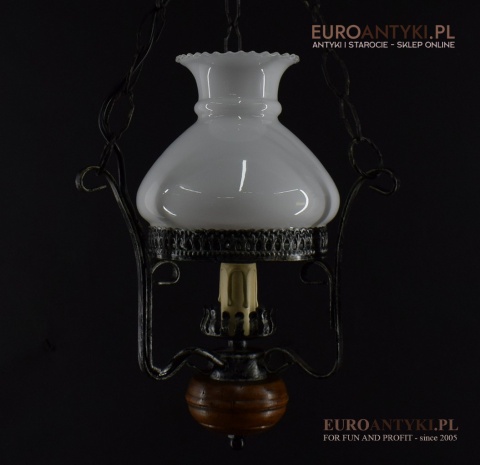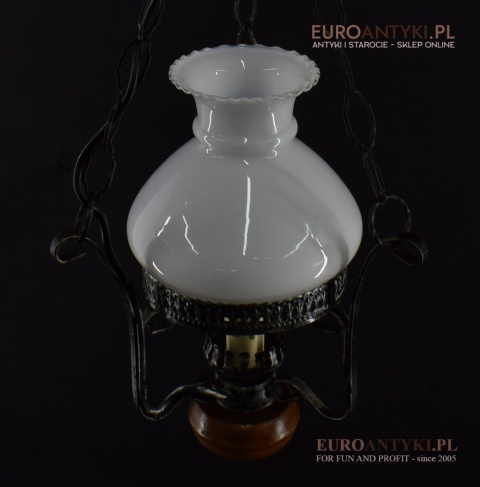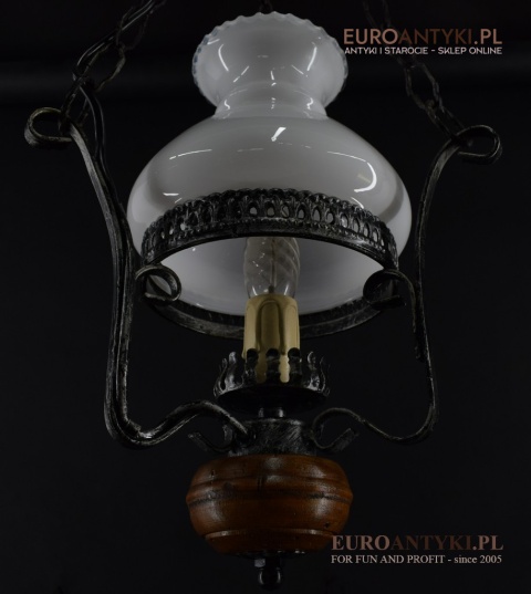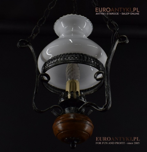 Sprowadzona z Francji. Pochodzi z około 1970 roku. Wykonana z metalu i drewna stylizowanego na stare - czyli są sztucznie porobione otworki niby po kornikach. Jest to celowy zabieg, często stosowanych w postarzaniu mebli i lamp. Klosz szklany w mlecznym kolorze - w idealnym stanie. Gilza wymieniona na nową w klimacie retro - vintage.