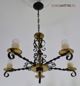 Całość bez uszkodzeń. Przedmiot kompletny, profesjonalnie wyczyszczony. Elektryka sprawna - sprawdzana przez naszego fachowca. Standardowe gniazdo elektryczne typu E14. Obecnie można kupić żarówki LED o różnym natężeniu, różnej barwie światła i różnym wyglądzie. Nawet mała żarówka może być dużej mocy i nie będzie pobierać wielu watt, przez co nie przegrzewa i nie uszkodzi kabli elektrycznych. Wszystkie lampy wysyłamy bez żarówek. Żarówki tego typu są łatwo dostępne w sklepach elektrycznych lub w internecie.