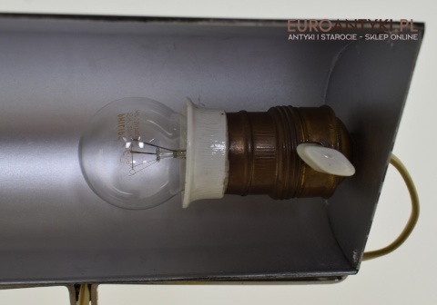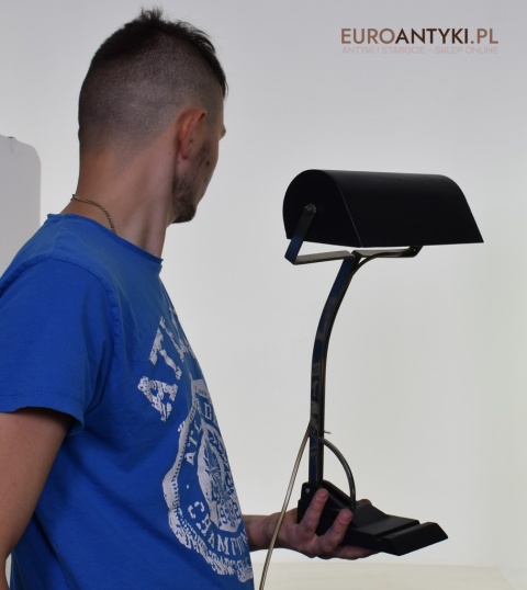 Sprowadzona z Austrii. Pochodzi z epoki Art Deco. Wykonana z metalu. Ciężka żeliwna stopa, dzięki której lampa stoi stabilnie. Klosz ruchomy - góra, dół. Całe ramie ruchome, góra, dół.
