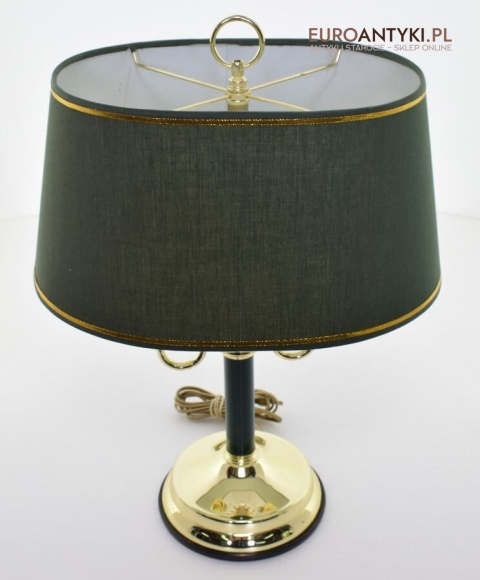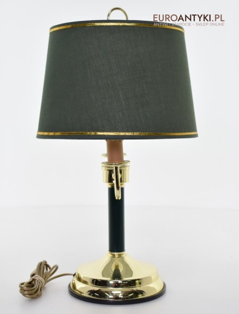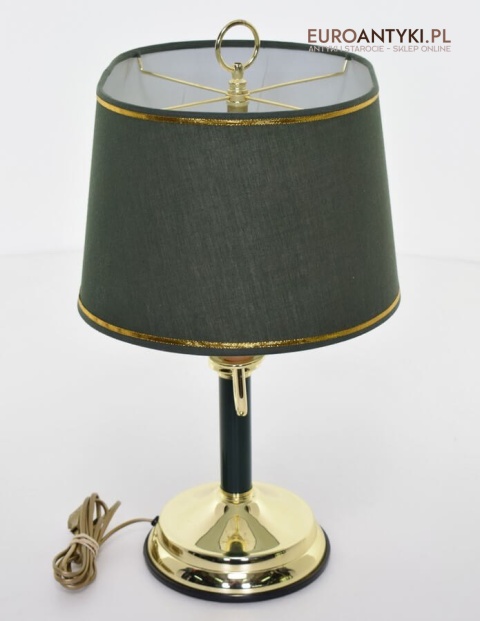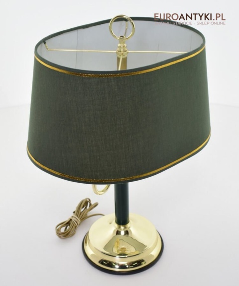 Bardzo dekoracyjna i solidnie wykonana stara lampka w stylu Empire. Oczywiście lampka ta to replika pochodząca z lat 1970-80, wykonana z metalu mosiądzowanego. Klosz z zielonego materiału. Lampka przez ostatnich 15 lat stała u mnie na biurku, ale się znudziła. Stan lampki oceniam na bardzo dobry, bez uszkodzeń. Materiałowy klosz bez brzydkich zapachów po papierosach czy innych przykrych niespodzianek.