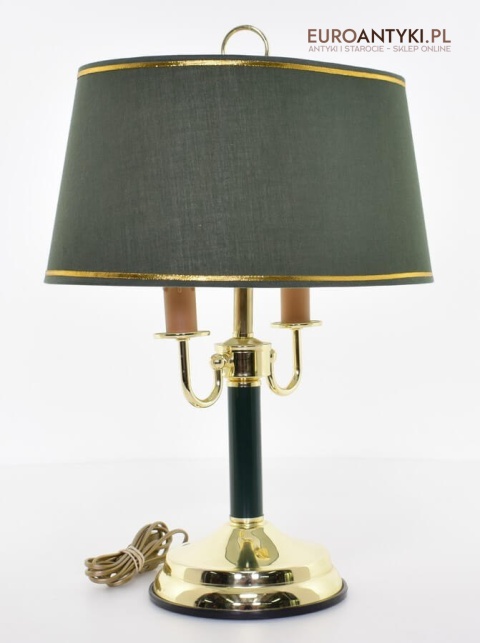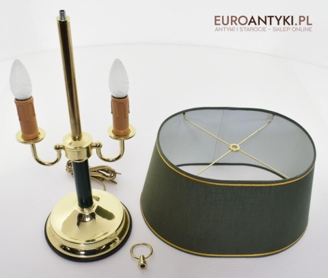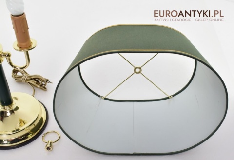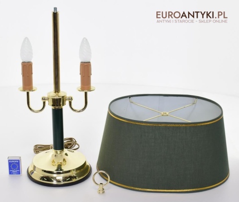 Wracając do tej starej ekskluzywnej lampki, to muszę wspomnieć ze na niektórych zdjęciach w mosiądzowej stopie odbijaj się przedmioty z naszego studia fotograficznego. W realu powierzchnia stopy jak i innych części mosiądzowanych jest w idealnym stanie. Ta rewelacyjna lampka gabinetowa została kupiona przez nas na giełdzie antyków we Francji. Elektryka jest sprawna. 2 gniazda typuE14 - każde o maksymalnej mocy 60 watt. Wszystkie antyczne lampy i zabytkowe żyrandole wysyłamy bez żarówek. Stan lampki i abażura oceniam na bardzo dobry - brak uszkodzeń.