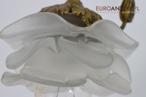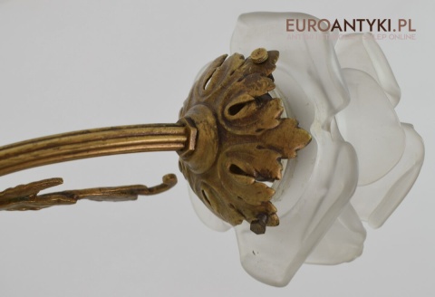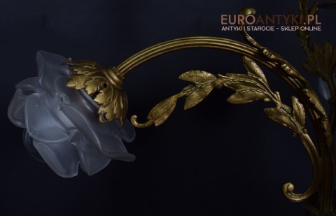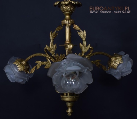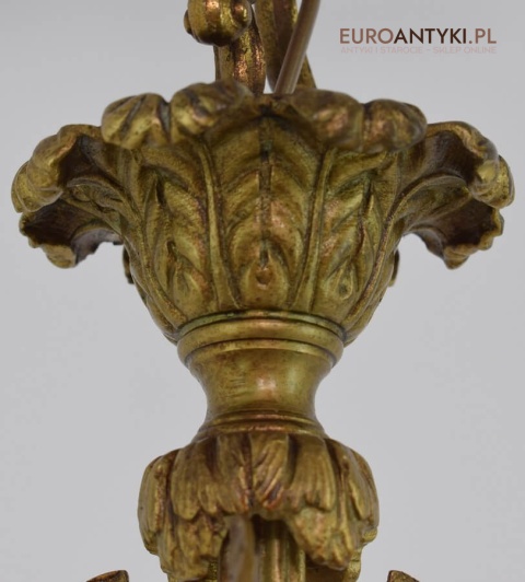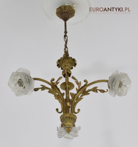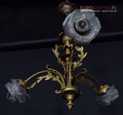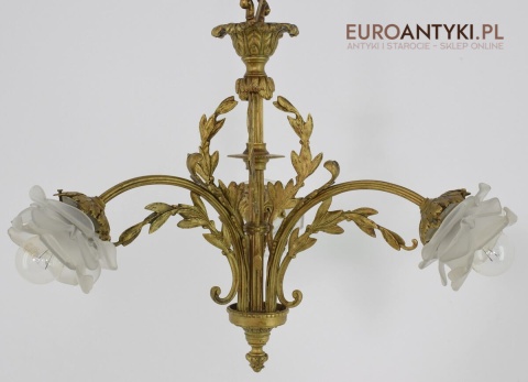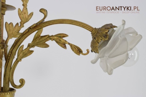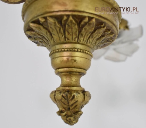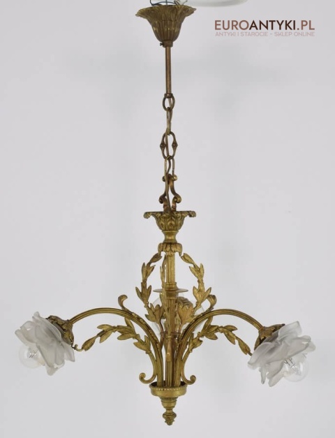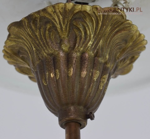 Unikatowy mały żyrandol sprowadzony z Francji, pochodzi z lat 1920-30. Jest wykonany z odlewów z brązu lub mosiądzu. Klosze szklane.