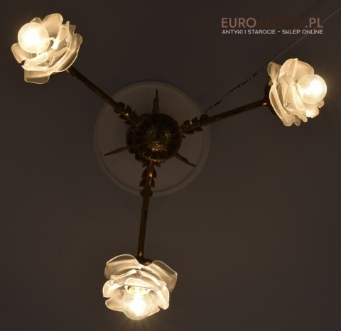 Stan tego trójramiennego żyrandola oceniam na idealny. Brak jakichkolwiek uszkodzeń. Pomimo swojego wielu ta stara lampa zachowała się w bardzo dobrym stanie. Klosze wyglądają jak nowe ponieważ umyliśmy je w zmywarce do naczyń. Elektryka sprawna. Prawdziwy antyk i unikat.