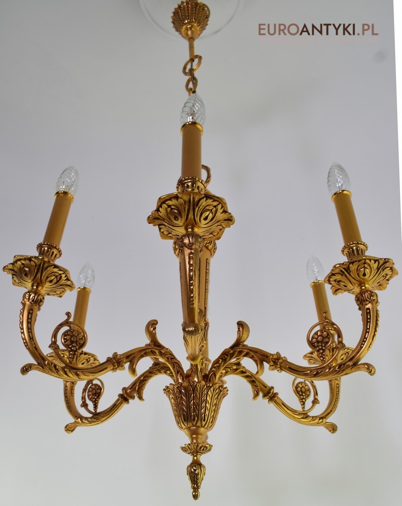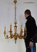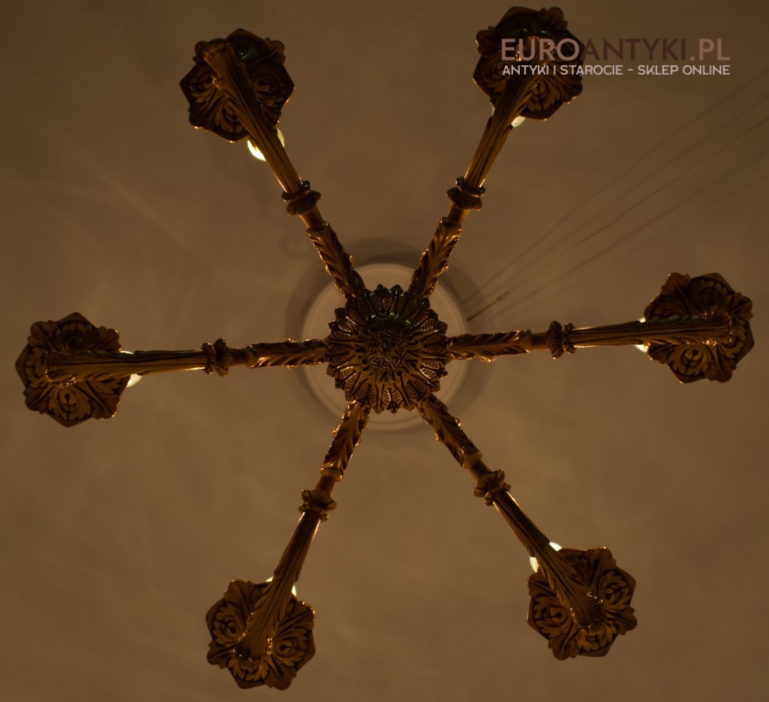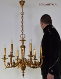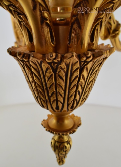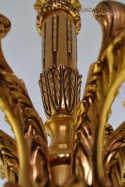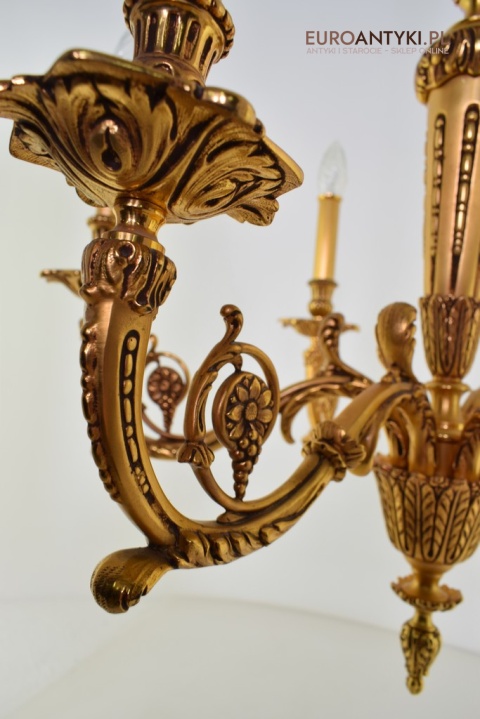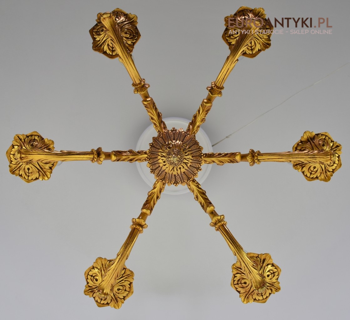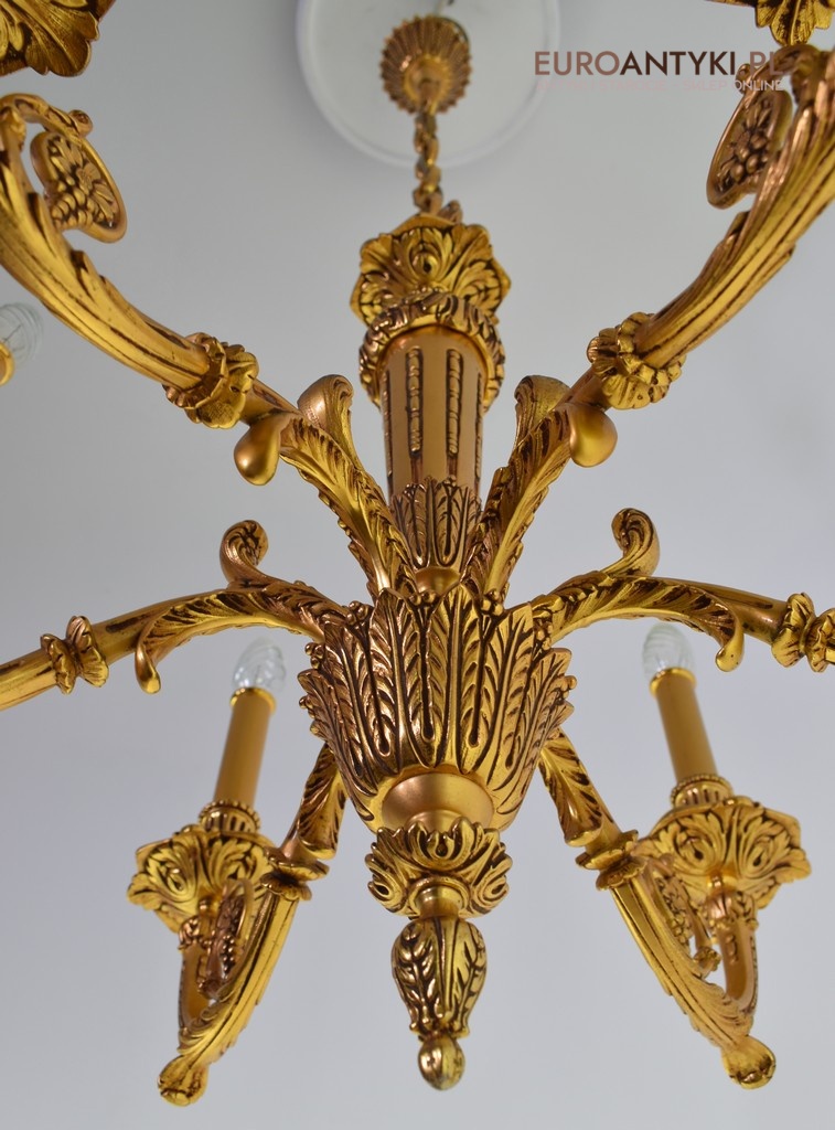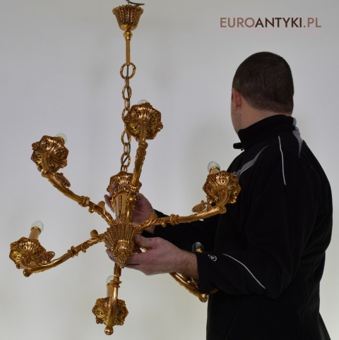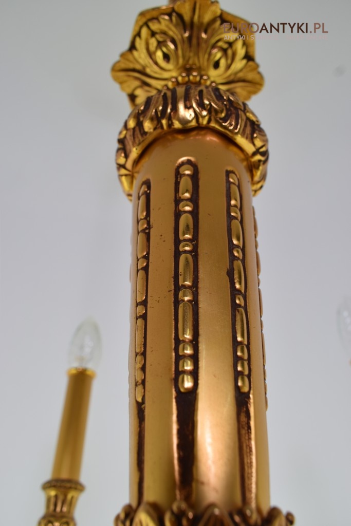 Przedstawiamy wyjątkowy, prawdziwie złocony żyrandol w stylu pałacowym, który zachwyca swoją masywną, misternie zdobioną konstrukcją. Nie jest to zwykły, malowany na złoty kolor egzemplarz, lecz autentyczny pozłacany antyk z połowy XX wieku, sprowadzony prosto z Francji.