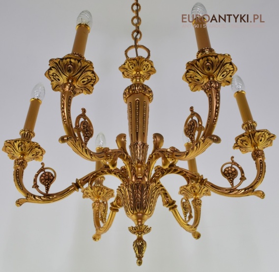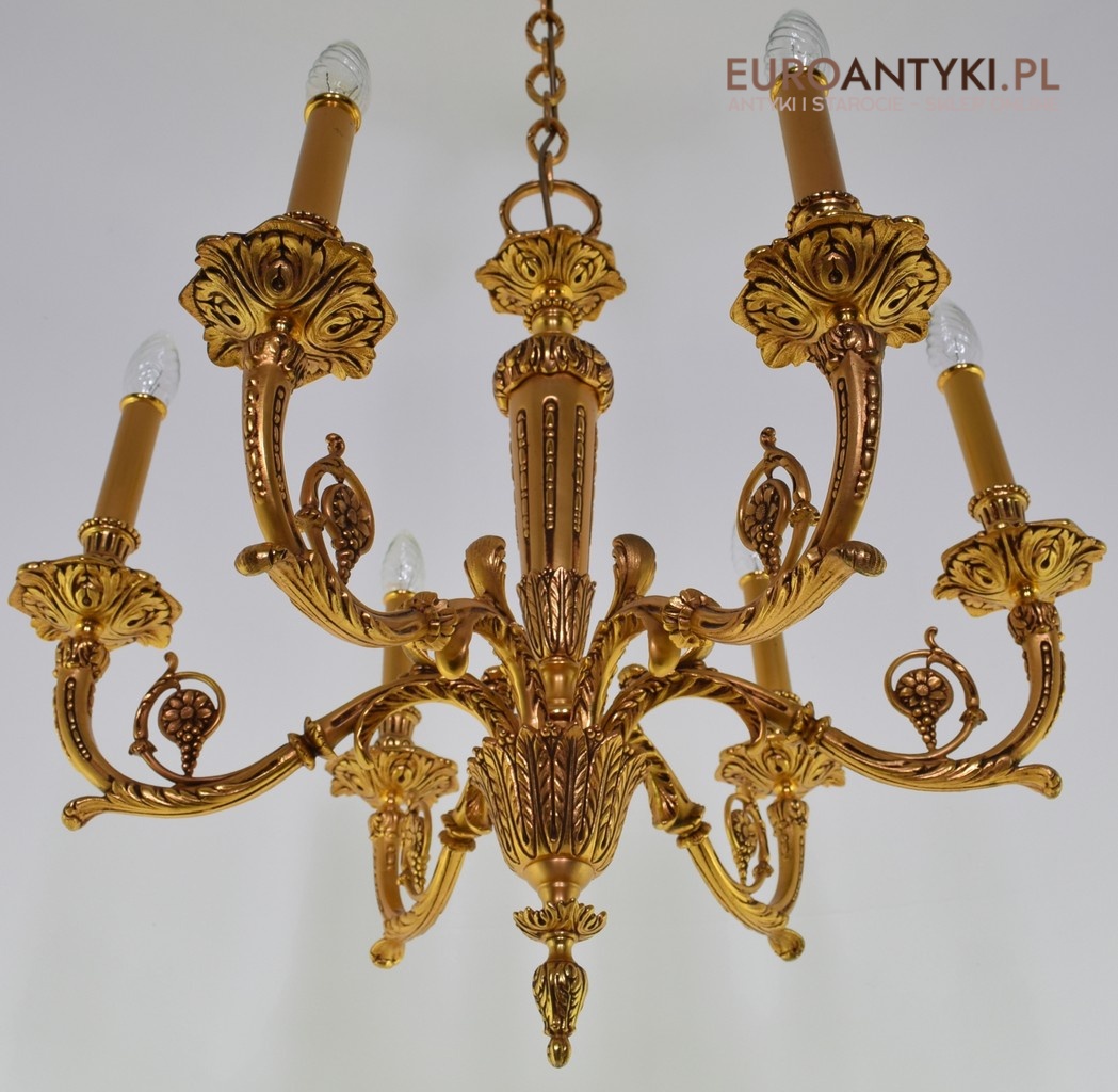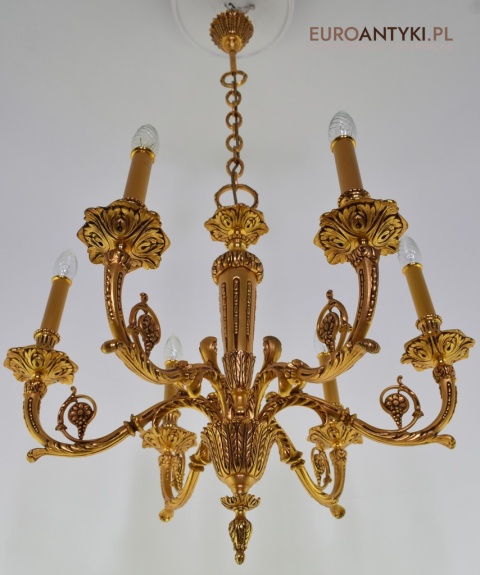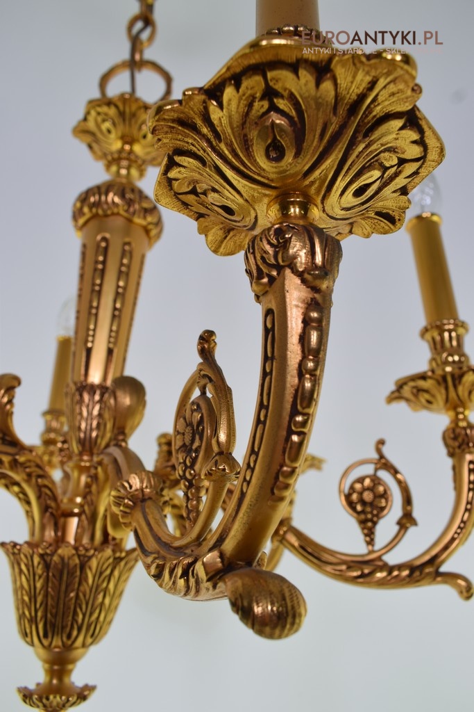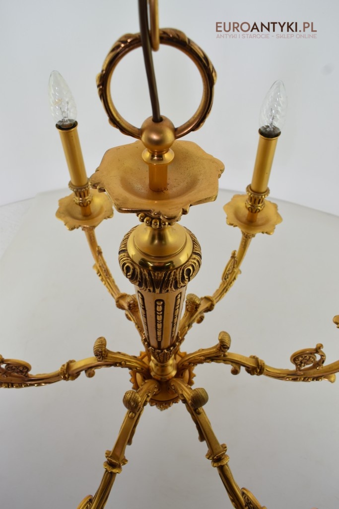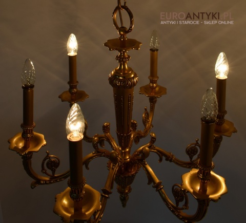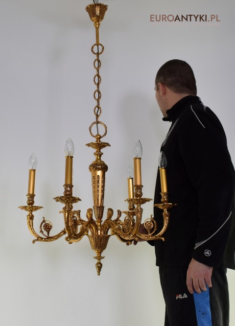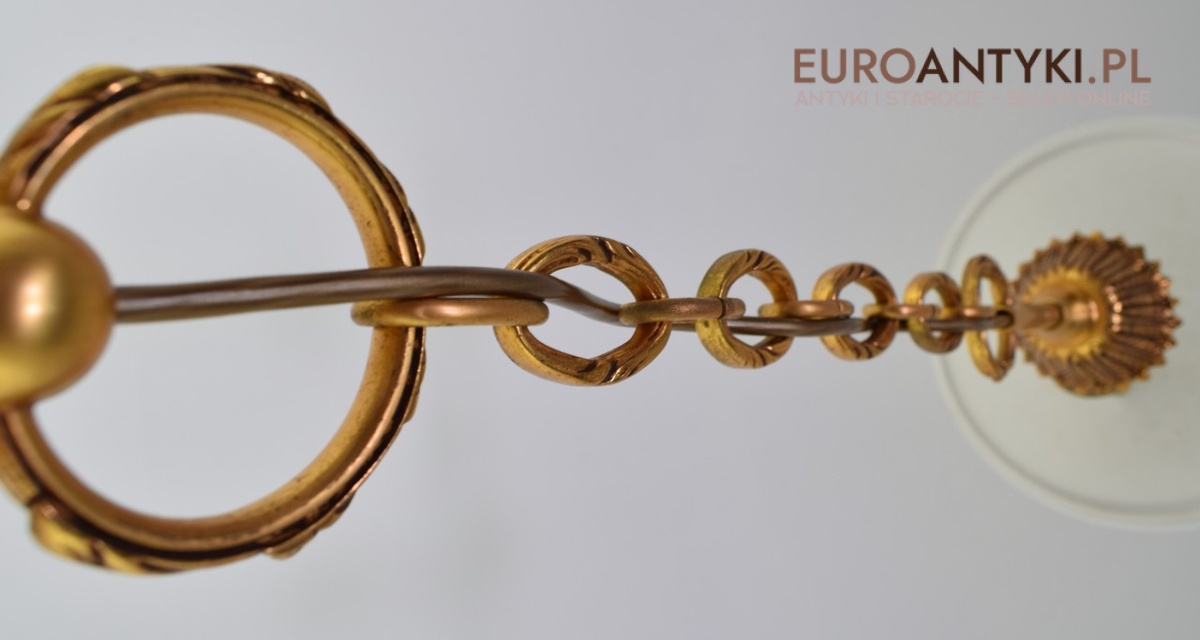 Przedstawiamy wyjątkowy, prawdziwie złocony żyrandol w stylu pałacowym, który zachwyca swoją masywną, misternie zdobioną konstrukcją. Nie jest to zwykły, malowany na złoty kolor egzemplarz, lecz autentyczny pozłacany antyk z połowy XX wieku, sprowadzony prosto z Francji.