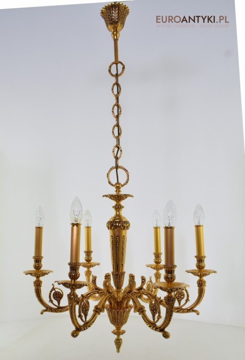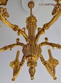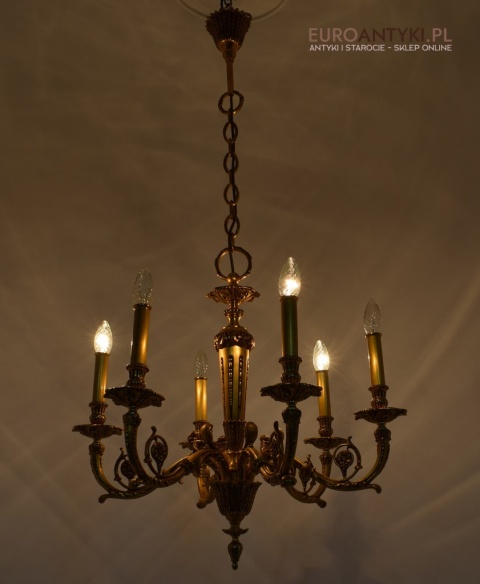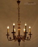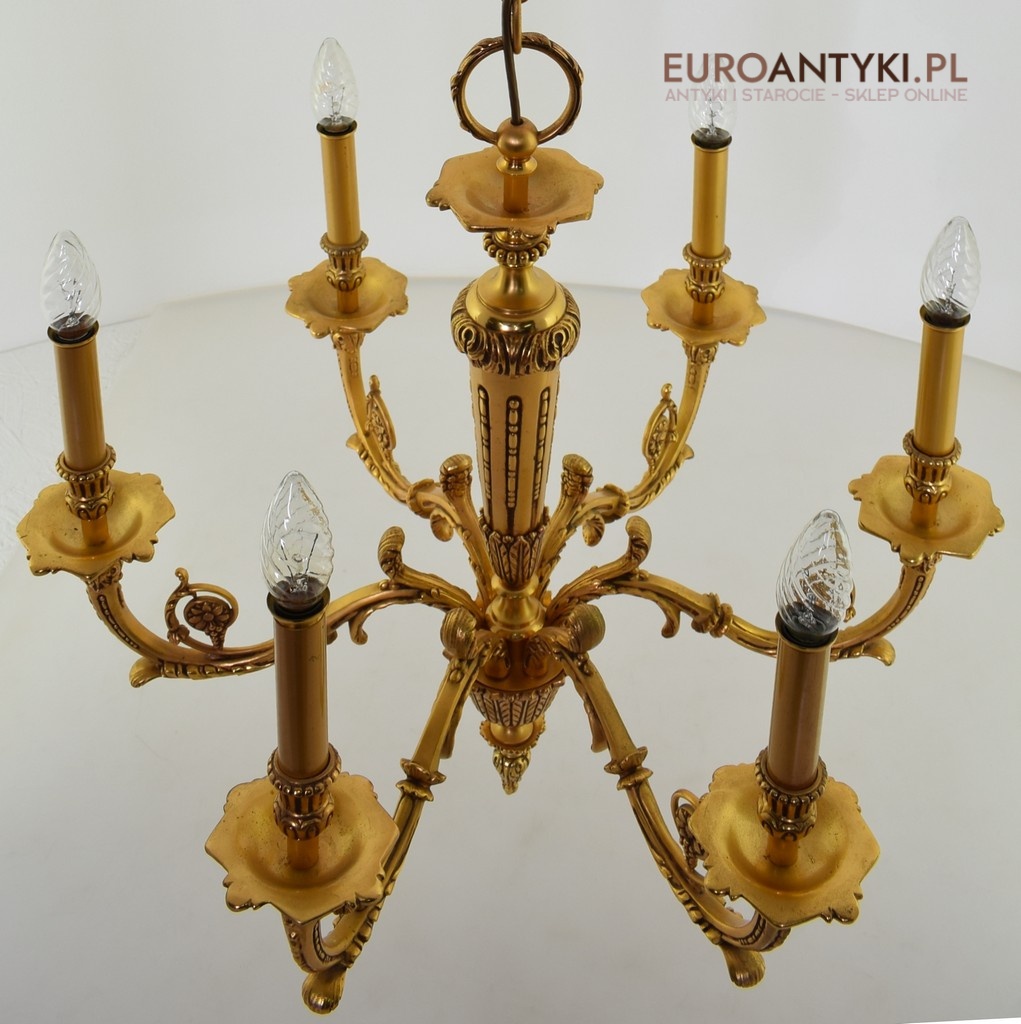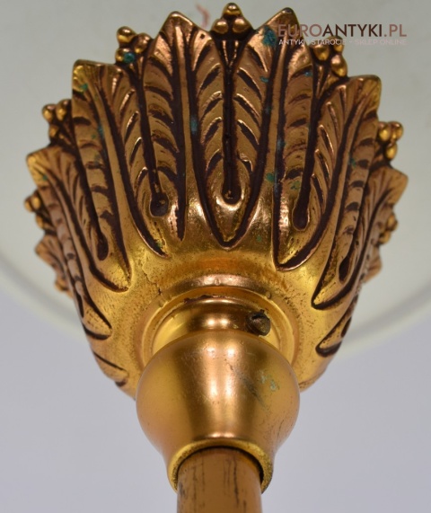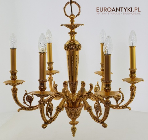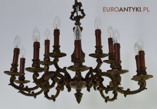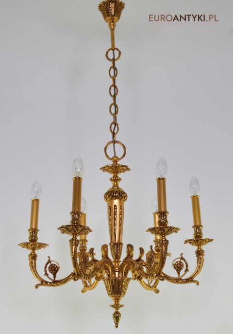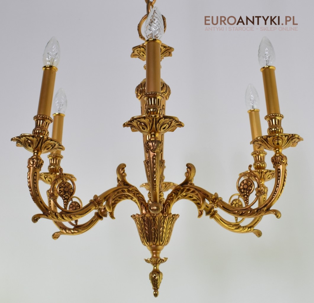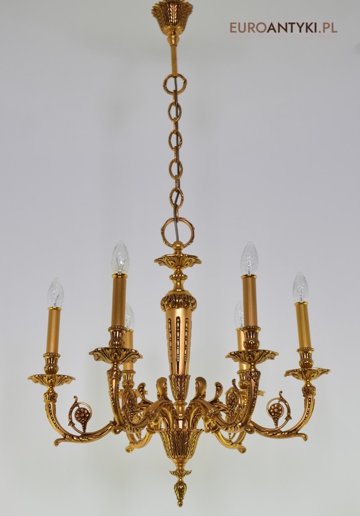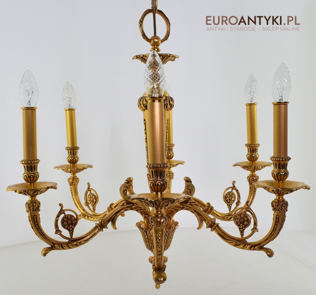 Przedstawiamy wyjątkowy, prawdziwie złocony żyrandol w stylu pałacowym, który zachwyca swoją masywną, misternie zdobioną konstrukcją. Nie jest to zwykły, malowany na złoty kolor egzemplarz, lecz autentyczny pozłacany antyk z połowy XX wieku, sprowadzony prosto z Francji.