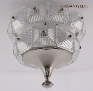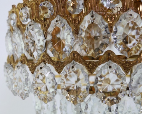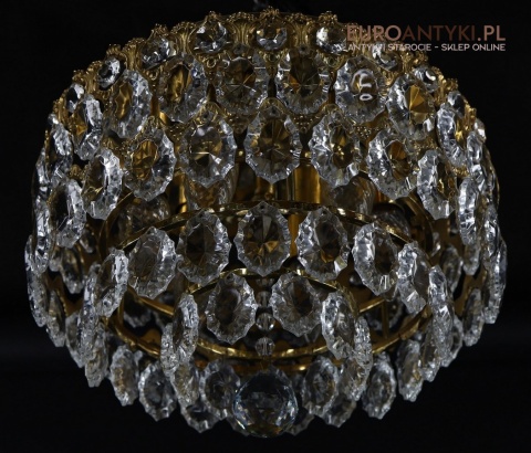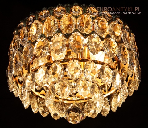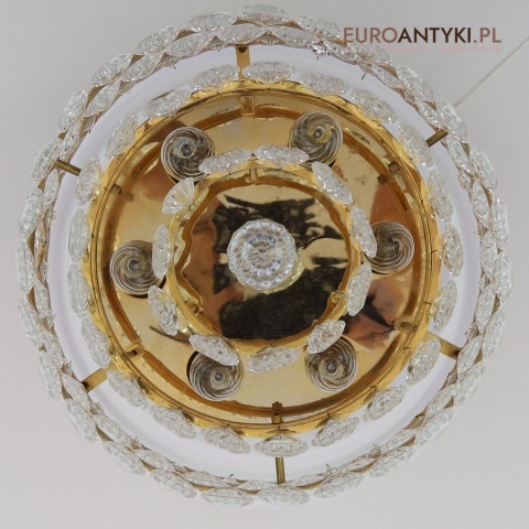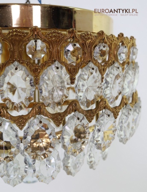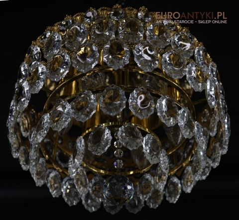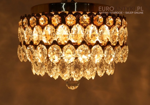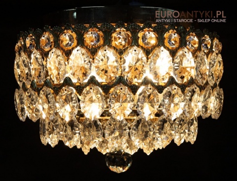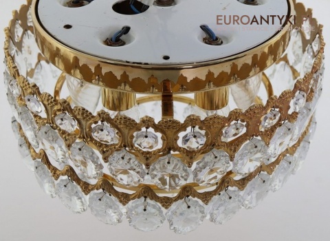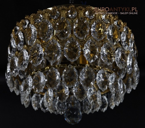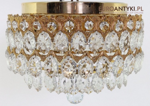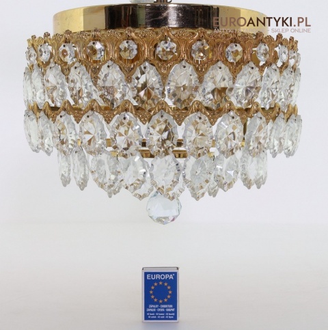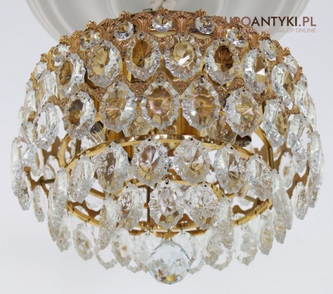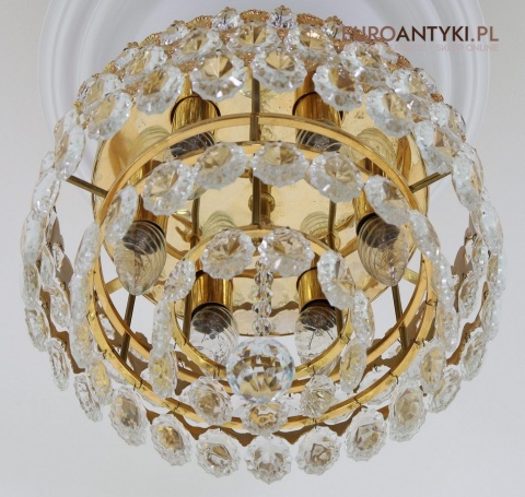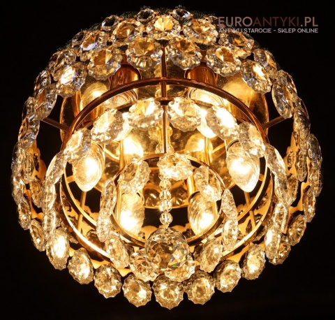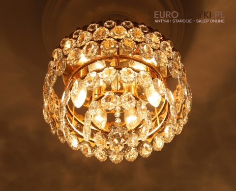 Przedstawiamy mały plafon kryształowy z efektowną kaskadą zawieszek oraz dekoracyjną kryształową kulą u dołu. Ten oryginalny egzemplarz pochodzi z Francji, z około 1970 roku, i łączy w sobie klasyczną elegancję z nutą stylu glamour. Kunsztowne detale w złoconym mosiądzu oraz fasetowane kryształy tworzą niezwykłe efekty świetlne, zwłaszcza w promieniach słońca – czego zdjęcia nie oddają, ale na żywo robi to ogromne wrażenie! 🌞💎