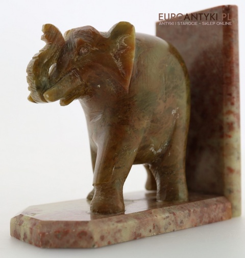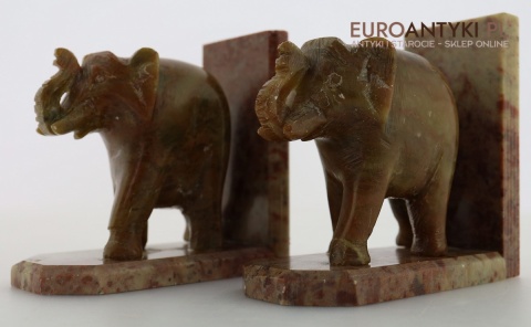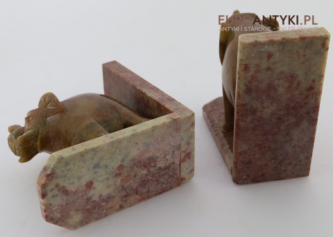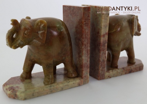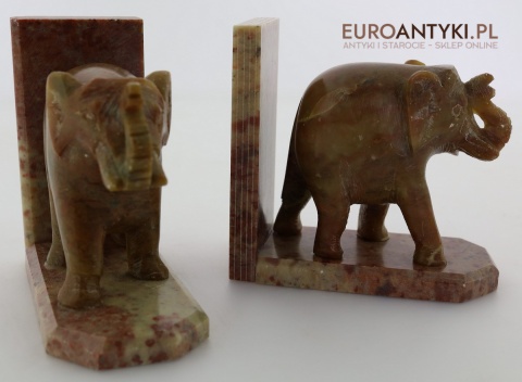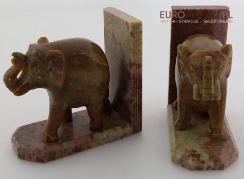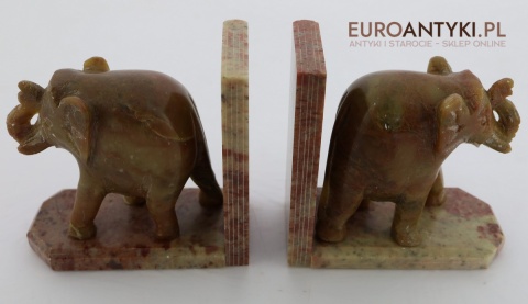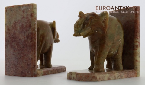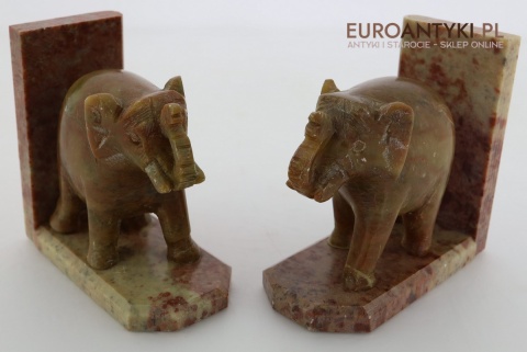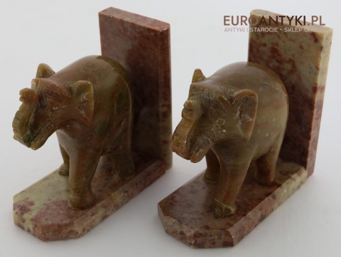 Masywne rzeźbione podpórki do książek ze słoniami – antyczna ozdoba w stylu orientalnym z marmuru, sprowadzona z Francji