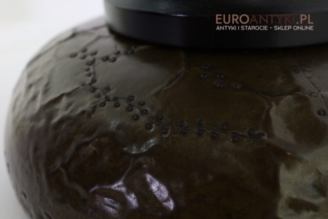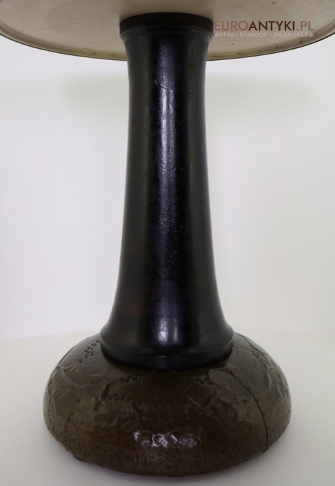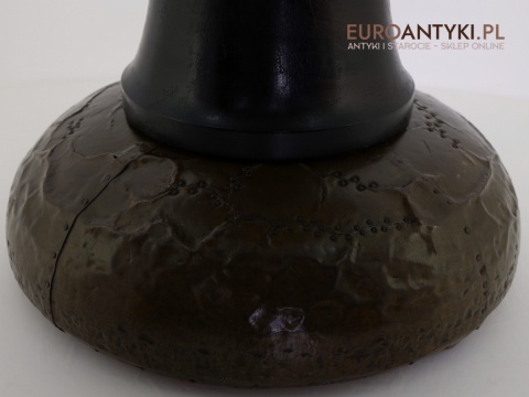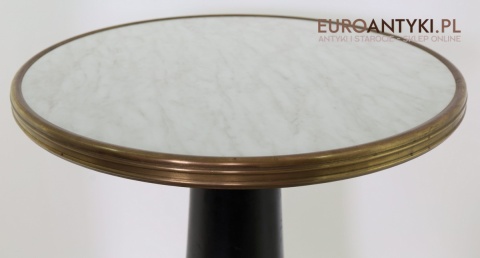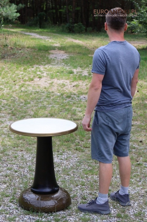Stolik wykonany z litego drewna, a jego masywna stopa została ręcznie obita blachą mosiężną, co nadaje mu unikatowy charakter i stabilność. Blat powstał z bardzo twardego tworzywa imitującego marmur, wykończony mosiężnym pierścieniem wokół krawędzi. Dziś takie solidne i rzemieślnicze wykonanie jest rzadkością – w przeszłości było oznaką jakości i prestiżu.