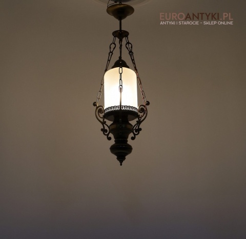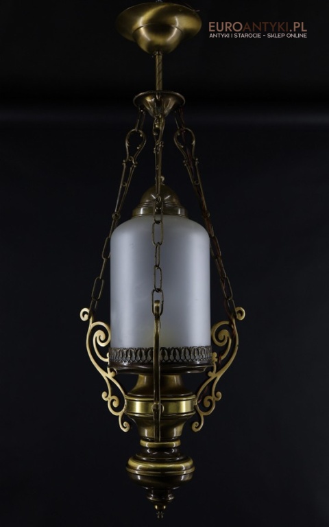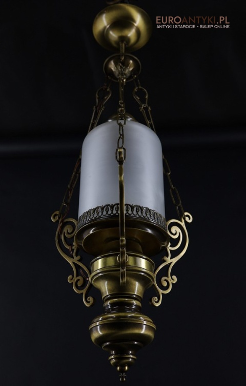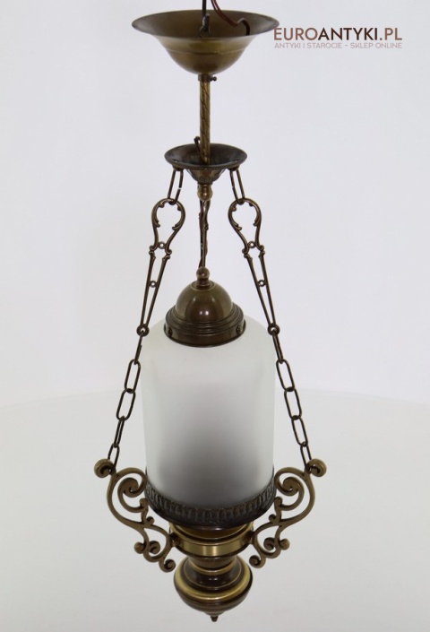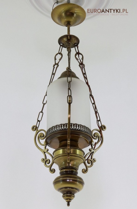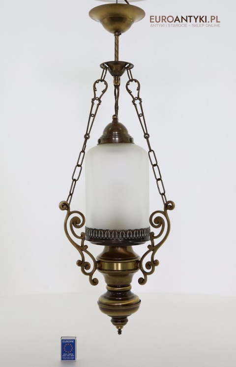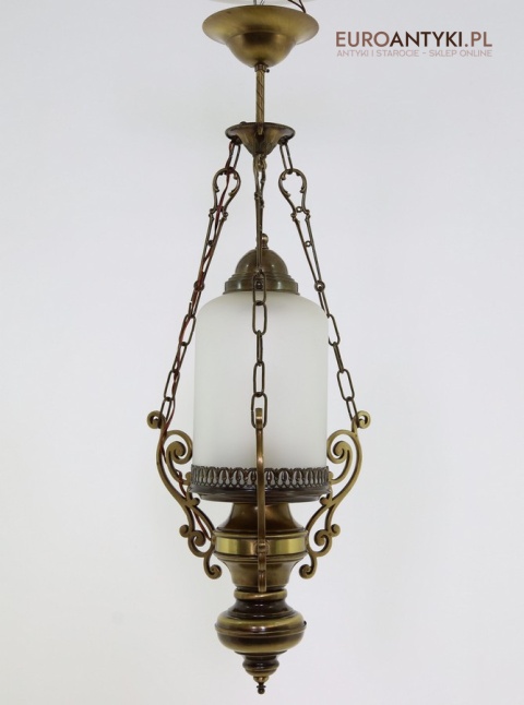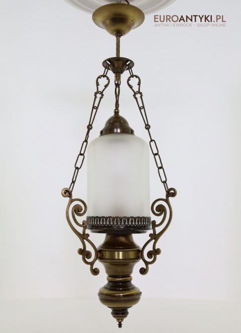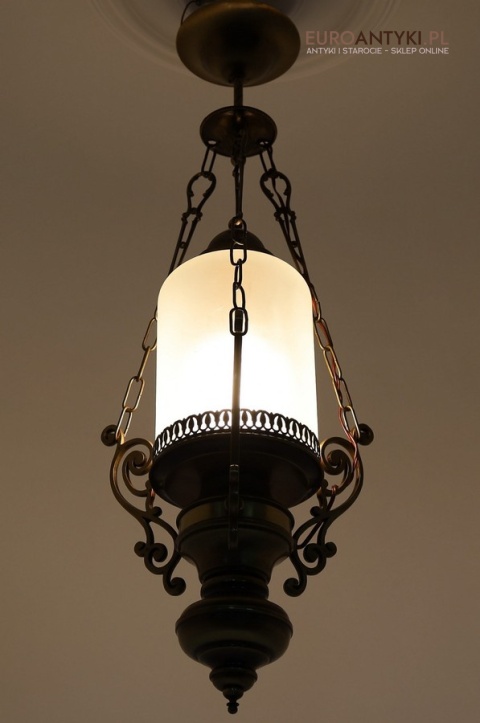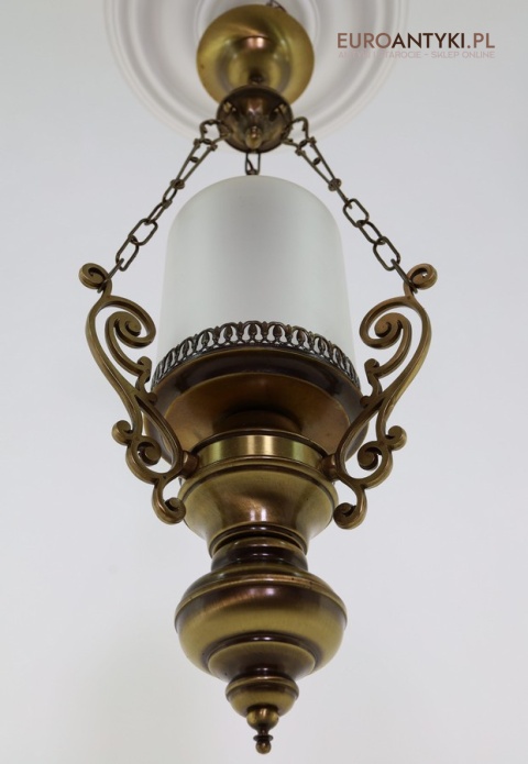 Przedstawiamy oryginalną, mosiężną lampę sufitową, pochodzącą z końca XX wieku (ok. 1970 roku). Ten antyczny model charakteryzuje się solidnym wykonaniem, pięknymi, kutymi zdobieniami oraz szklanym matowym cylindrycznym kloszem, który rozprasza światło w sposób subtelny i nastrojowy.