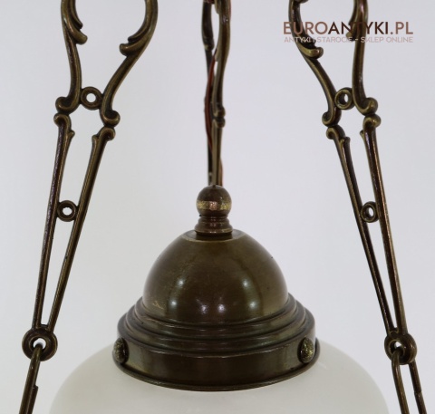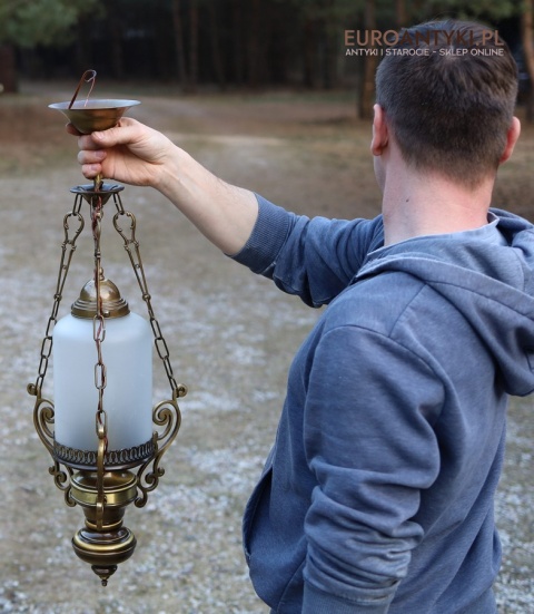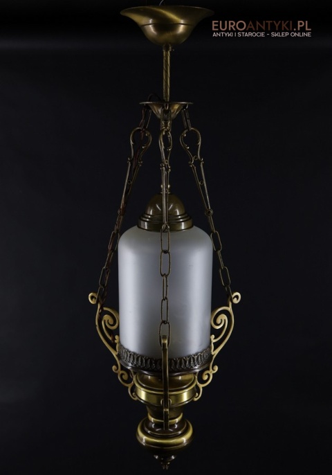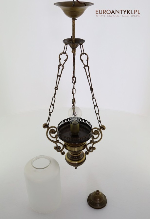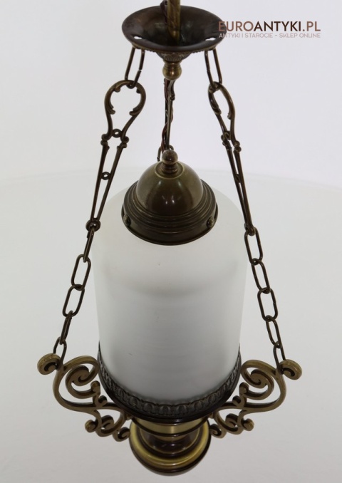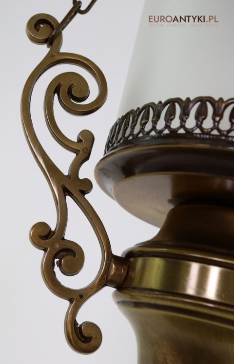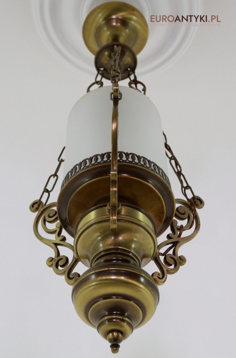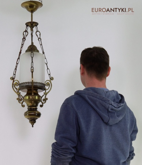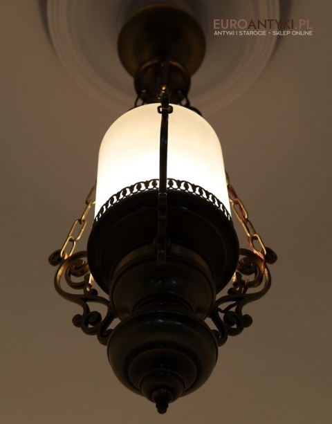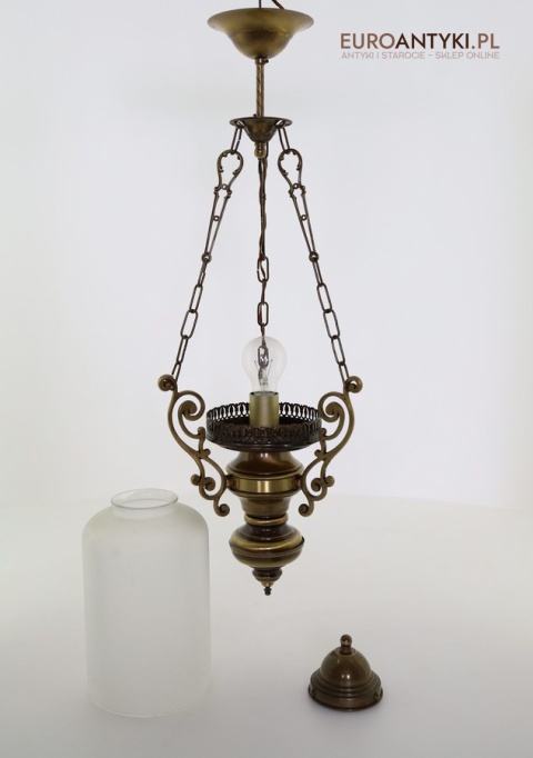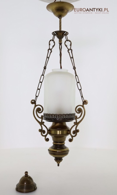 Przedstawiamy oryginalną, mosiężną lampę sufitową, pochodzącą z końca XX wieku (ok. 1970 roku). Ten antyczny model charakteryzuje się solidnym wykonaniem, pięknymi, kutymi zdobieniami oraz szklanym matowym cylindrycznym kloszem, który rozprasza światło w sposób subtelny i nastrojowy.