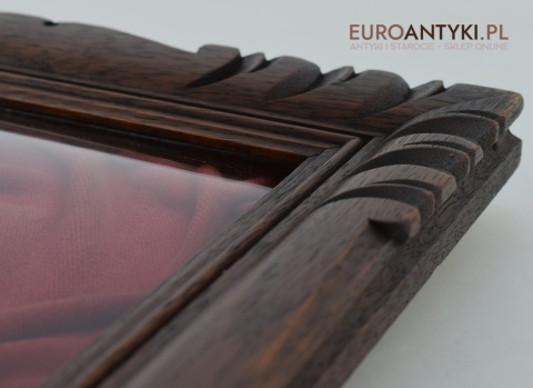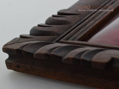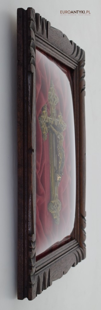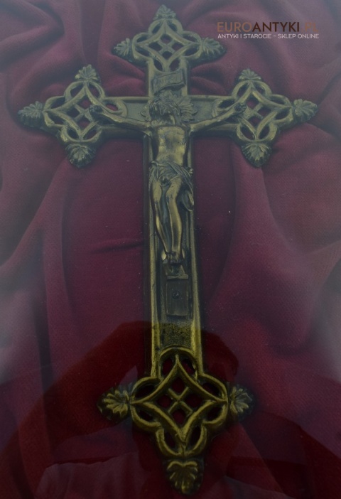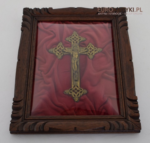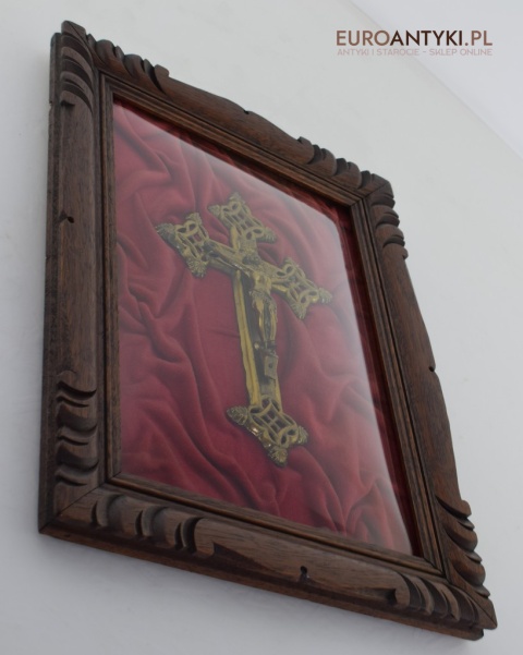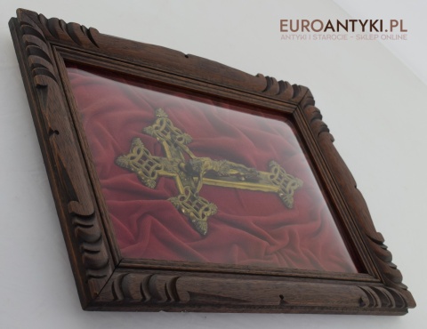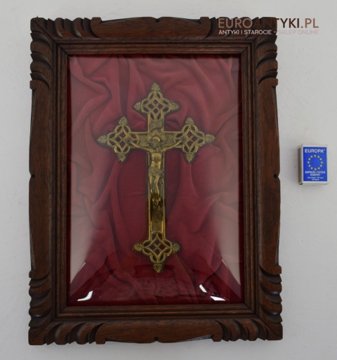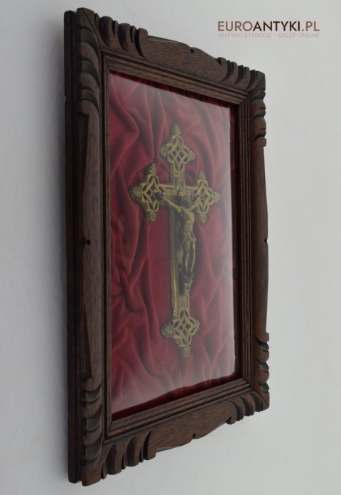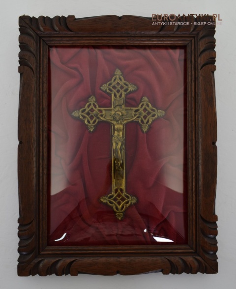Prezentujemy wyjątkowy, mosiężny krzyż sakralny osadzony w ciemnych, dębowych ramach, które zostały ręcznie rzeźbione, dodając wyjątkowej wartości i charakteru temu sakralnemu artefaktowi. Krzyż ten pochodzi z początku XX wieku i został starannie sprowadzony z Francji, zachowany w bardzo dobrym stanie.