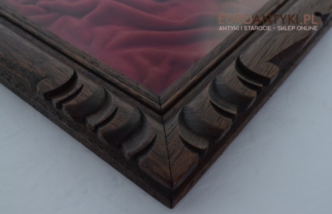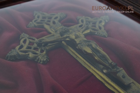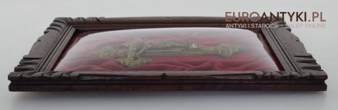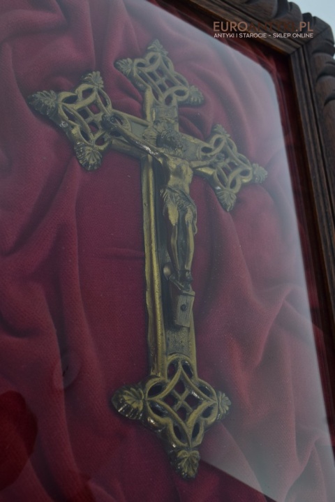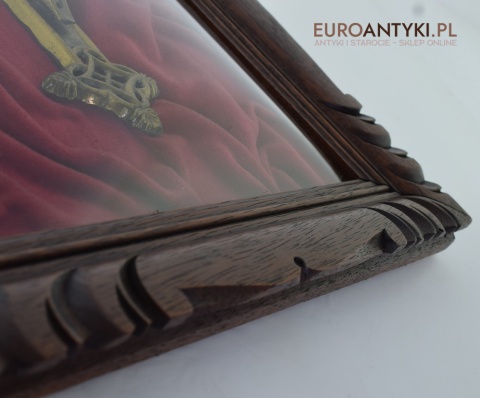 Obraz ten jest wyjątkowo prezentacyjny dzięki wypukłemu szkłu, które ochronnie zakrywa krzyż ułożony na tekstylnym materiale, co dodatkowo podkreśla jego mistyczną i uroczystą naturę. Jest to idealny przedmiot zarówno do wystawienia w kościele, jak i jako wyjątkowy element dekoracyjny w domu.