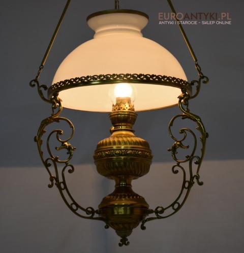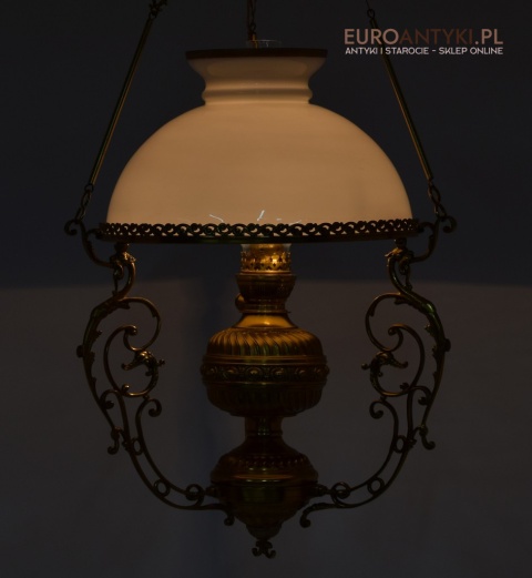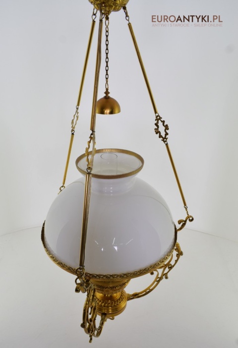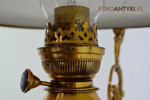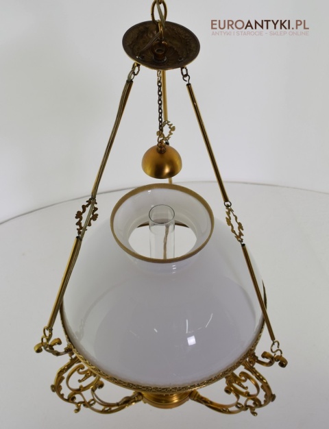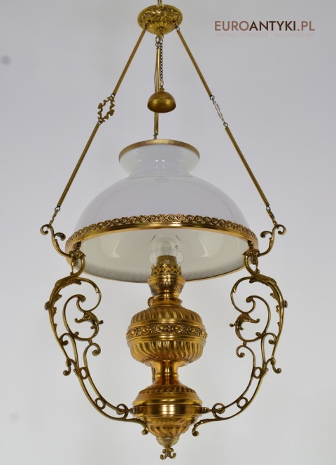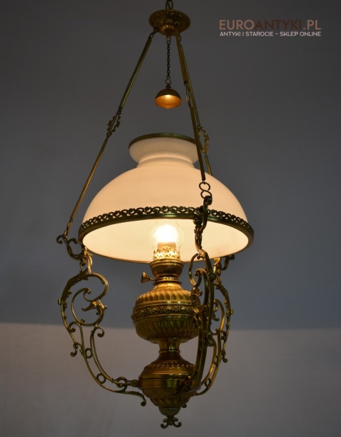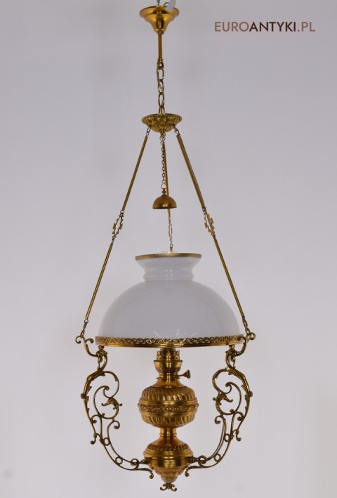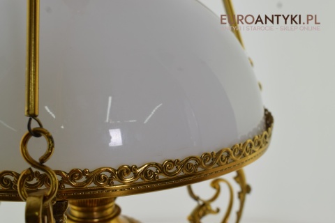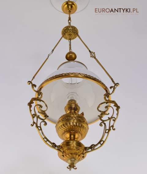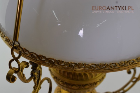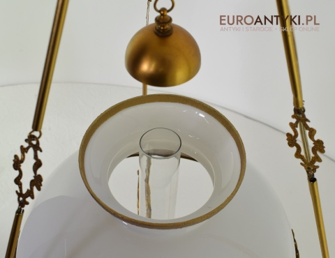 Sprowadzona z Francji. Wykonana z mosiądzu + szklany mleczny klosz i szklany komin - w idealnym stanie.