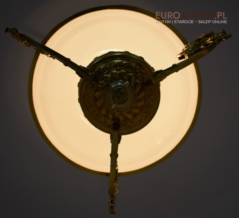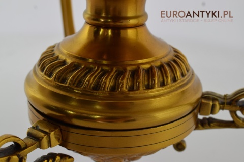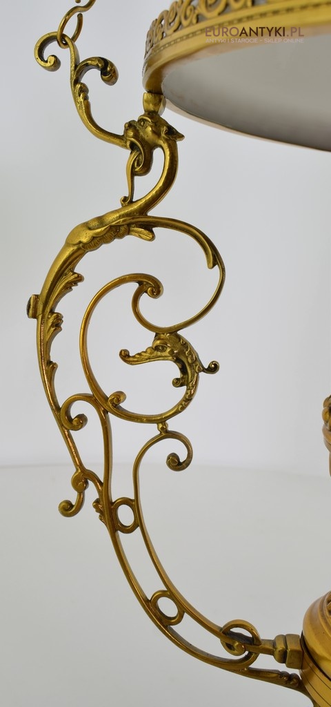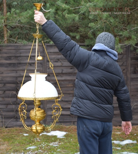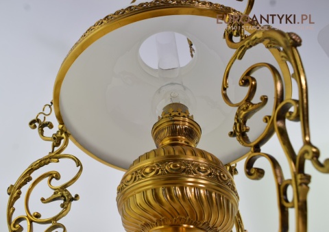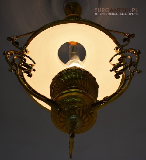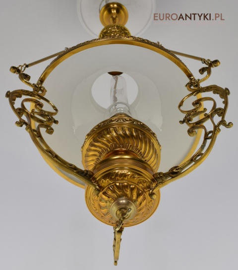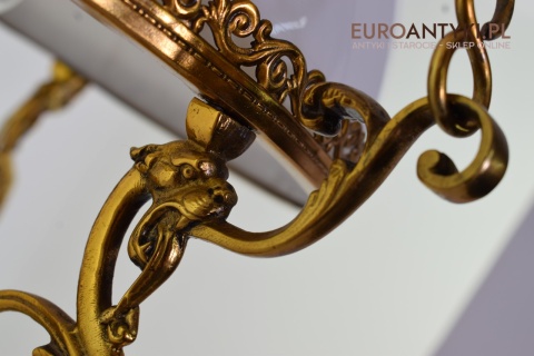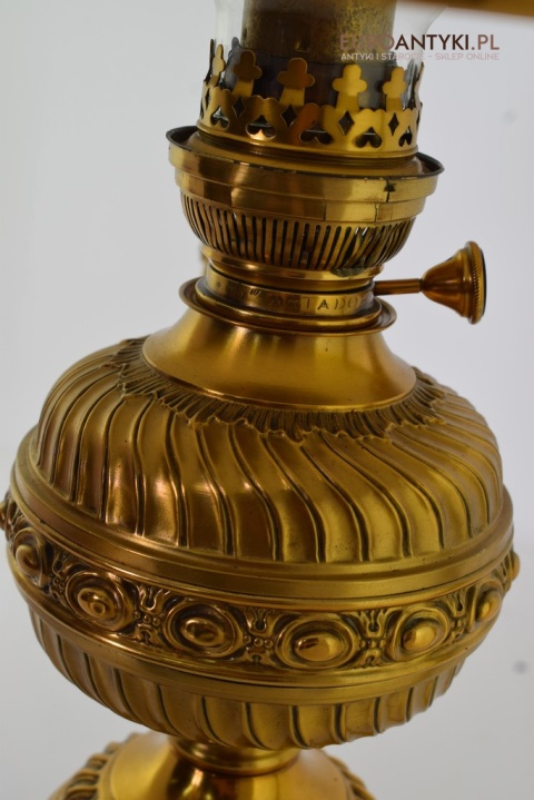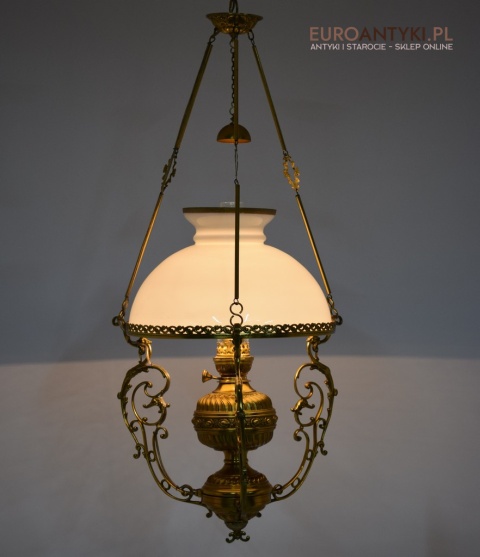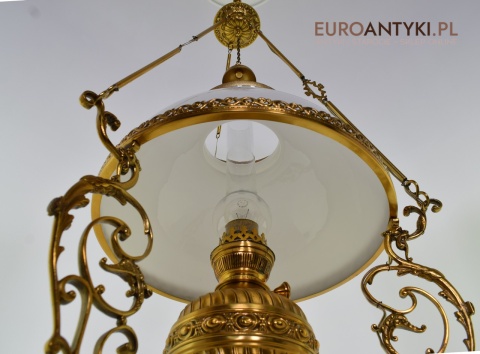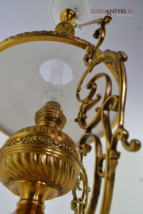 Sprowadzona z Francji. Wykonana z mosiądzu + szklany mleczny klosz i szklany komin - w idealnym stanie.