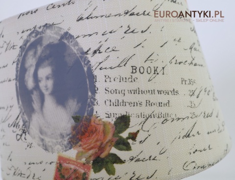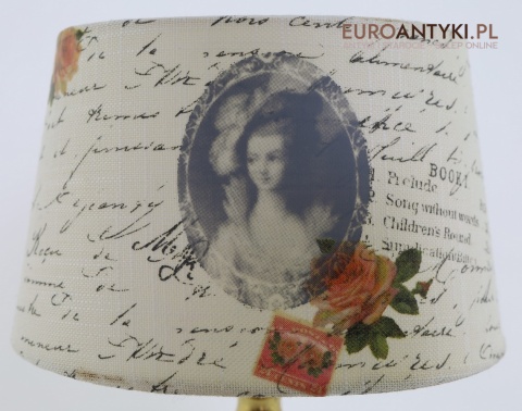 Lampa utrzymana jest w romantycznym stylu retro, charakterystycznym dla lat 70. XX wieku. Abażur zdobi wizerunek kobiety przypominający XVIII-wieczny portret w stylu francuskiego rokoka, z dodatkiem nadruku listów, róż i znaczków. Ten rodzaj zdobnictwa był popularny we wnętrzach stylizowanych na epokę Ludwika XV – dziś idealnie sprawdzi się w sypialni, salonie, biblioteczce lub przestrzeni shabby chic.