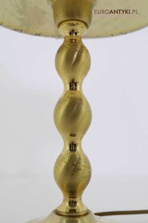 Podstawa wykonana jest z mosiądzu, materiału niezwykle trwałego i szlachetnego, który z czasem pokrywa się naturalną patyną, cenioną przez kolekcjonerów i dekoratorów wnętrz. Dziś mosiądz jest rzadko stosowany ze względu na wysokie koszty – to produkt z duszą i historią. Abażur materiałowy, w doskonałym stanie – bez przetarć, plam czy przebarwień.