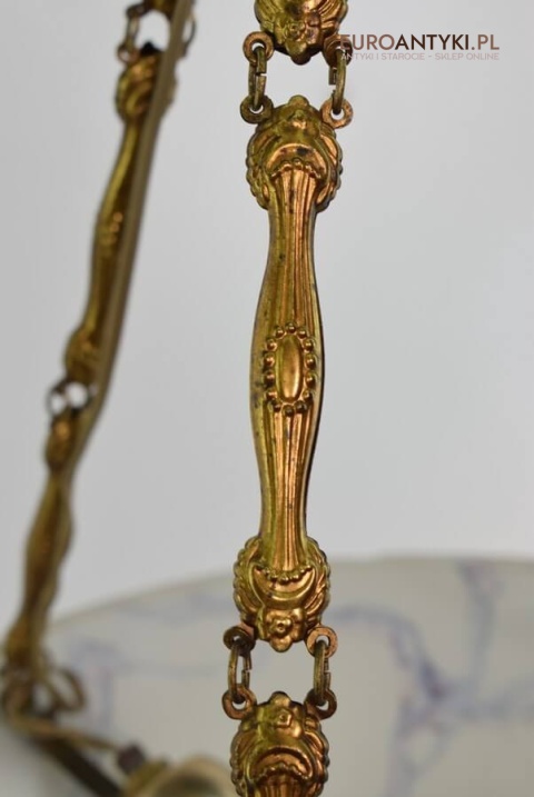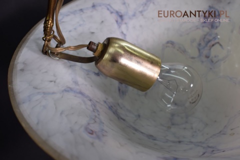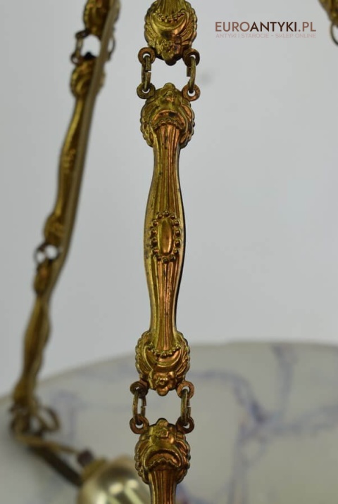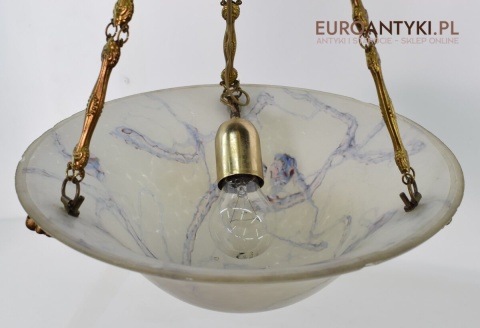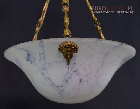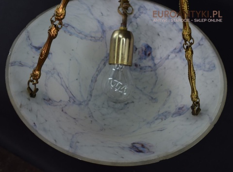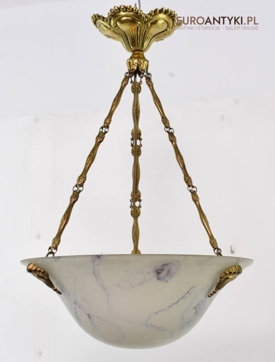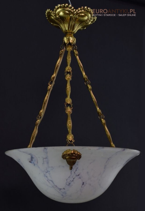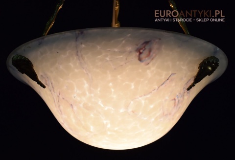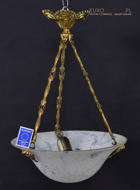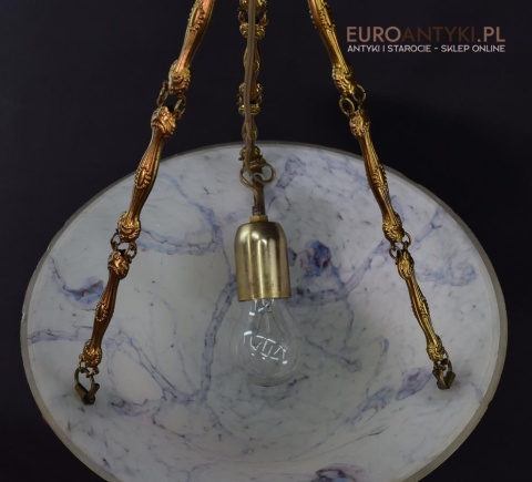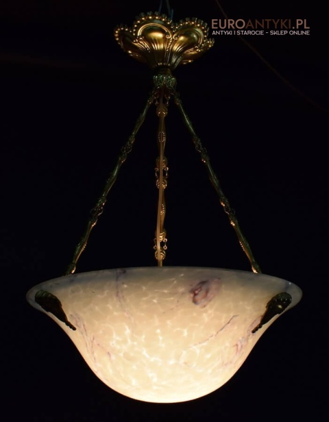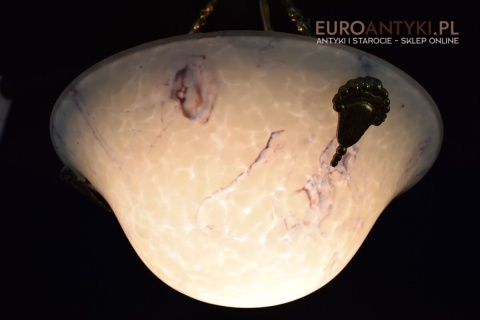 100% oryginalna ampla jest z lat 1900-20, pochodzi z epoki secesyjnej / art deco. Prawdziwa lampa rarytas - dla znawców antyków i koneserów to unikat. Zabytkową lampę sprowadziliśmy z Francji. Łańcuchy i rozeta podsufitowa wykonane z mosiądzu. Proszę zwrócić uwagę na piękną i precyzyjna robociznę z jaką został wykonany ten zabytek. Oryginalny szklany klosz Murano zachował się w bardzo dobrym stanie. Na samej gorze po rancie ma kilka delikatnych odprysków, ale to trzeba przyglądać się z bardzo bliska aby je zobaczyć. Jeżeli lampa jest podwieszona na suficie te delikatne odpryski szkła nie są widoczne.