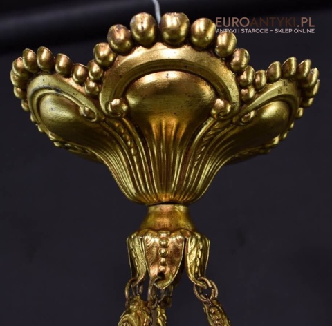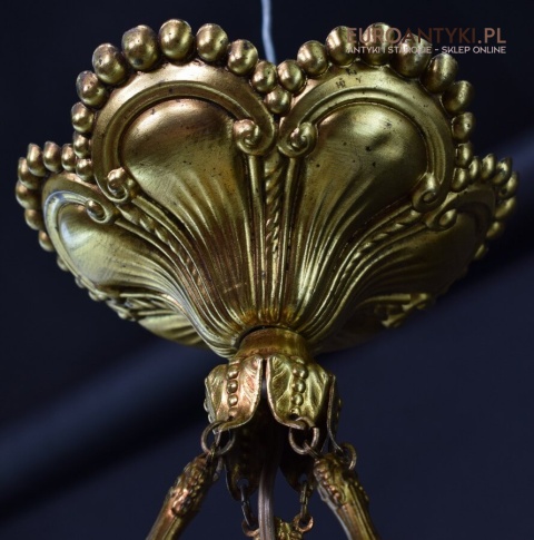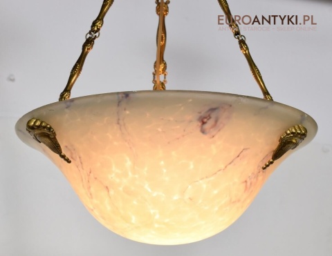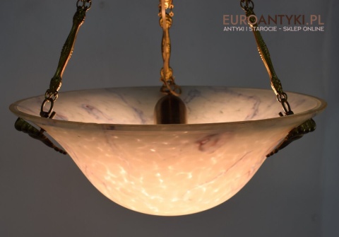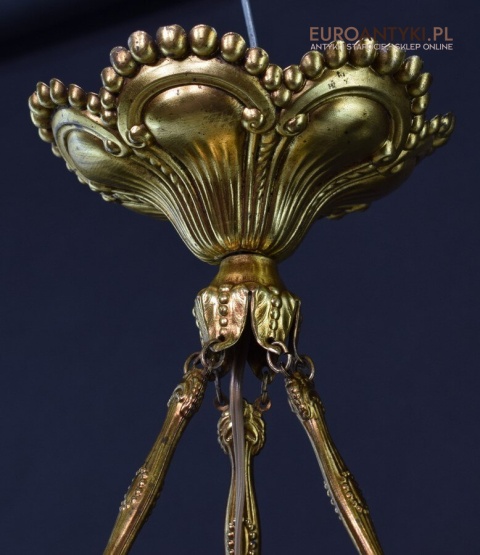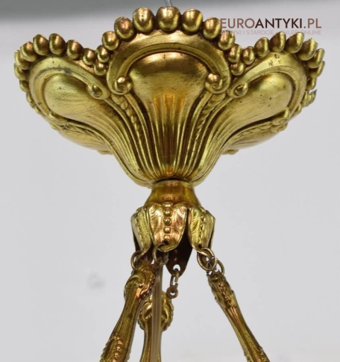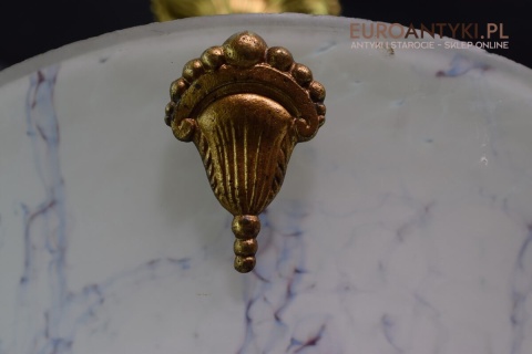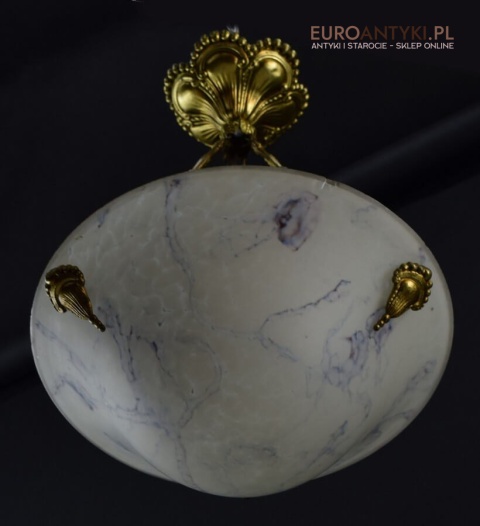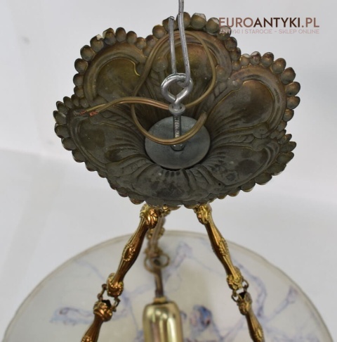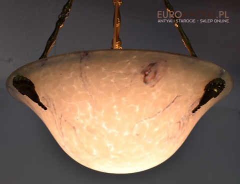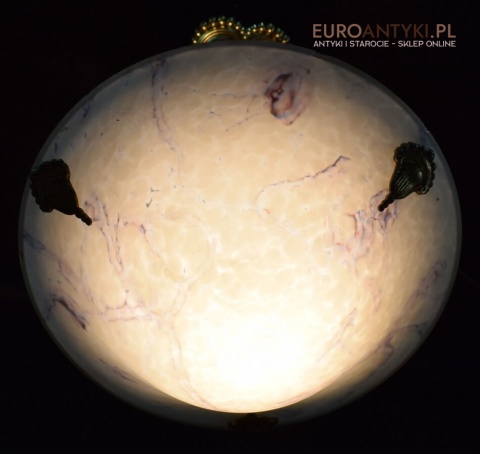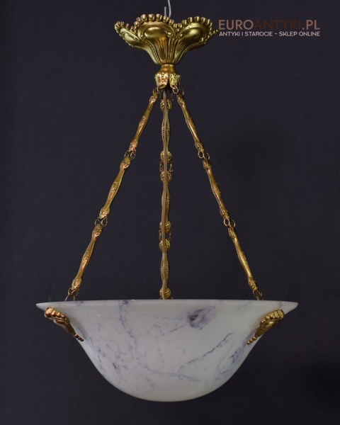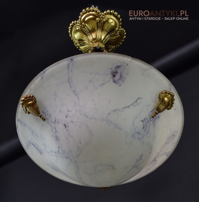 100% oryginalna ampla jest z lat 1900-20, pochodzi z epoki secesyjnej / art deco. Prawdziwa lampa rarytas - dla znawców antyków i koneserów to unikat. Zabytkową lampę sprowadziliśmy z Francji. Łańcuchy i rozeta podsufitowa wykonane z mosiądzu. Proszę zwrócić uwagę na piękną i precyzyjna robociznę z jaką został wykonany ten zabytek. Oryginalny szklany klosz Murano zachował się w bardzo dobrym stanie. Na samej gorze po rancie ma kilka delikatnych odprysków, ale to trzeba przyglądać się z bardzo bliska aby je zobaczyć. Jeżeli lampa jest podwieszona na suficie te delikatne odpryski szkła nie są widoczne.